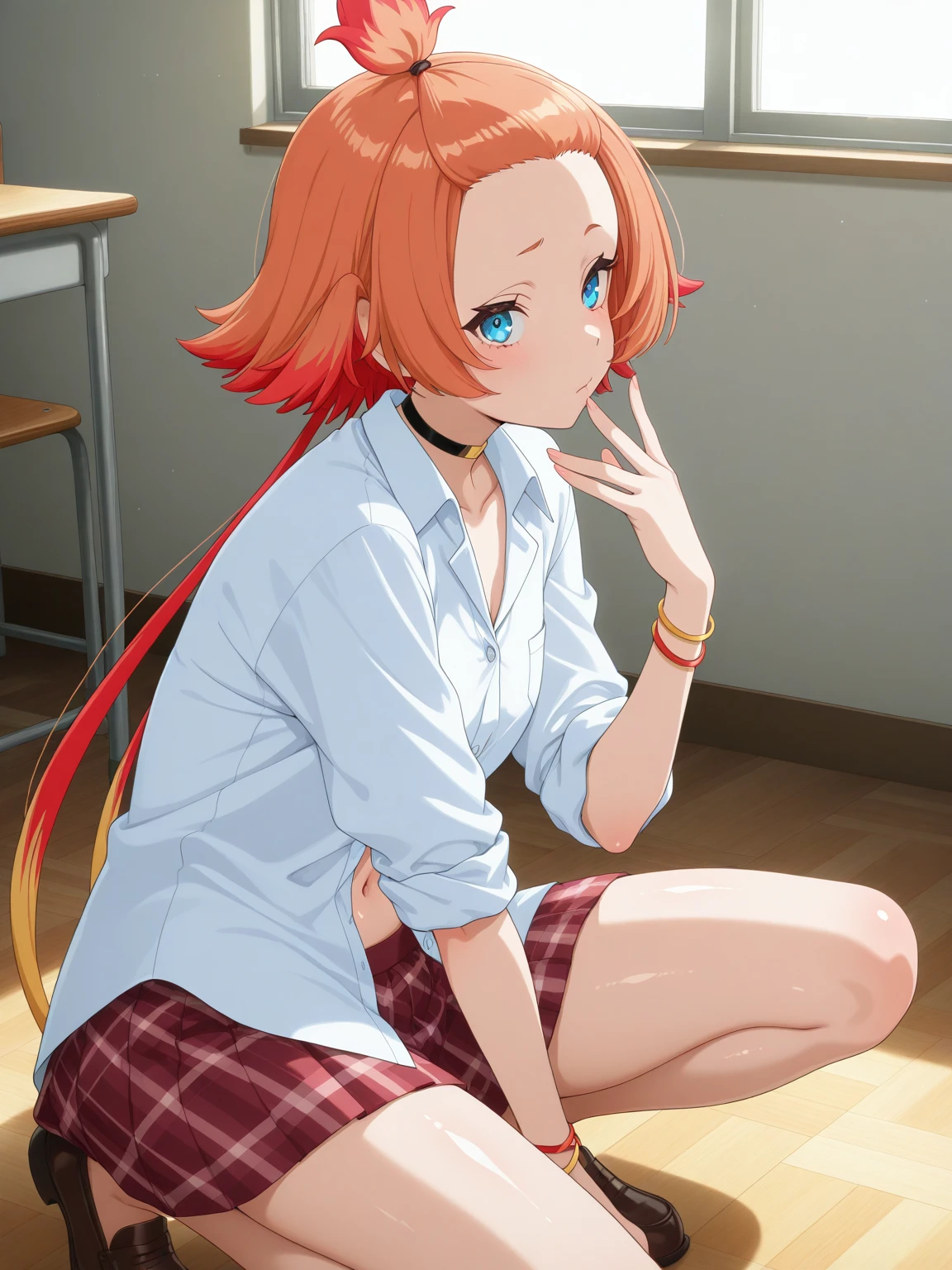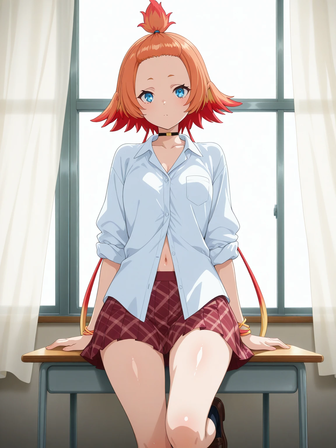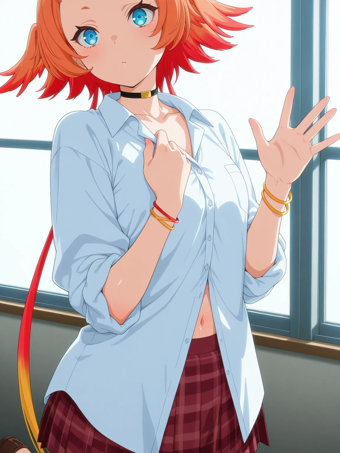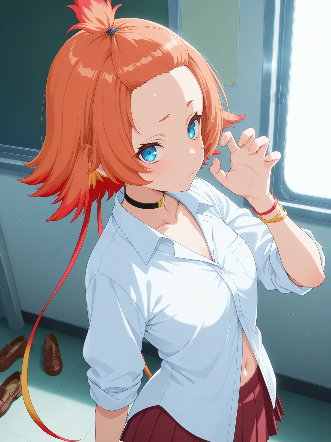 Clothes: school uniform, white collared shirt, sleeves rolled up, untucked shirt, navel, pleated skirt, loafers, bracelets, (no socks), choker