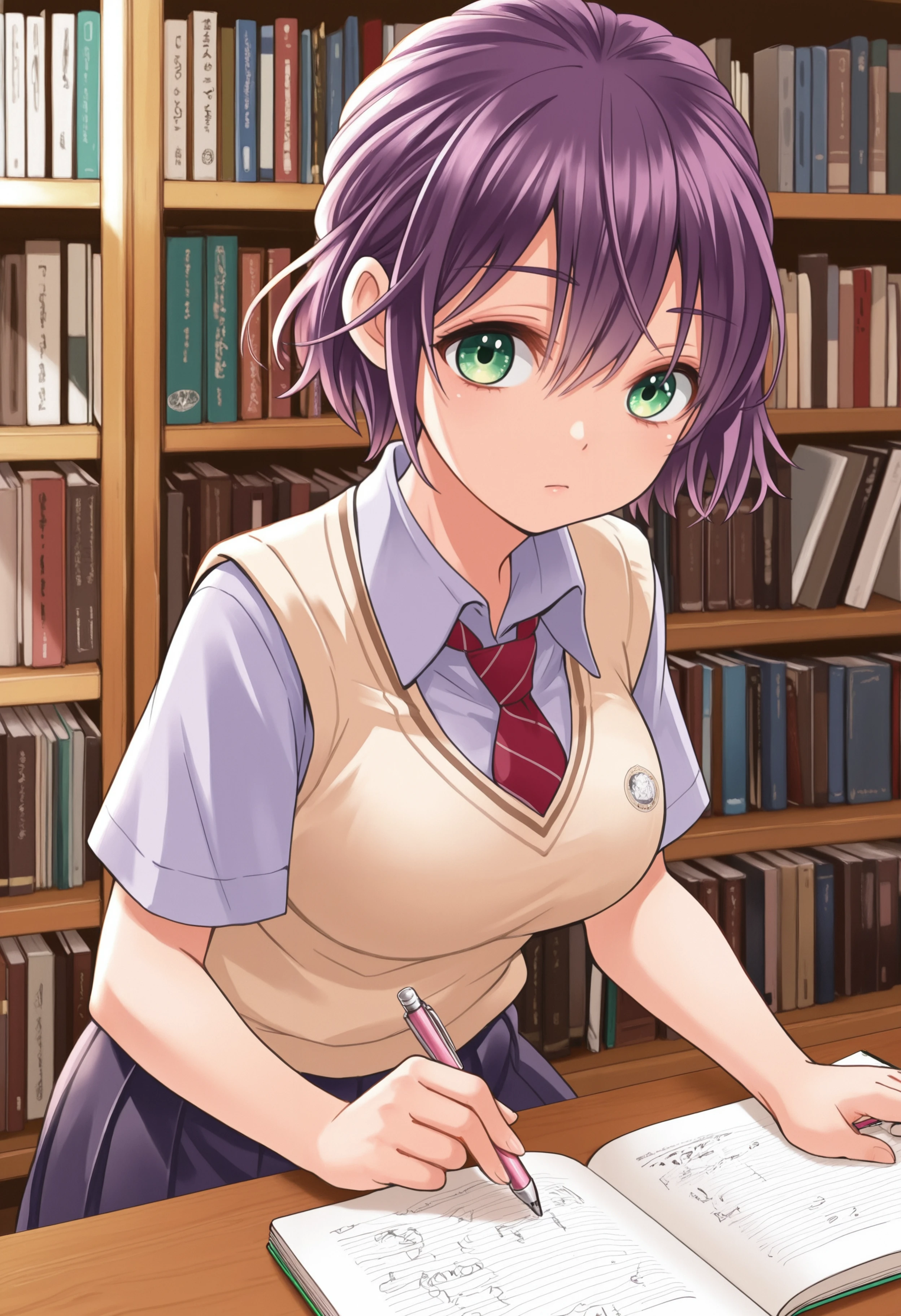 kakkoumanga_hiro, green eyes, purple hair, long hair, low side ponytail, sidelocks, glasses,