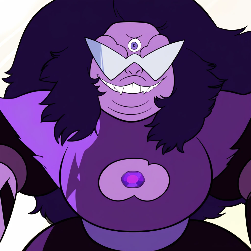 sugilite, purple skin, plump lips, thick brow, visor, forehead eye, purple hair, big hair, long hair, messy hair, sugilite bodysuit, cleavage cutout, chest gem,