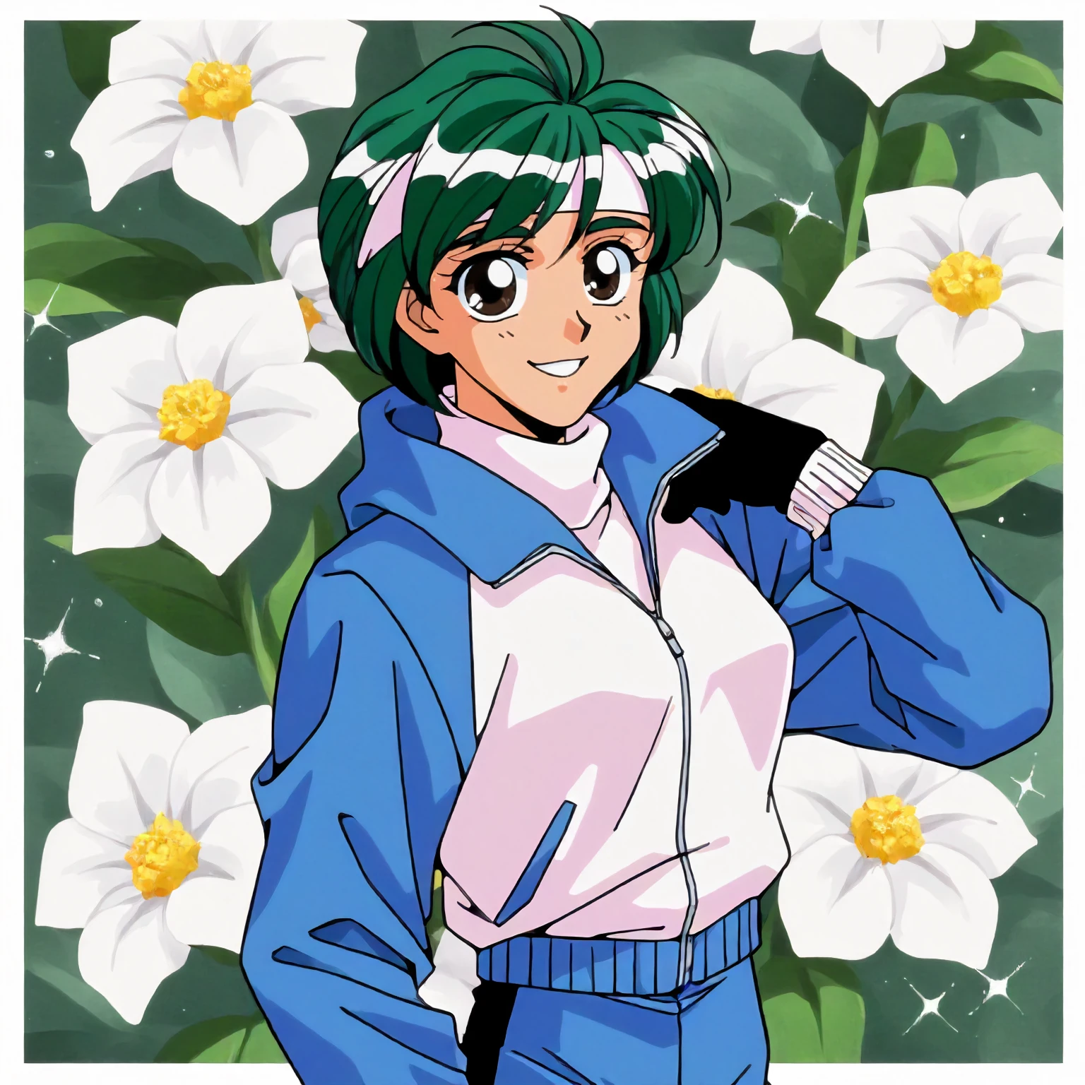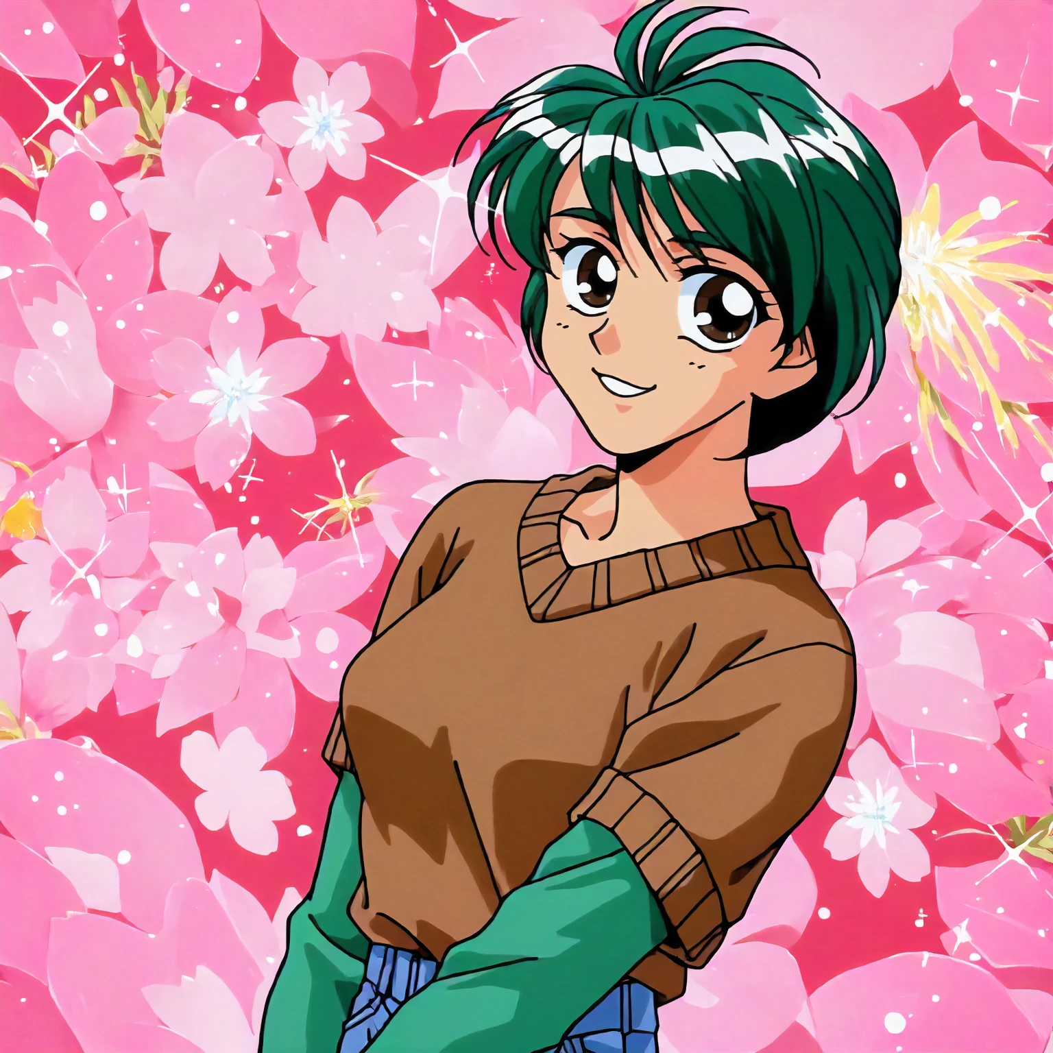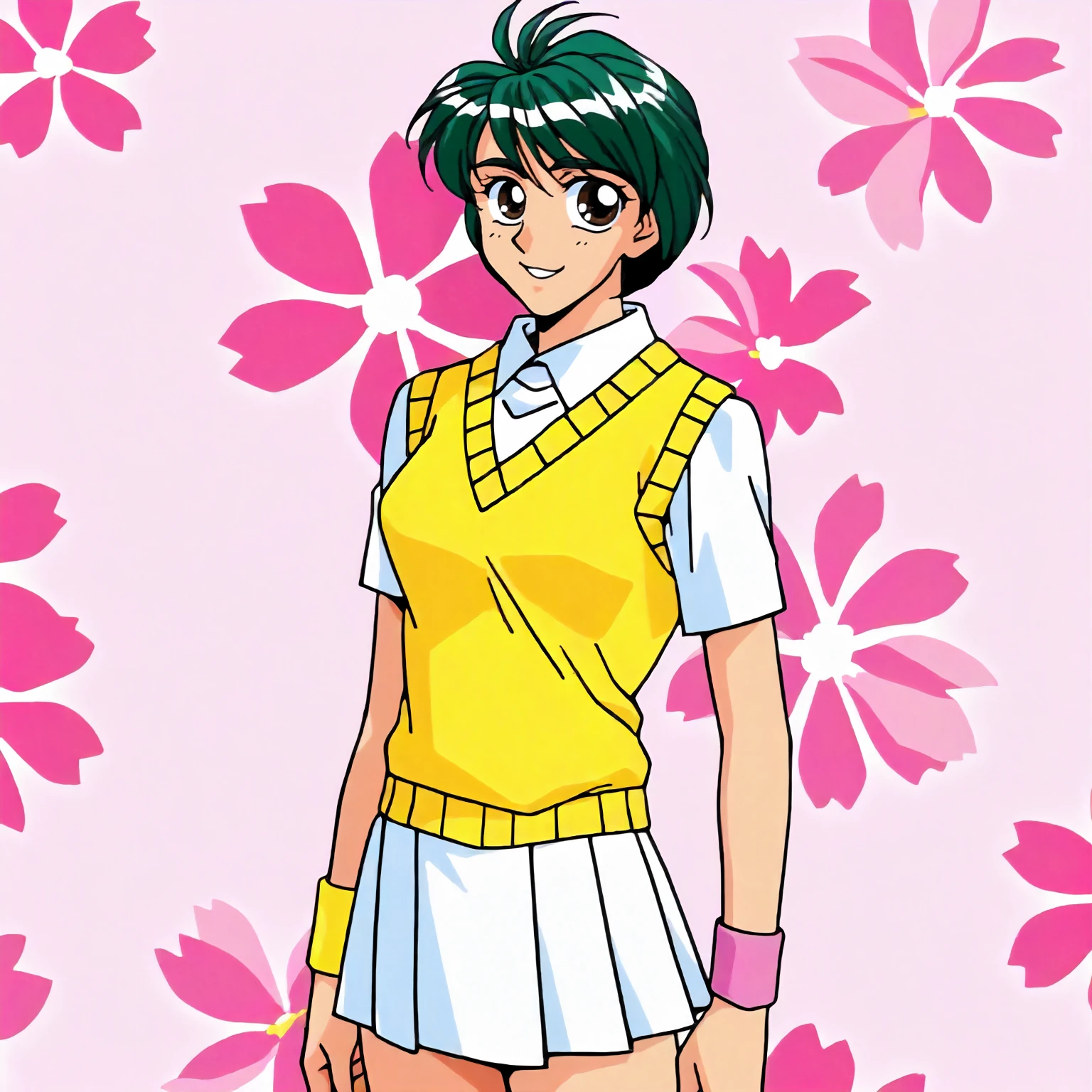 anime coloring,retro artstyle,1990s \(style\), akizuki_kyouko\(yuuwaku_office_renai-ka\),1girl,green hair,short hair,brown eyes,