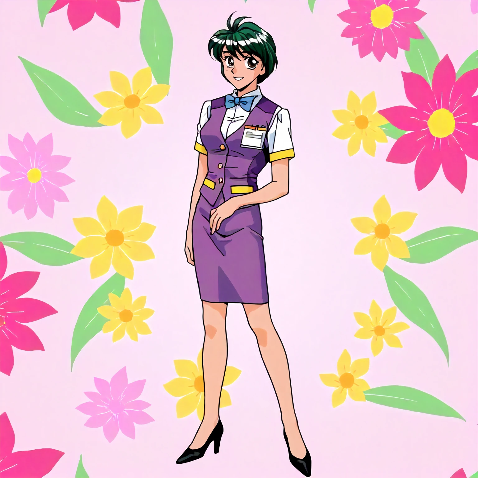 office lady,white shirt,bowtie,purple vest,yellow trim,short_sleeves, purple skirt,pencil_skirt,