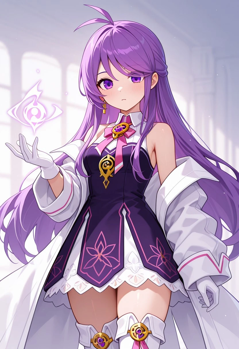 1girl, AishaAS, purple hair, antenna hair, very long hair, sidelocks, purple eyes, single earring, white coat, AS coat, off shoulder, bare shoulders, amulet, neck ribbon, pink ribbon, wing collar, layered dress, dress, white and purple dress, sleeveless dress, white gloves, belt, white thighbootsElemental Master