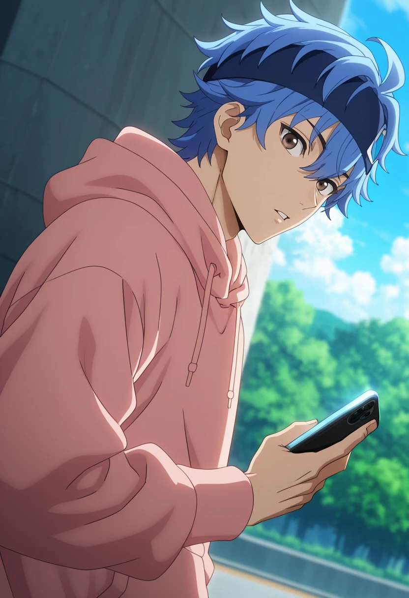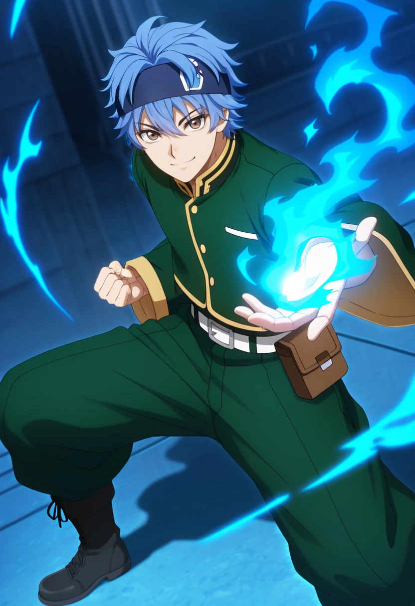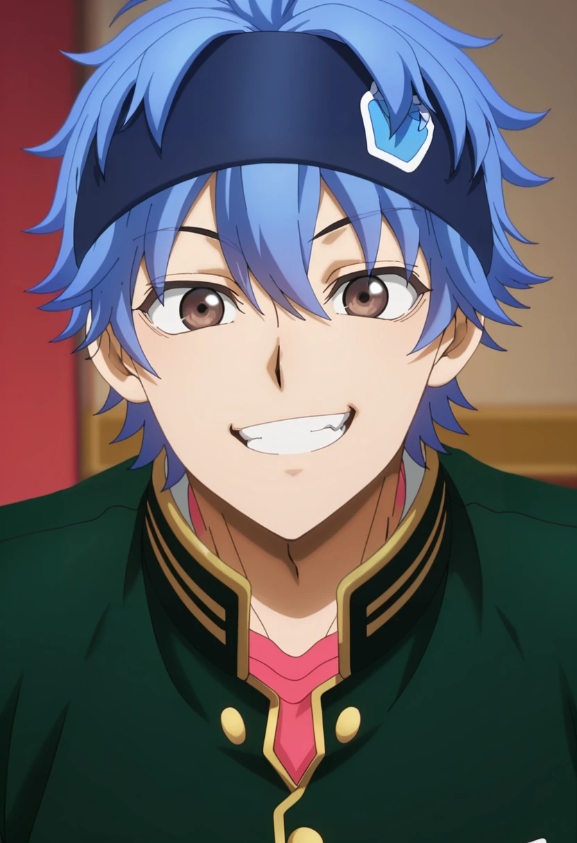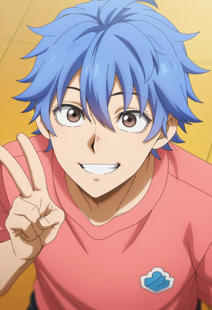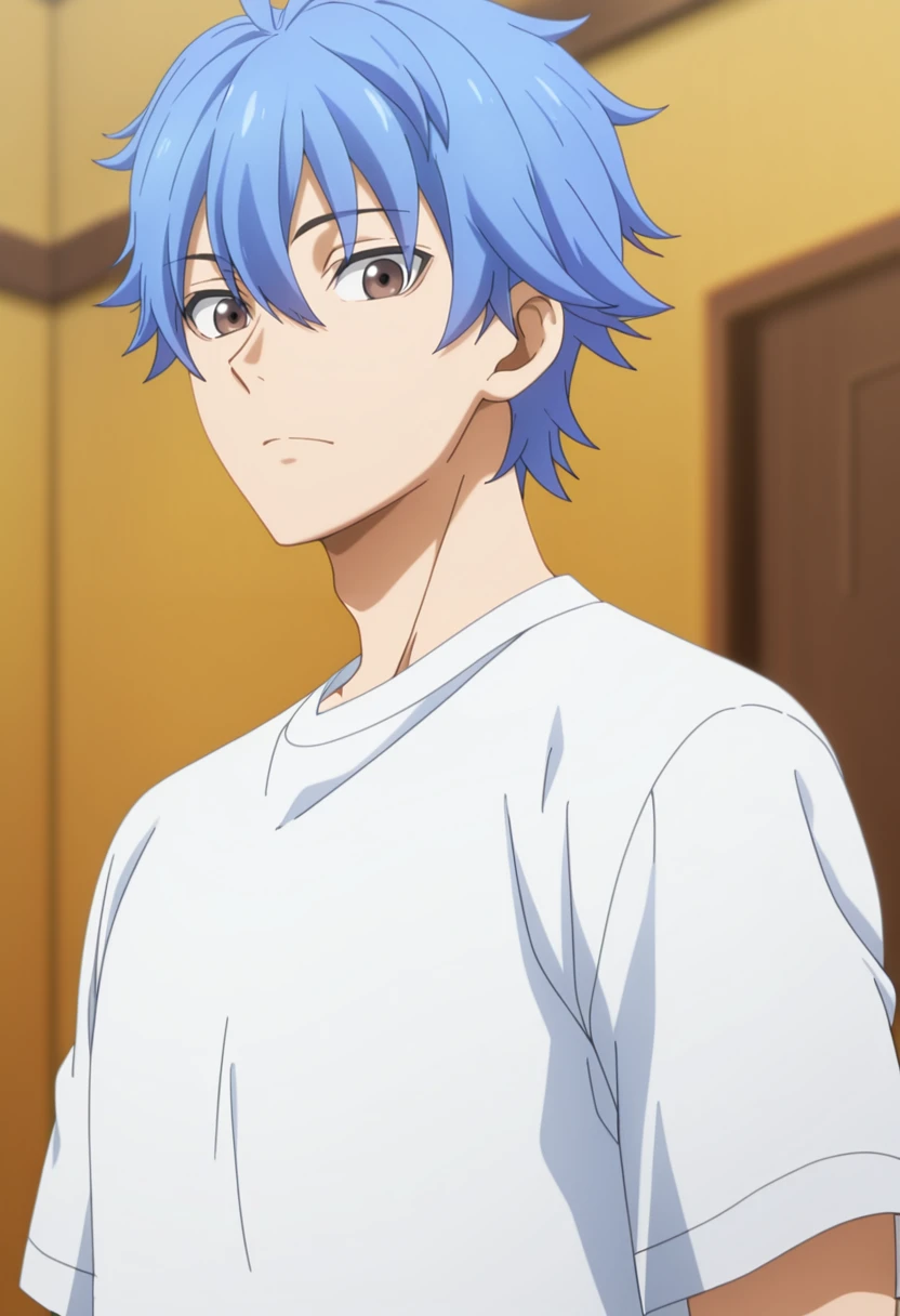 souji, blue hair, brown eyes,short hair