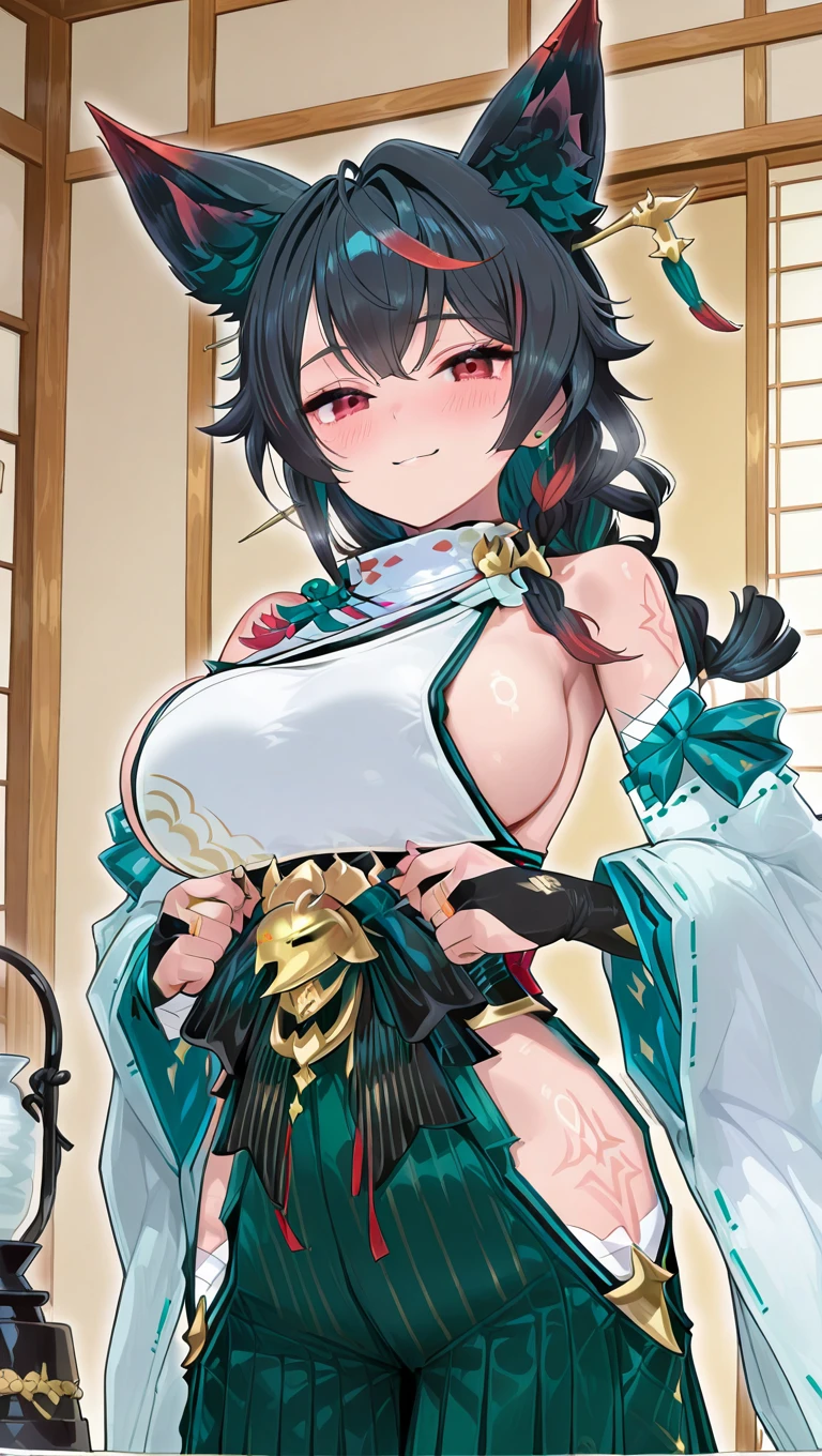 japanese clothes,bare shoulders,detached sleeves,wide sleeves,bridal gauntlets,large breasts,sideboob,hakama skirt,green hakama,tattoo,hip vent,tabi,okobo