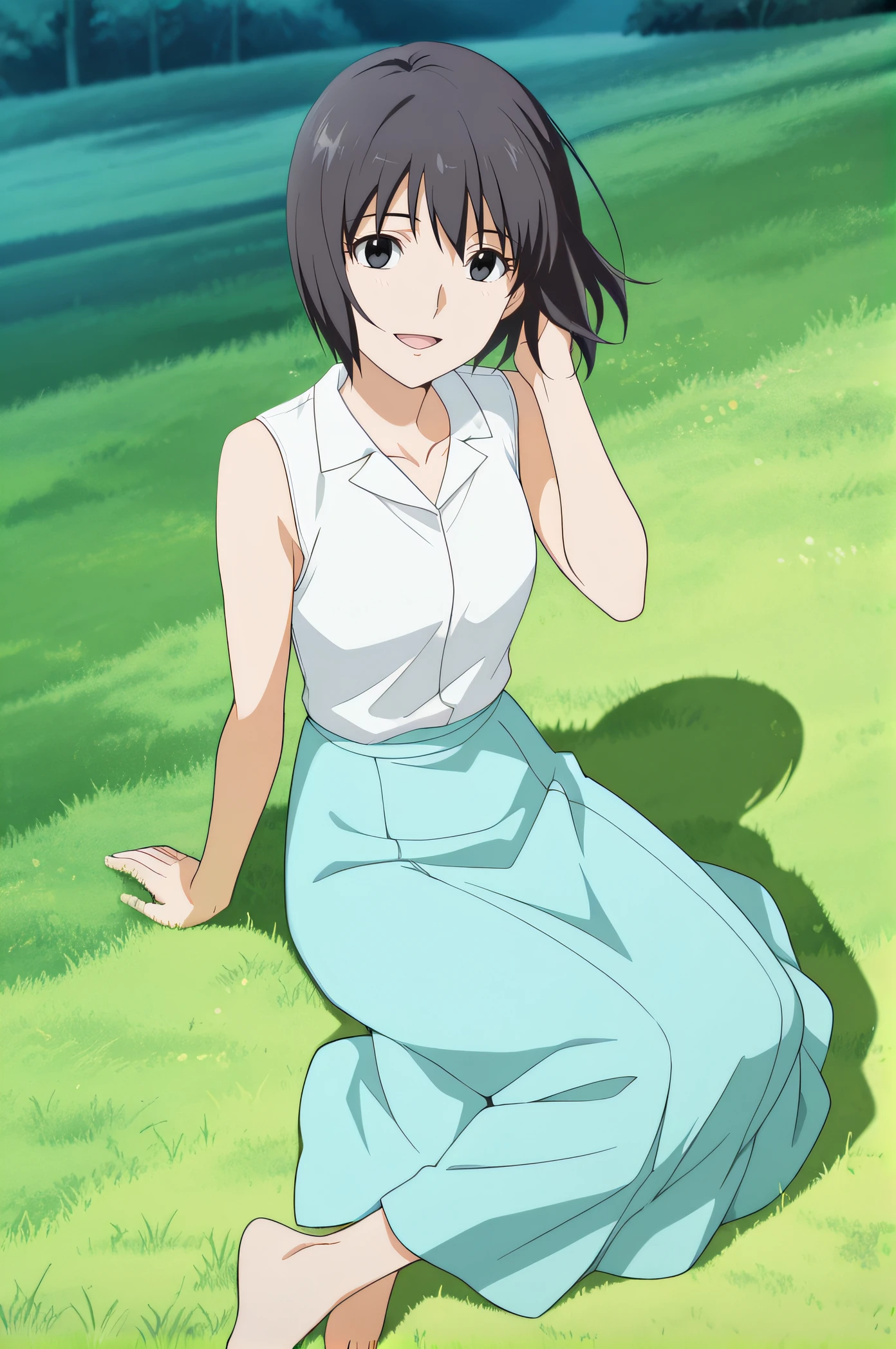 white sleeveless shirt, white collared shirt, long skirt, cyan skirt