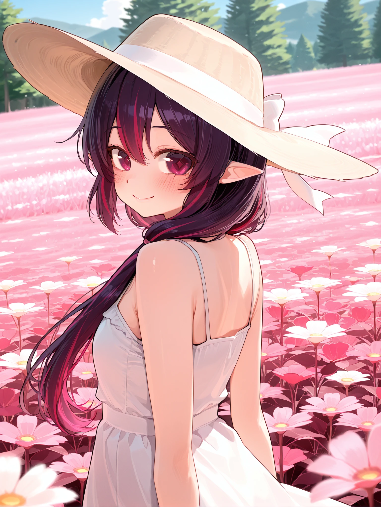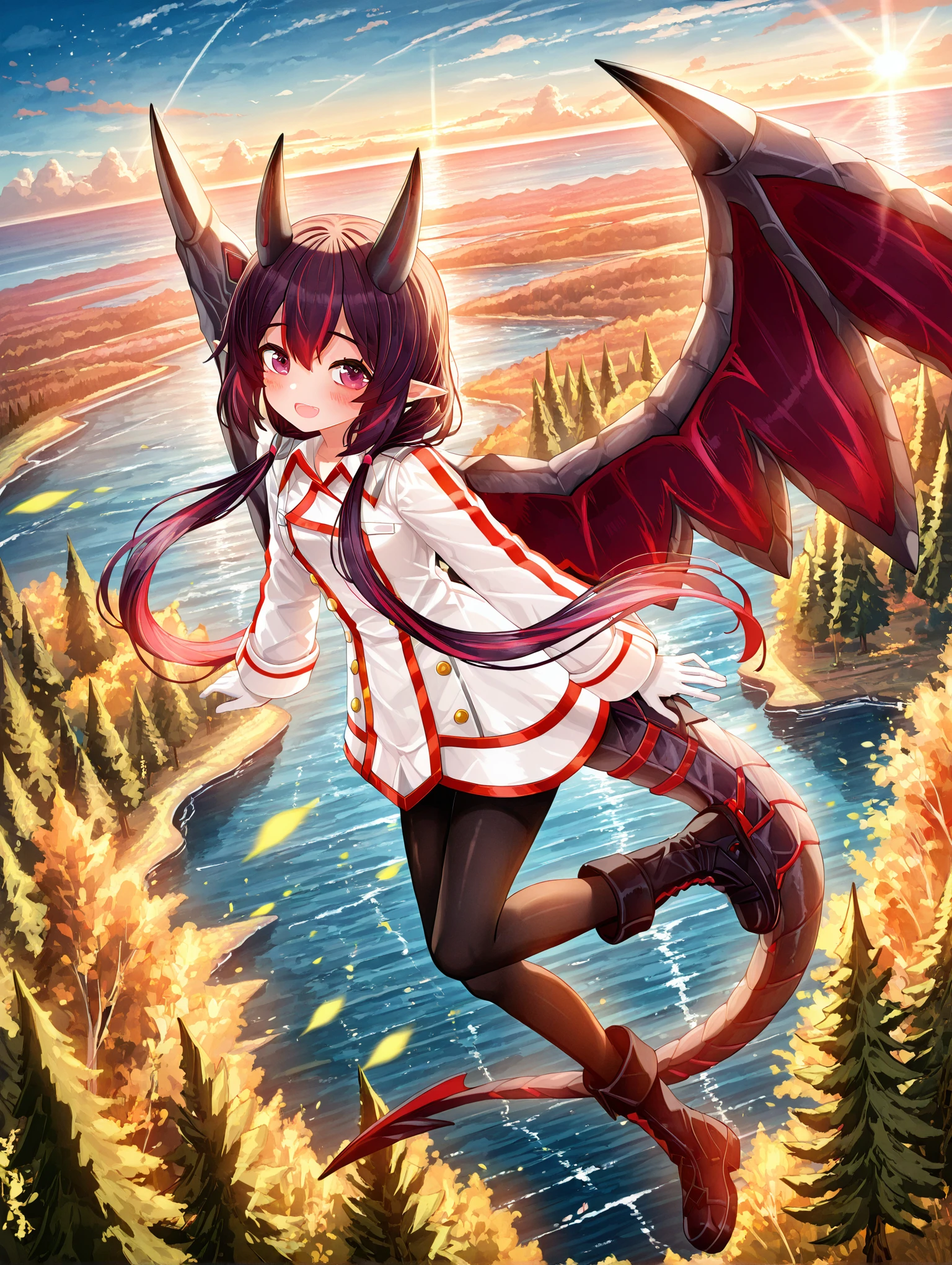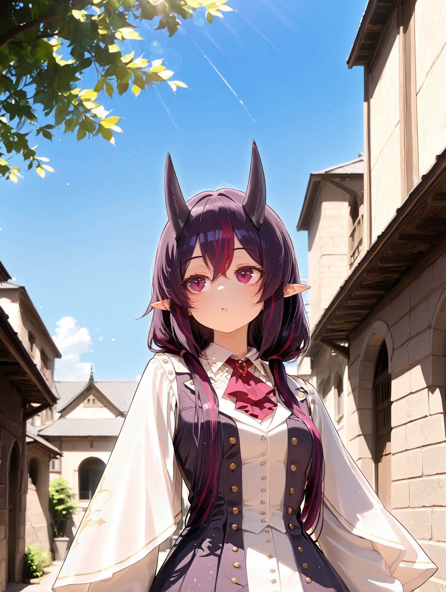 G4k0, 1girl, streaked hair, low twintails, dragon horns, pointy ears, hair over shoulderOutfit