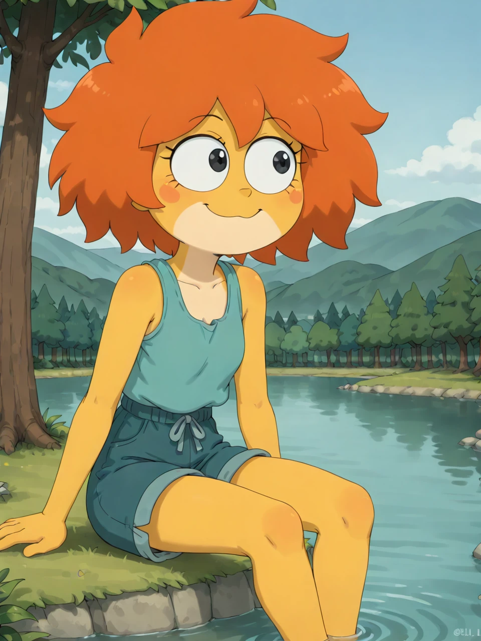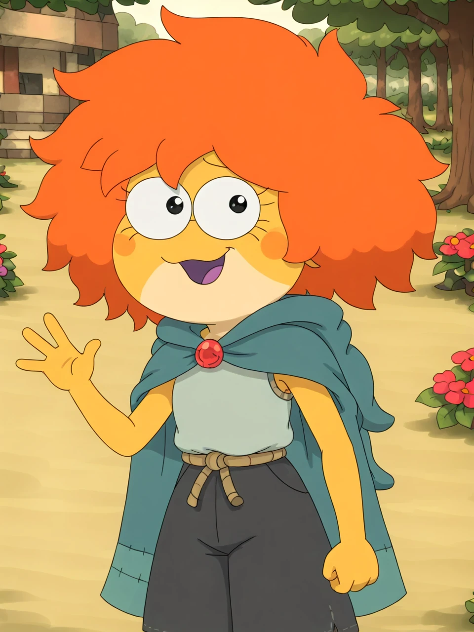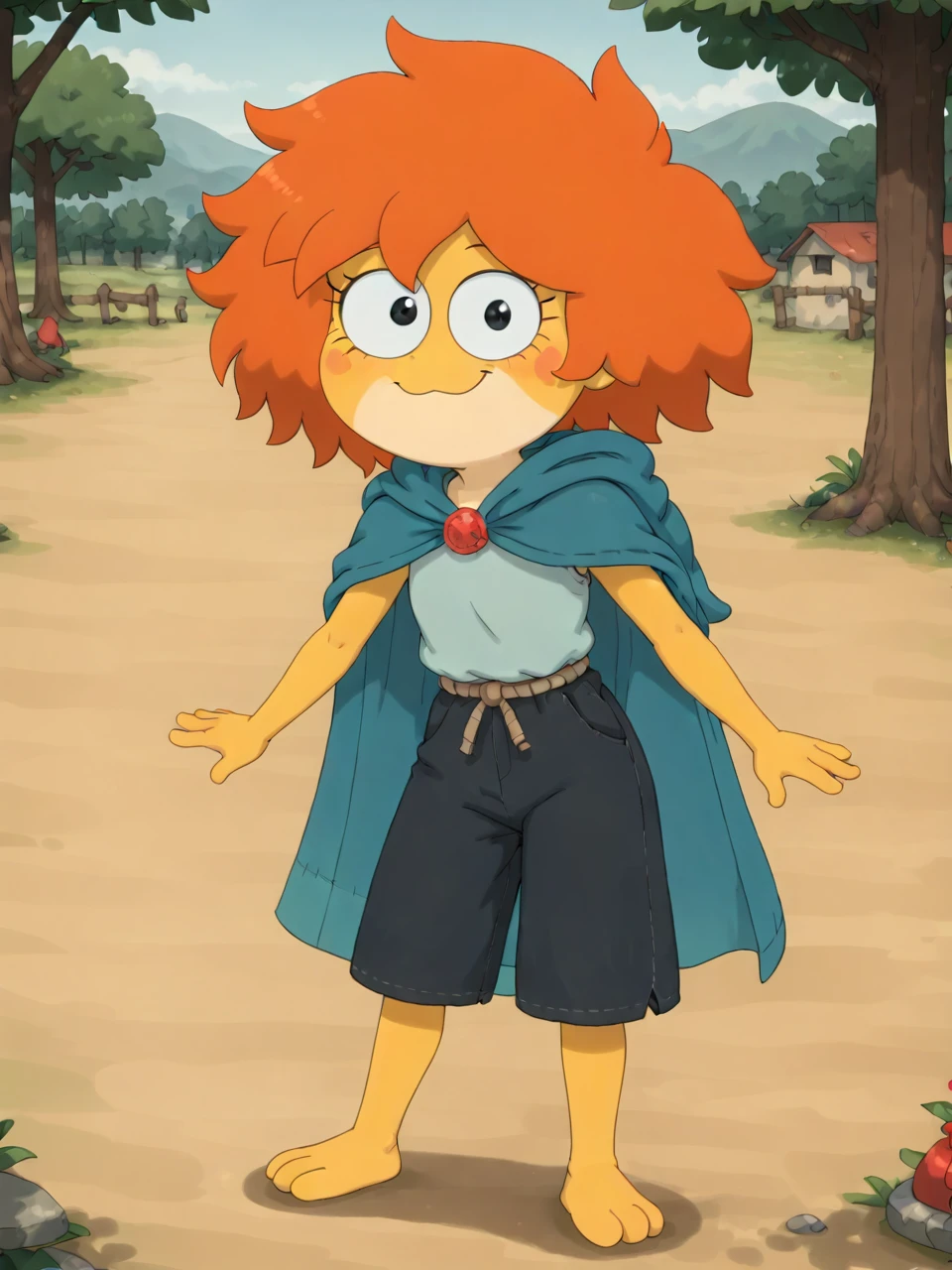 3l1l0gu3ivy, solo, 1girl, yellow skin, black eyes, shorts, orange hair, rope, blue cape, black shorts,