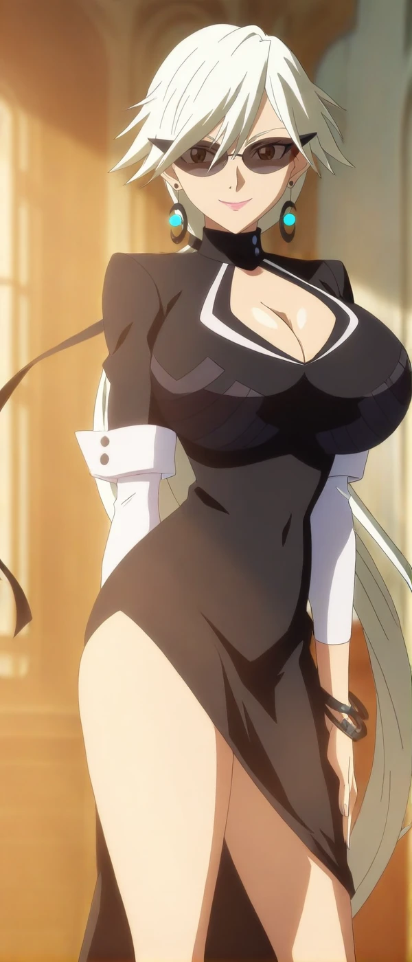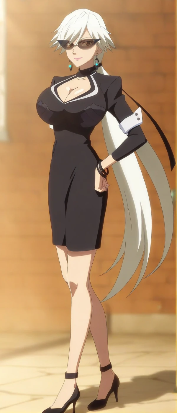 low ponytail, very long hair, white hair, brown eyes, sunglasses, lipstick,