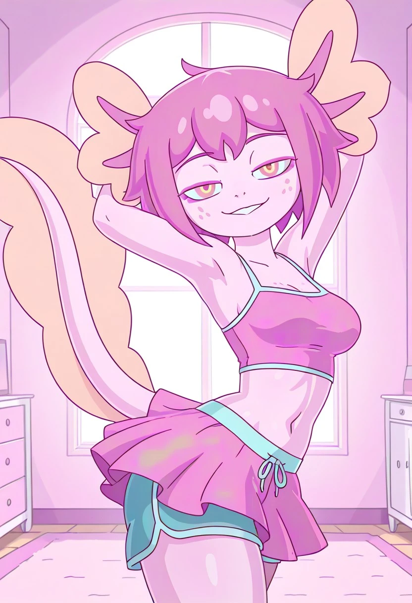 vitzyv1,1girl, pink skin, pink hair, freckles,antho axolotl,Axolotl tail,freckles, membranous tail, membranous external gills,