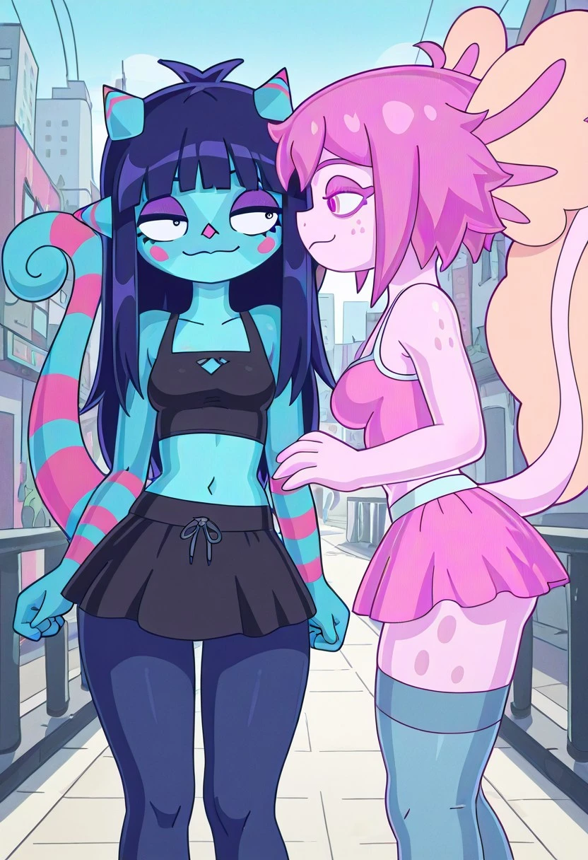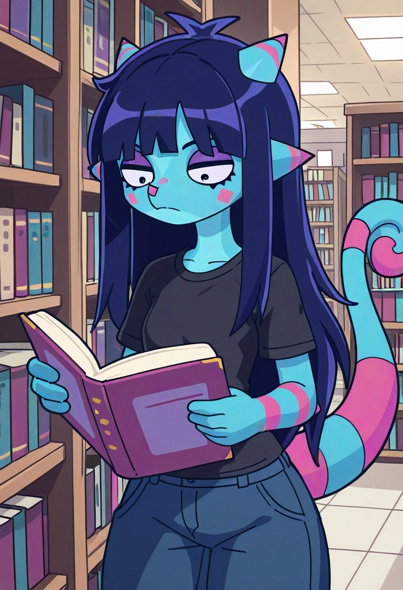 1girl,kamiv1,anthro chameleon,black eyes, purple eyeshadow, dark blue hair, long hair,blue skin, magenta horned nose, magenta stripes on the arms, magenta stripes on the thighs, chameleon tail,