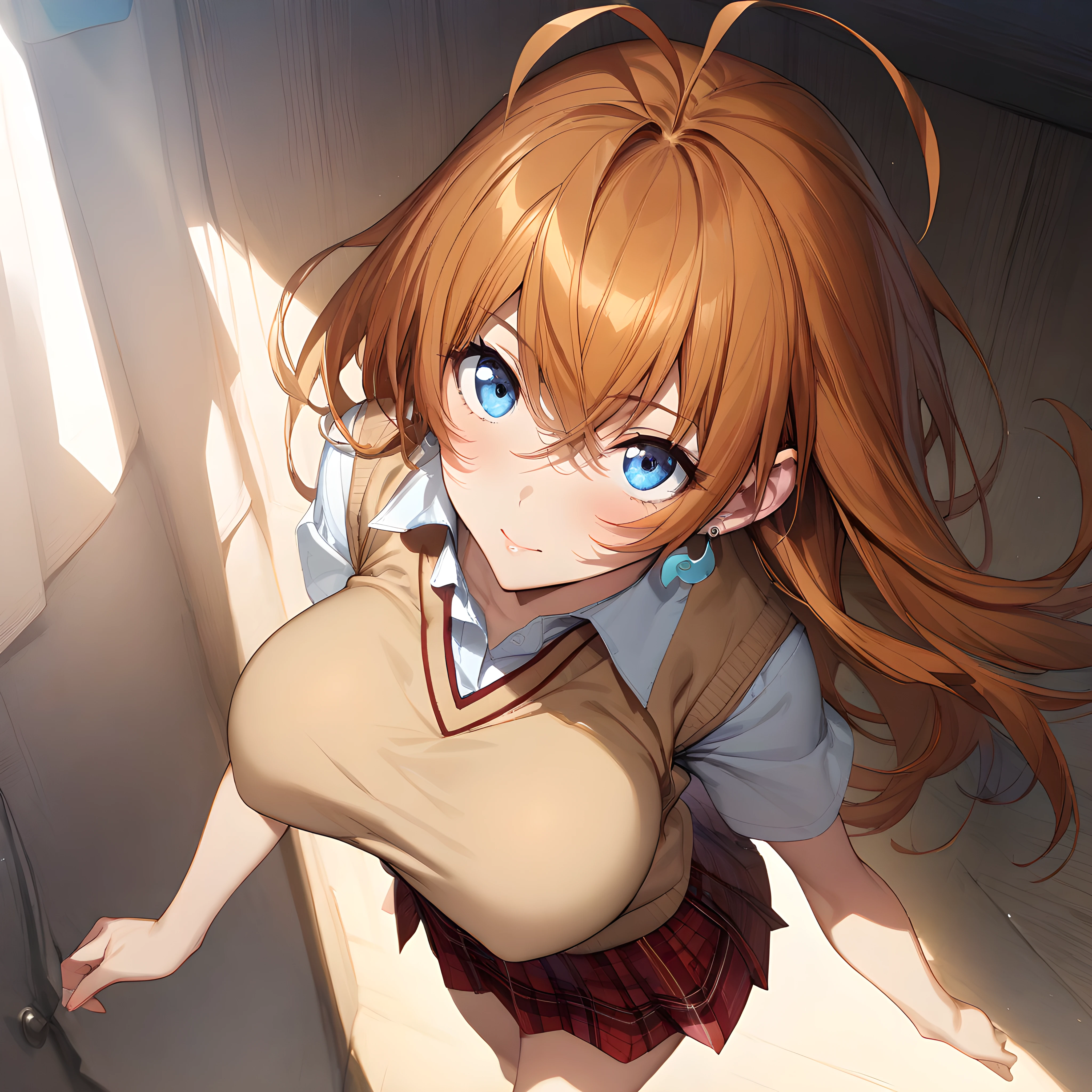 blonde hair, green eyes, long hair, ahoge, antenna hair,