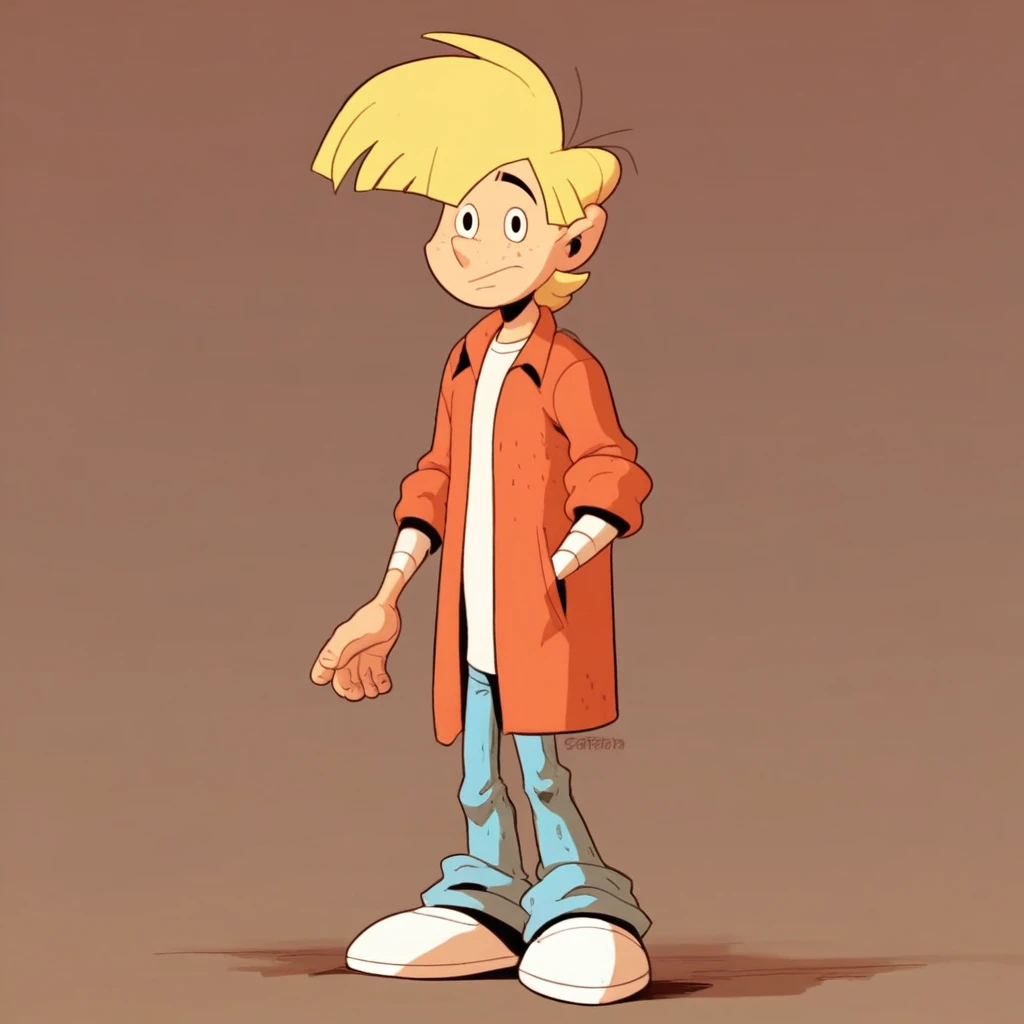 Crash nebu1a, blonde hair, solo, 1boy, male focus, freckles, black eyes, pants, shirt, jeans, coat,