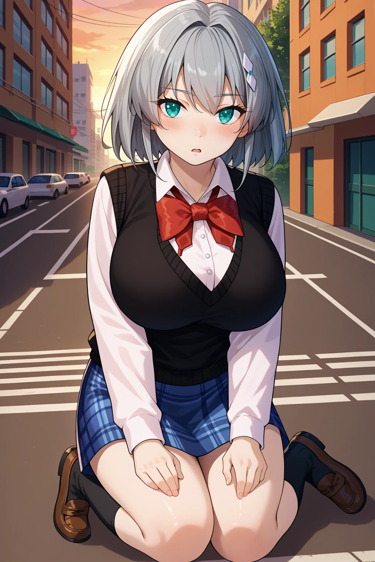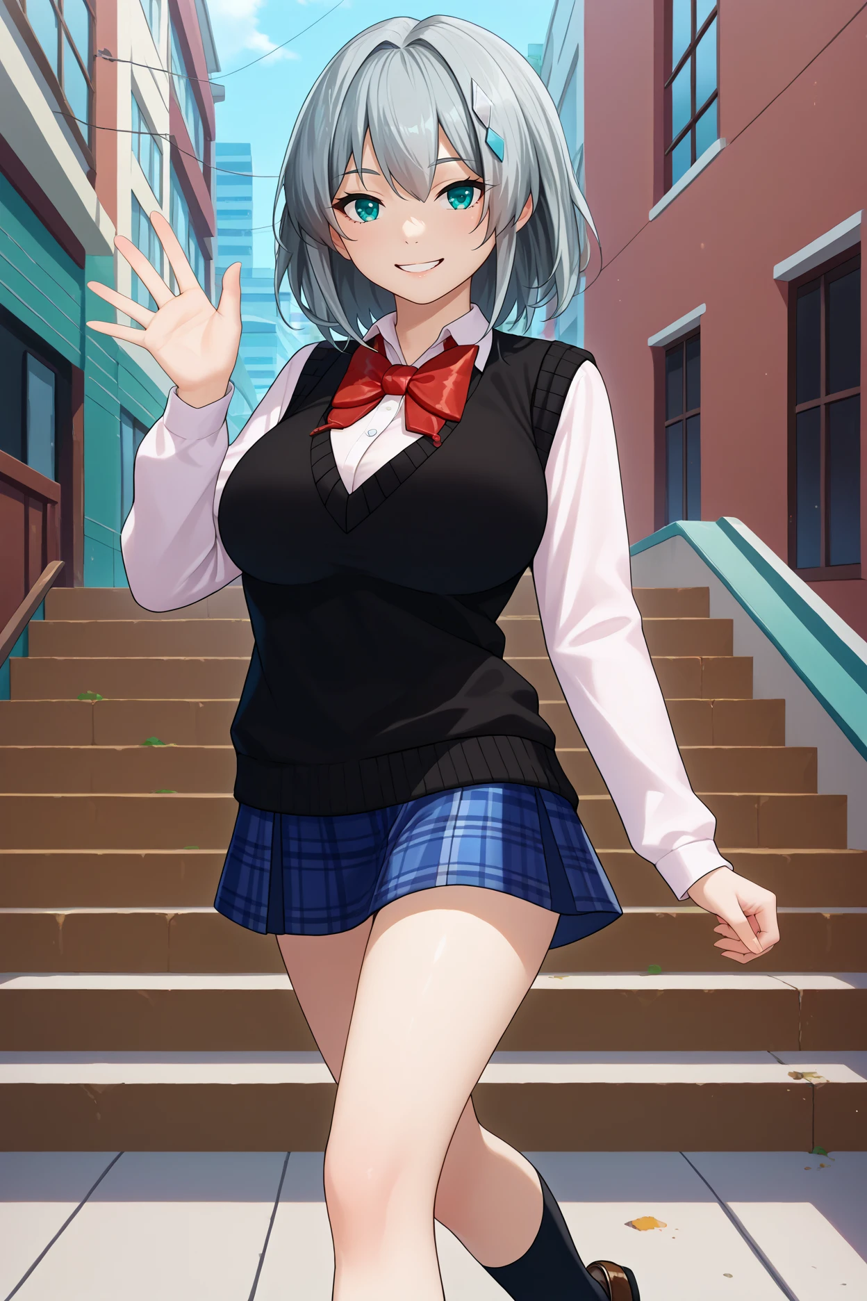 Add "hair ornament, black sweater vest, collared shirt, red bowtie, long sleeves, plaid skirt, black socks, loafers" for her school uniform.