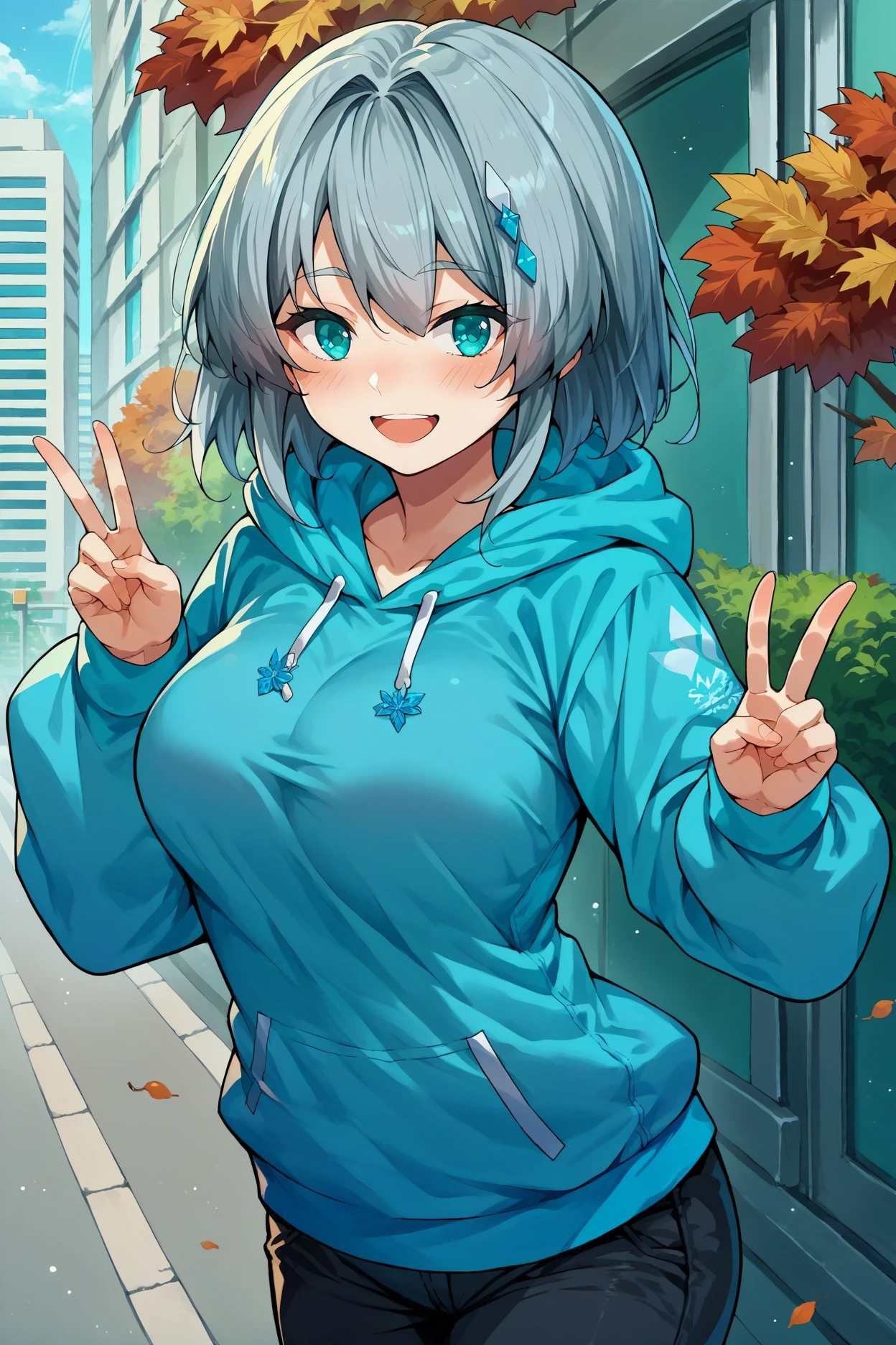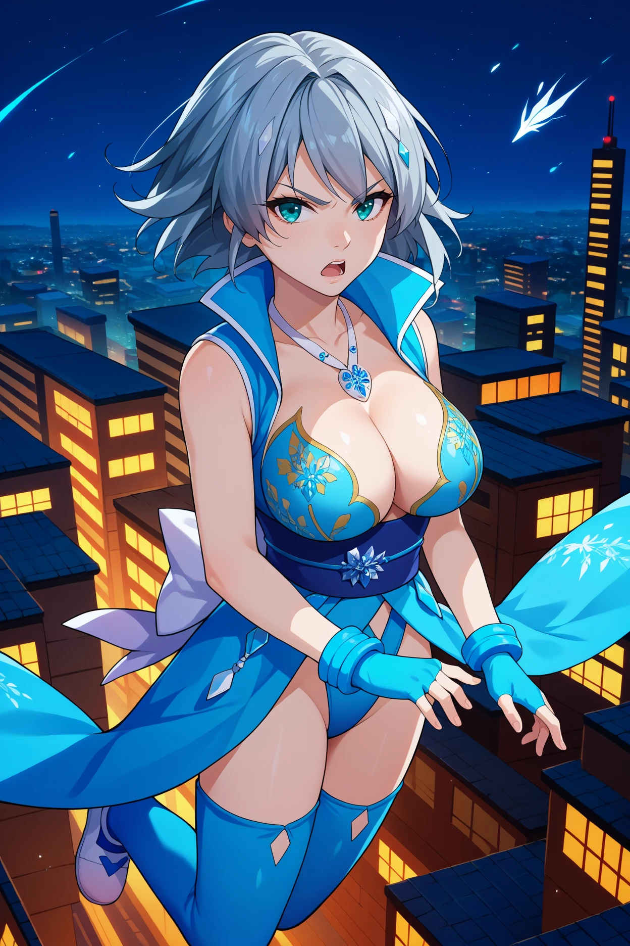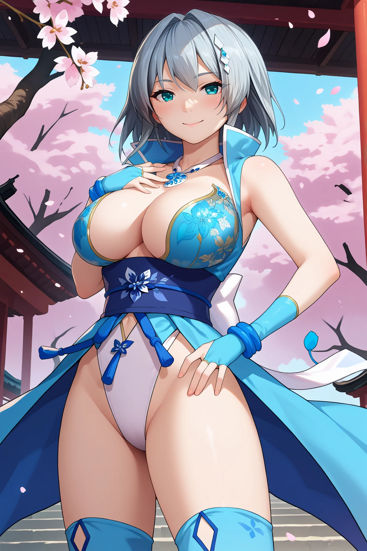 mricka, grey hair, teal eyes, medium hair, large breasts