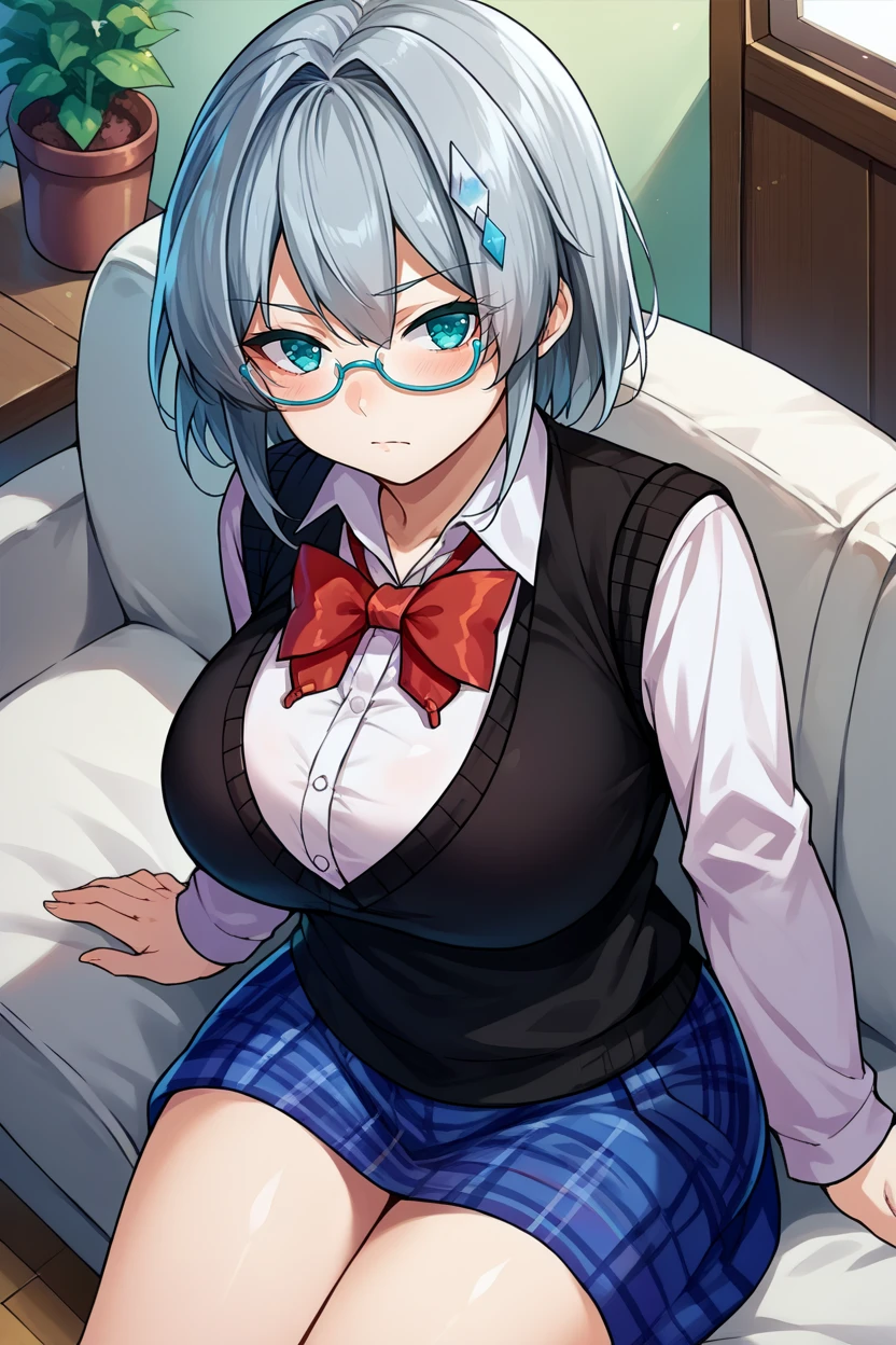 hair ornament, black sweater vest, collared shirt, red bowtie, long sleeves, plaid skirt, black socks, loafers