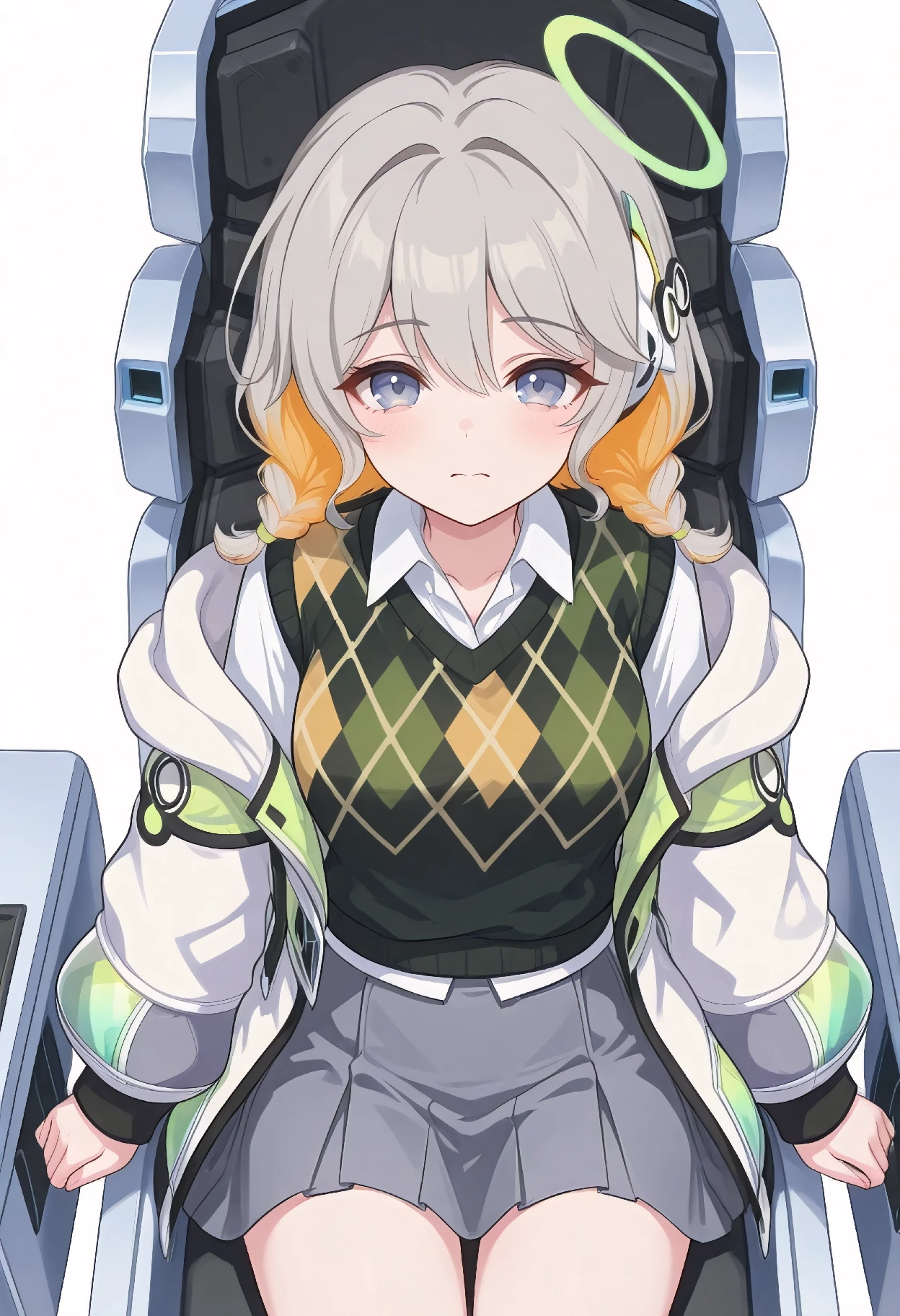 LaylaJenkins (Muv-Luv), multicolored hair, two-tone hair, colored inner hair, grey hair, orange hair, blonde hair, twin braids, hair between eyes, blue eyes, halo, power symbol, collared shirt, white shirt, argyle clothes, black sweater vest, , hooded jacket, white jacket, , hood down, puffy long sleeves, grey skirt, pleated skirt, miniskirt,