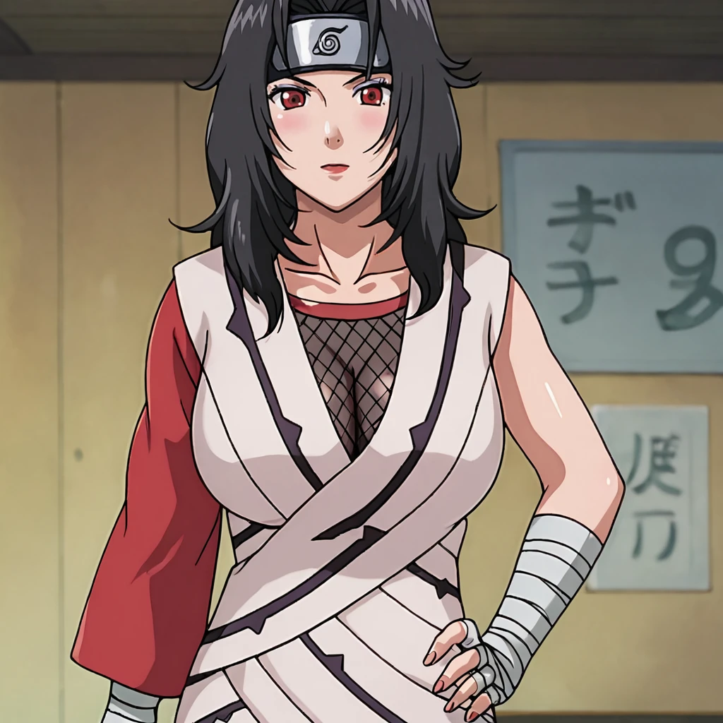 Trigger : YuuhiKurenai, black hair, bandages, large breasts, forehead protector, red eyes, long hair, fishnets, bandaged arm, ninja, konohagakure symbol, collarbone, cowboy shot