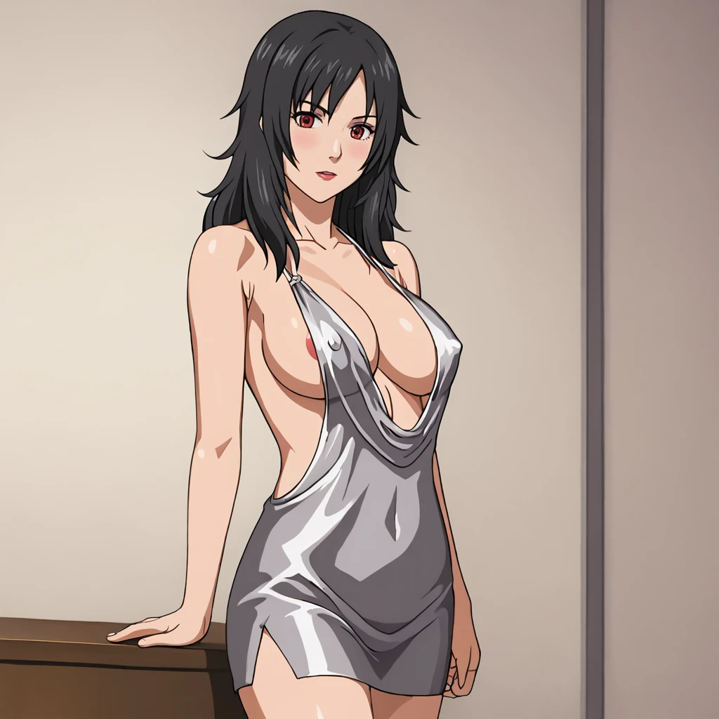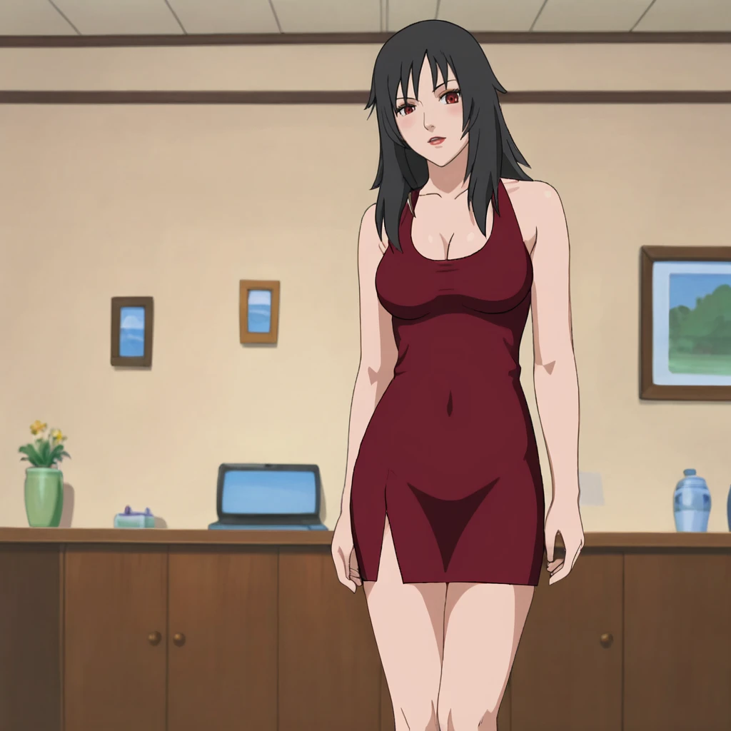 Trigger with dress: YuuhiKurenaiCasual, 1girl, solo,red dress, black hair, red eyes, medium breasts, cleavage, makeup, long hair, cowboy shot