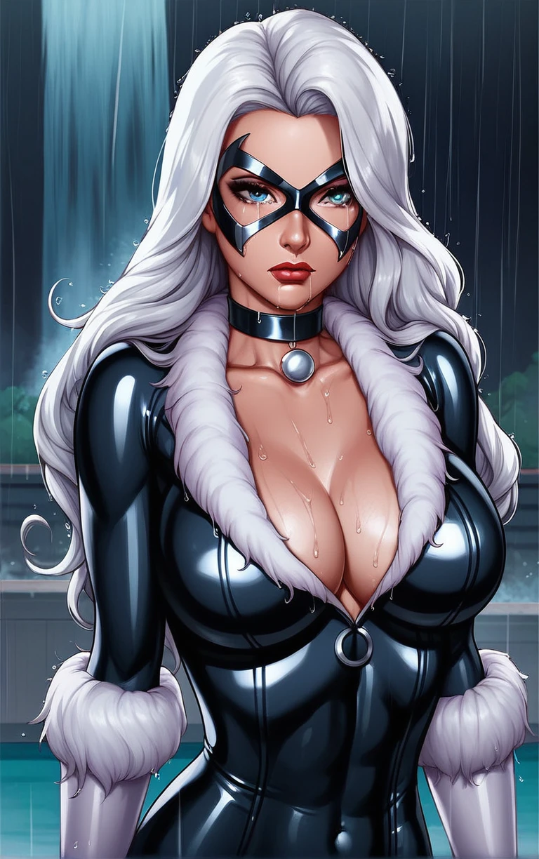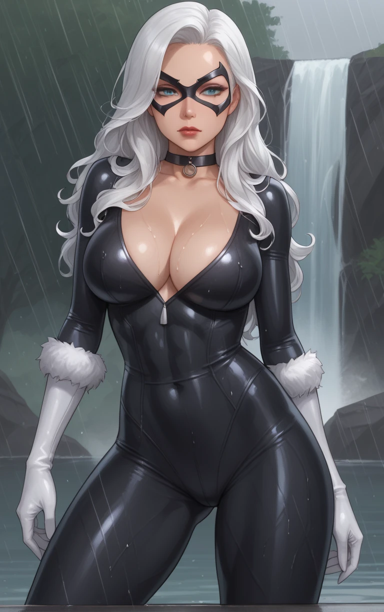 black bodysuit, fur-trimmed sleeves, fur trim, skin tight, white gloves, spikes, superhero, bodysuit, black choker, collar, cleavage, gloves, elbow gloves, long sleeves, covered navel,