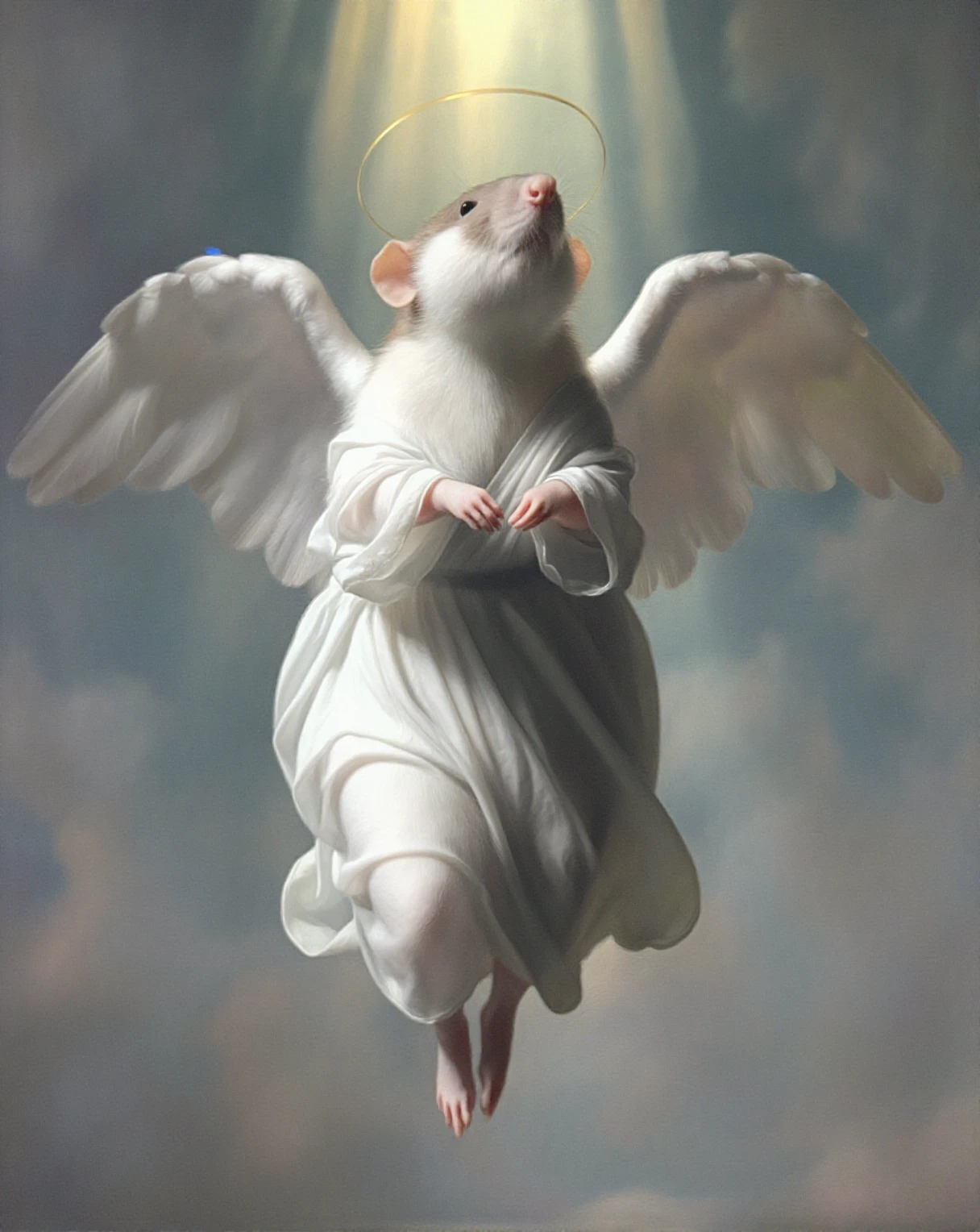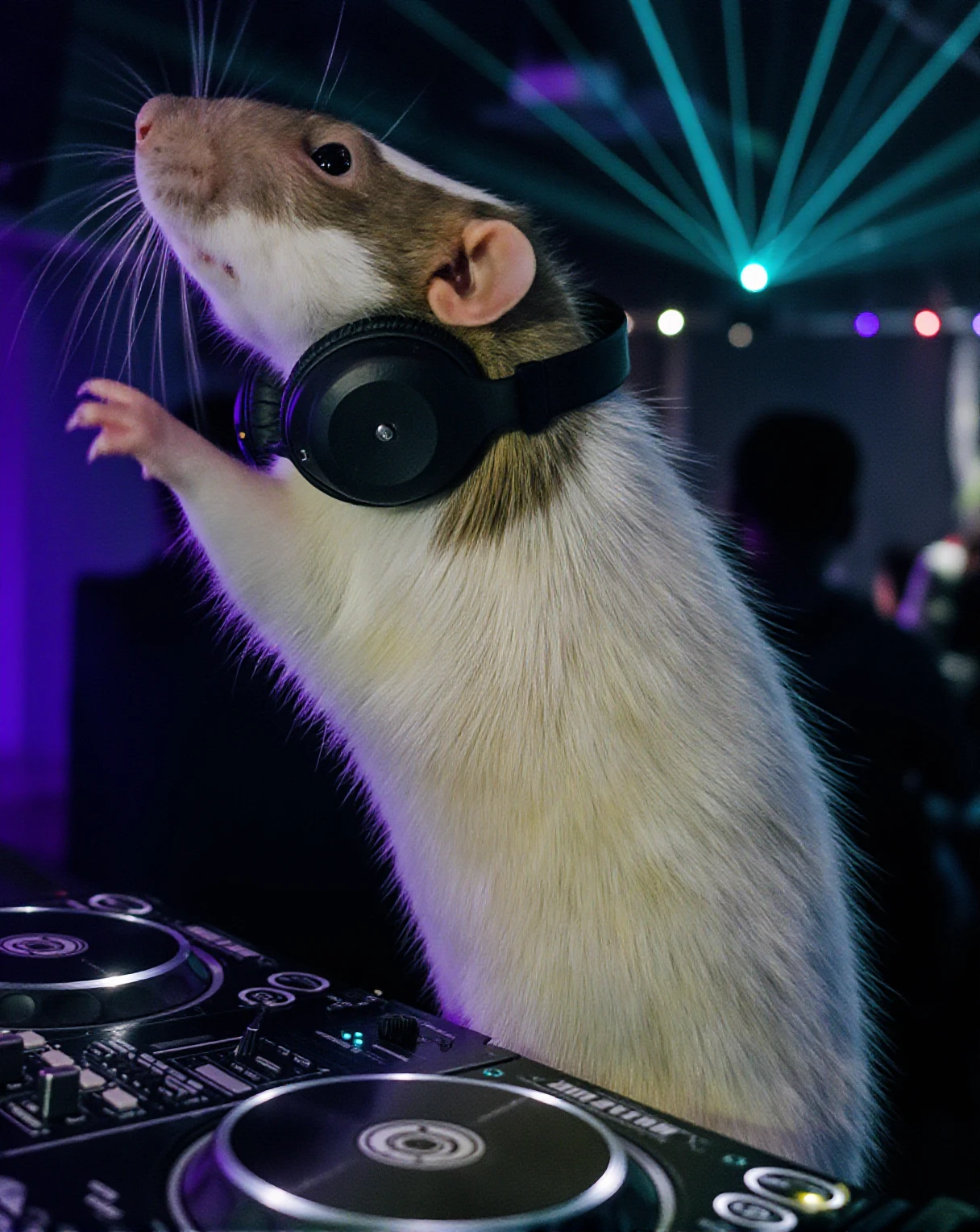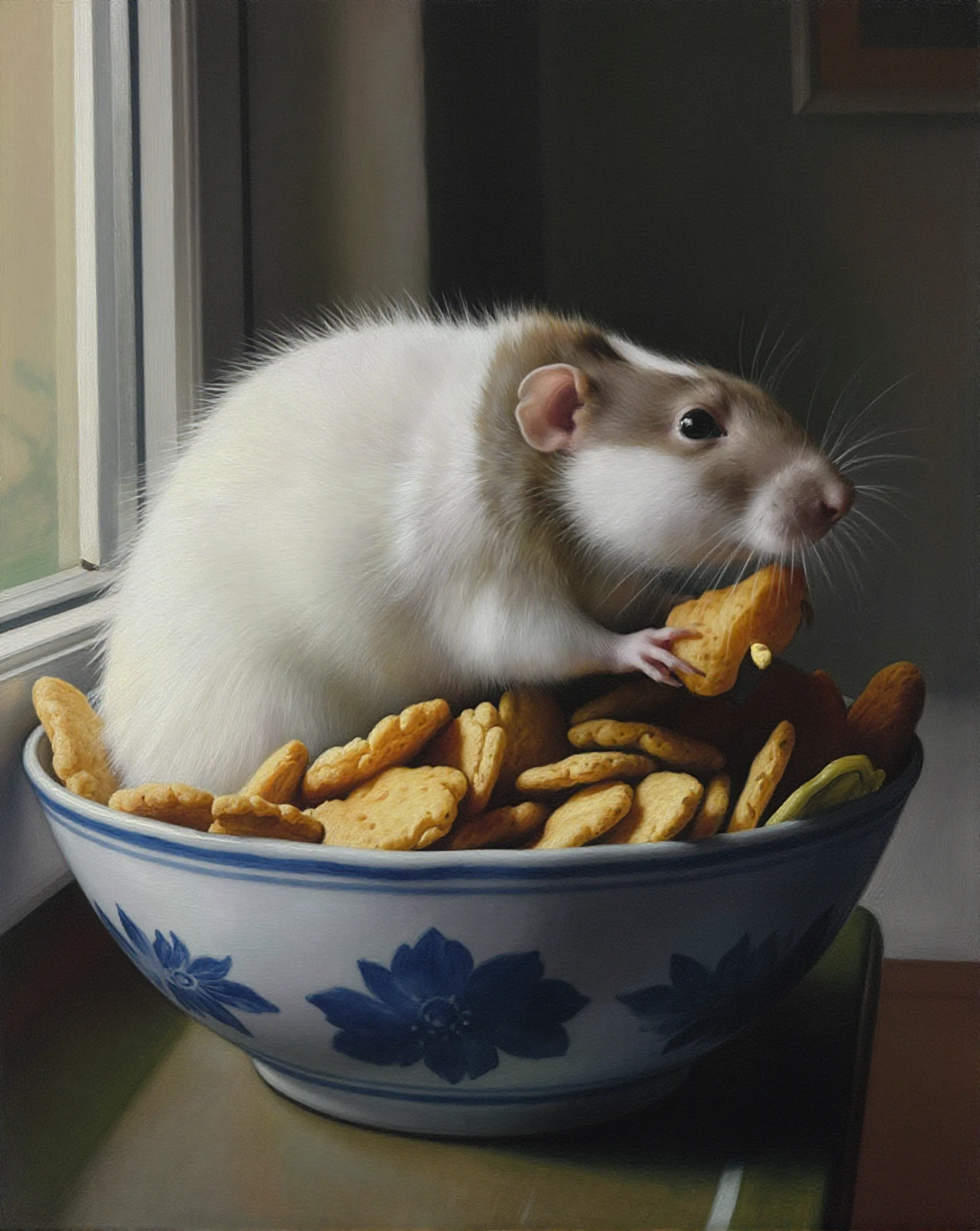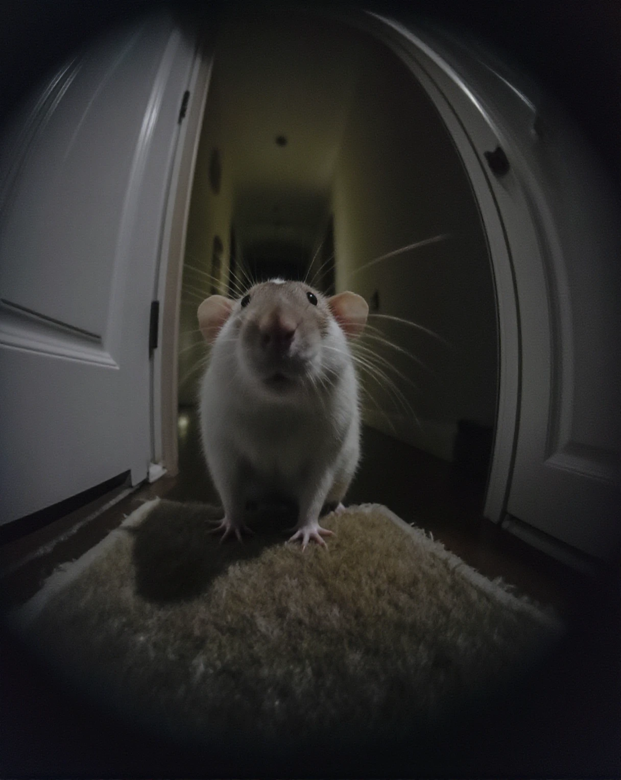 A small white-furred bubrat rat with a brownish-gray face and ears