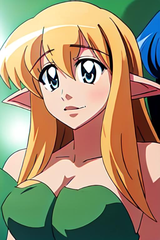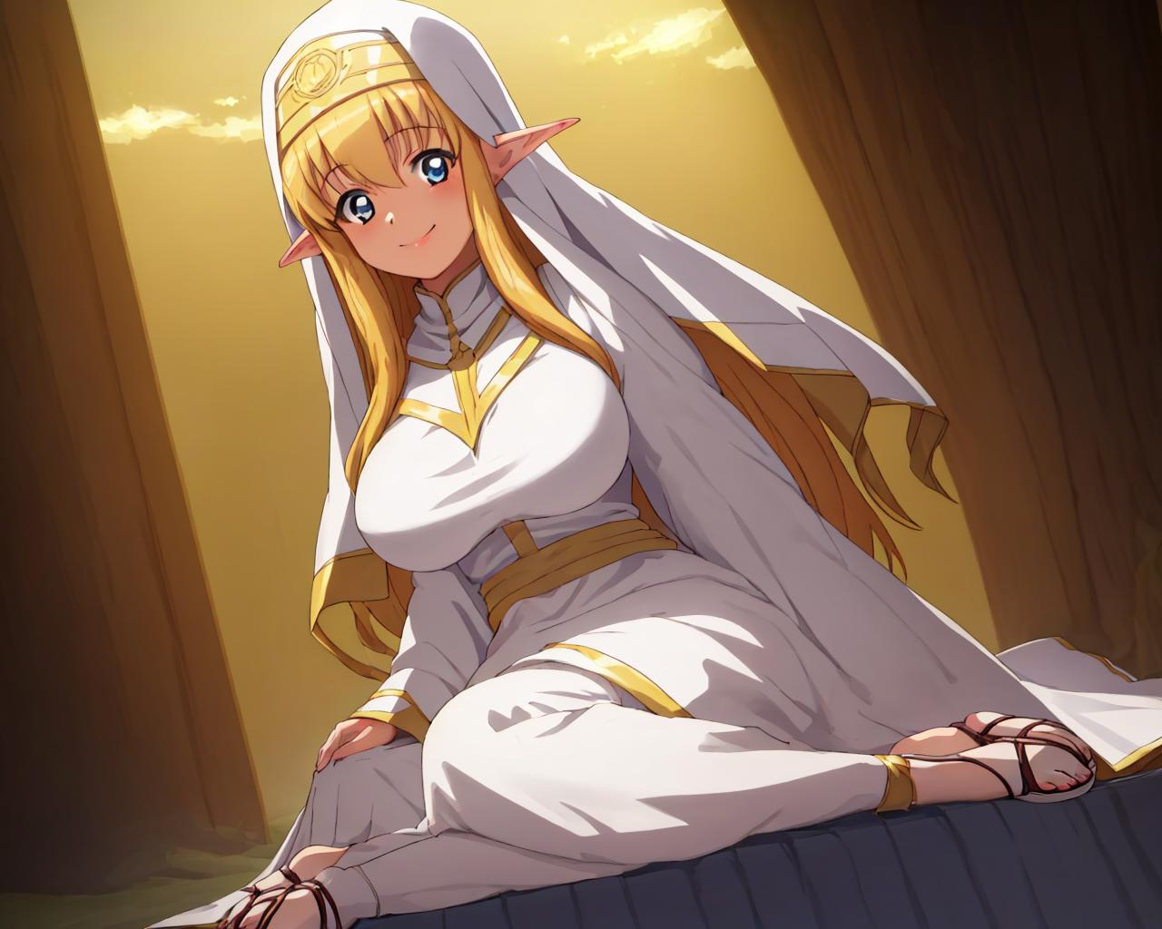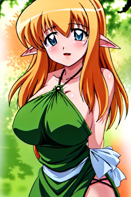 tifania,toeless legwear, bridal gauntlets, halterneck, blue eyes,elf, long hair, large breasts,pointy ears, blonde hair,sideboob, side-tie panties,white thighhighs,sandals,green_cloth,impossible_cloth, pelvic curtain,thick thighs,bare shoulders,17_year_old_girl,