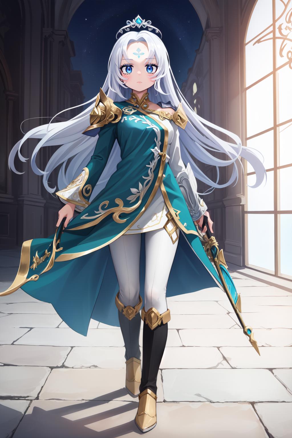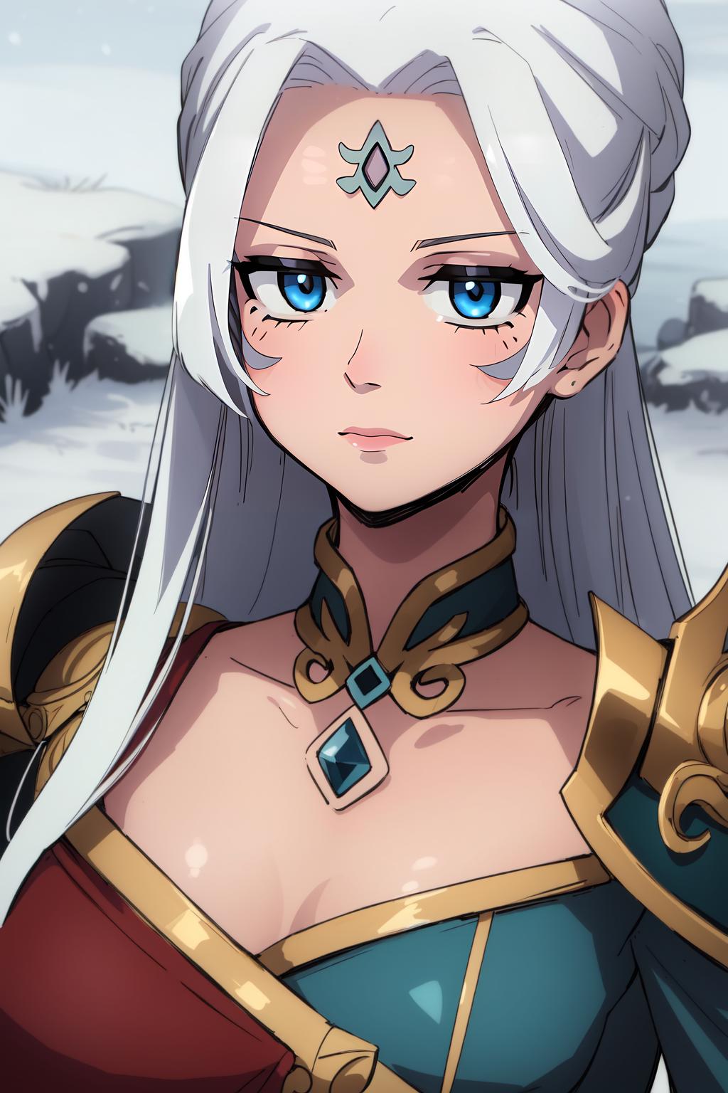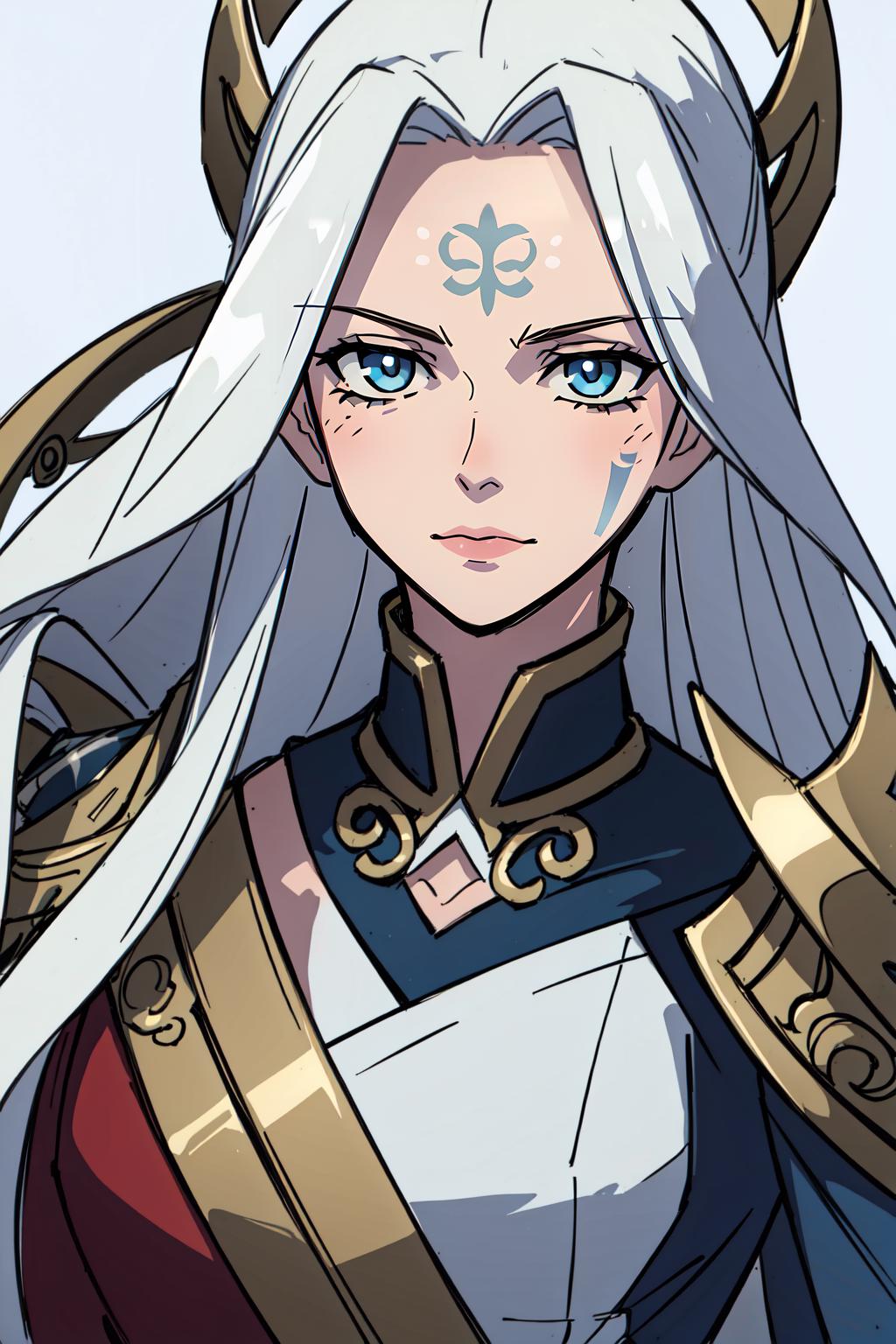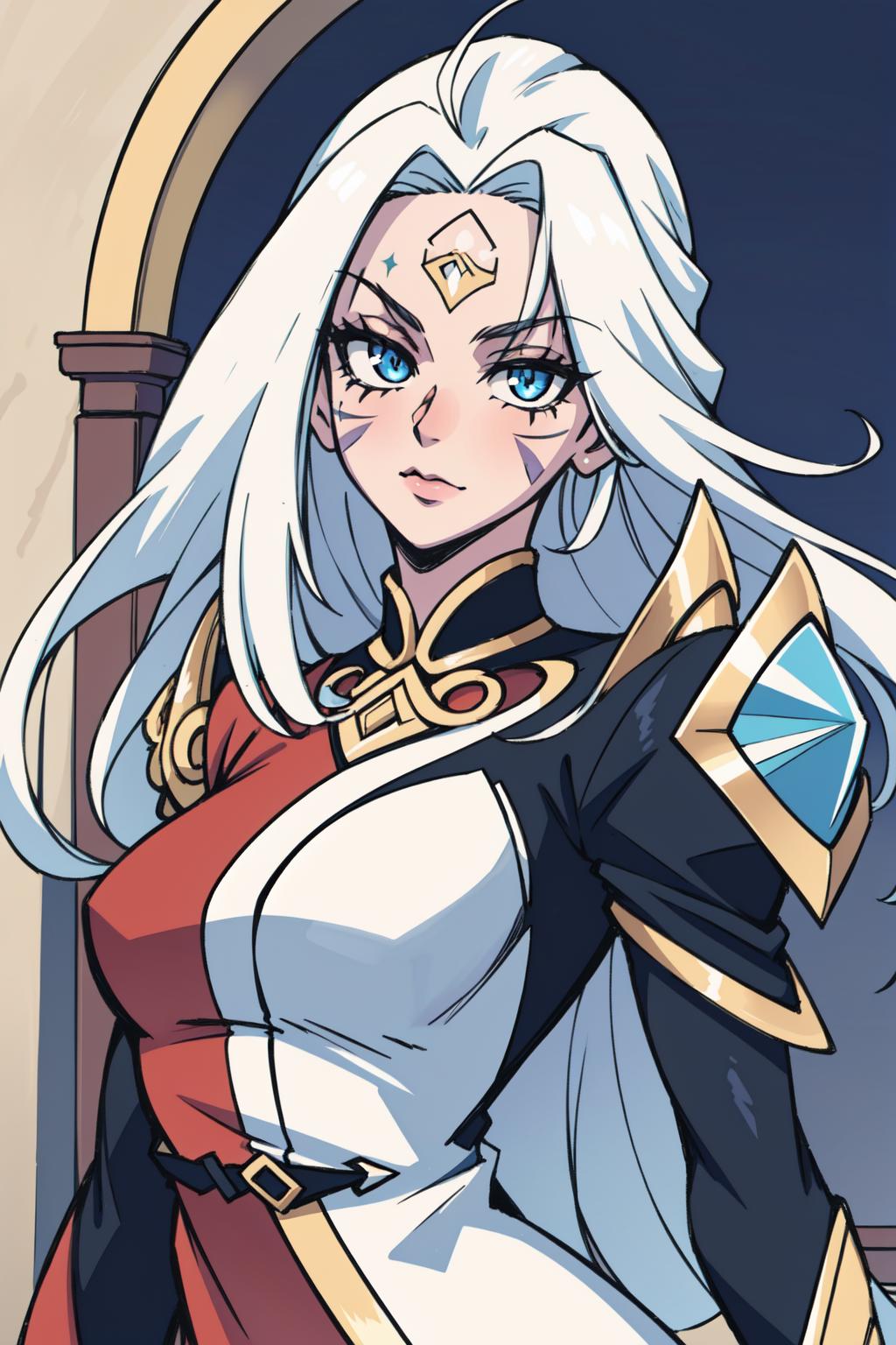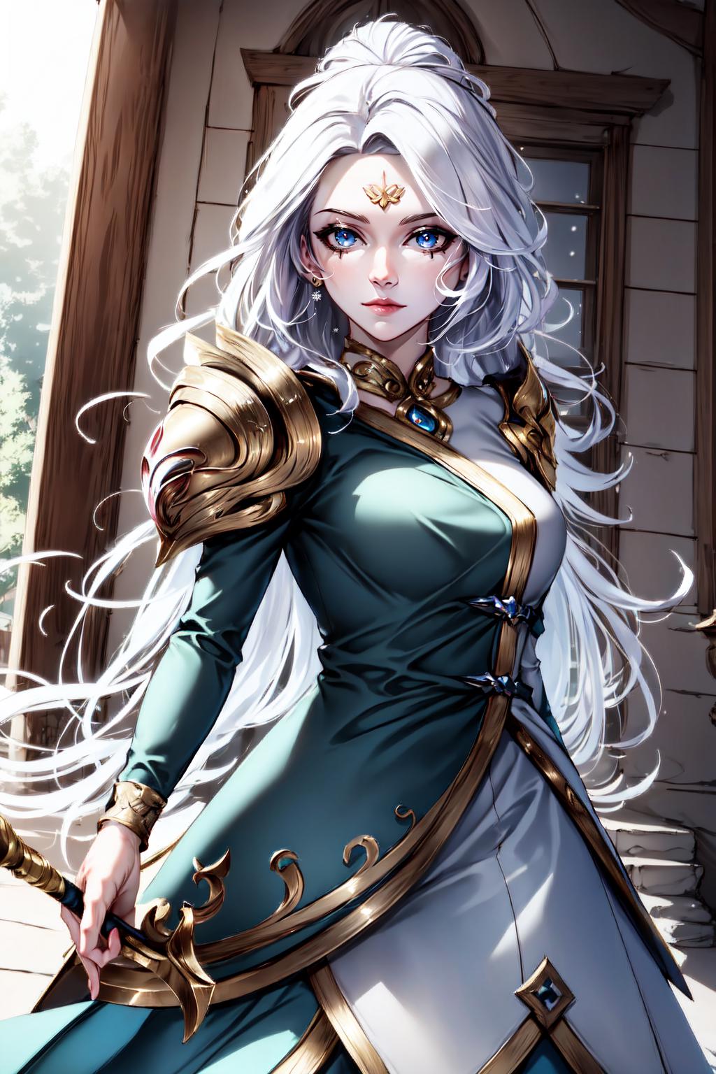 optional tags: dress, pauldrons, long hair, white hair, forehead mark