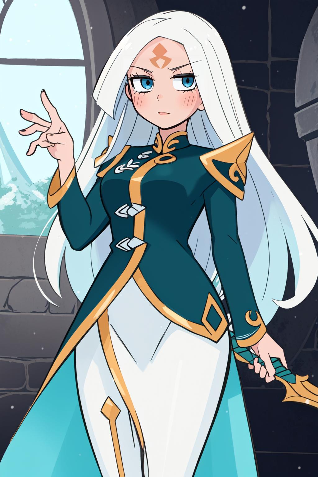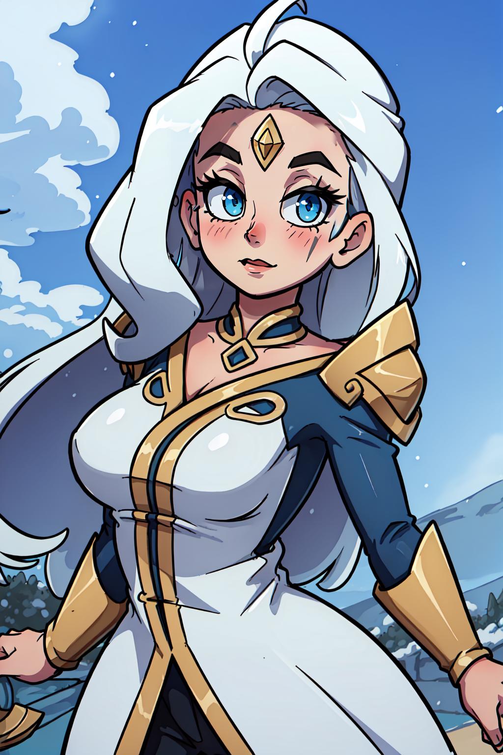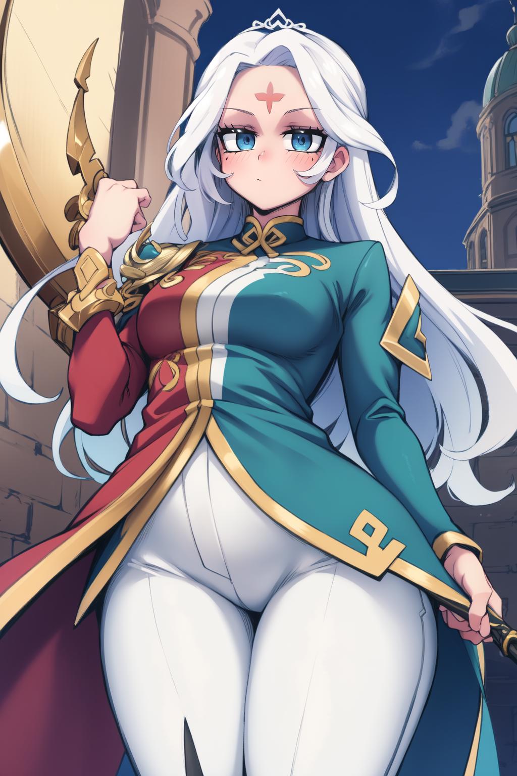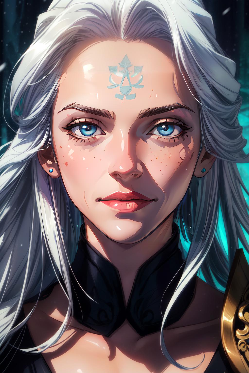 optional tags: dress, pauldrons, long hair, white hair, forehead mark