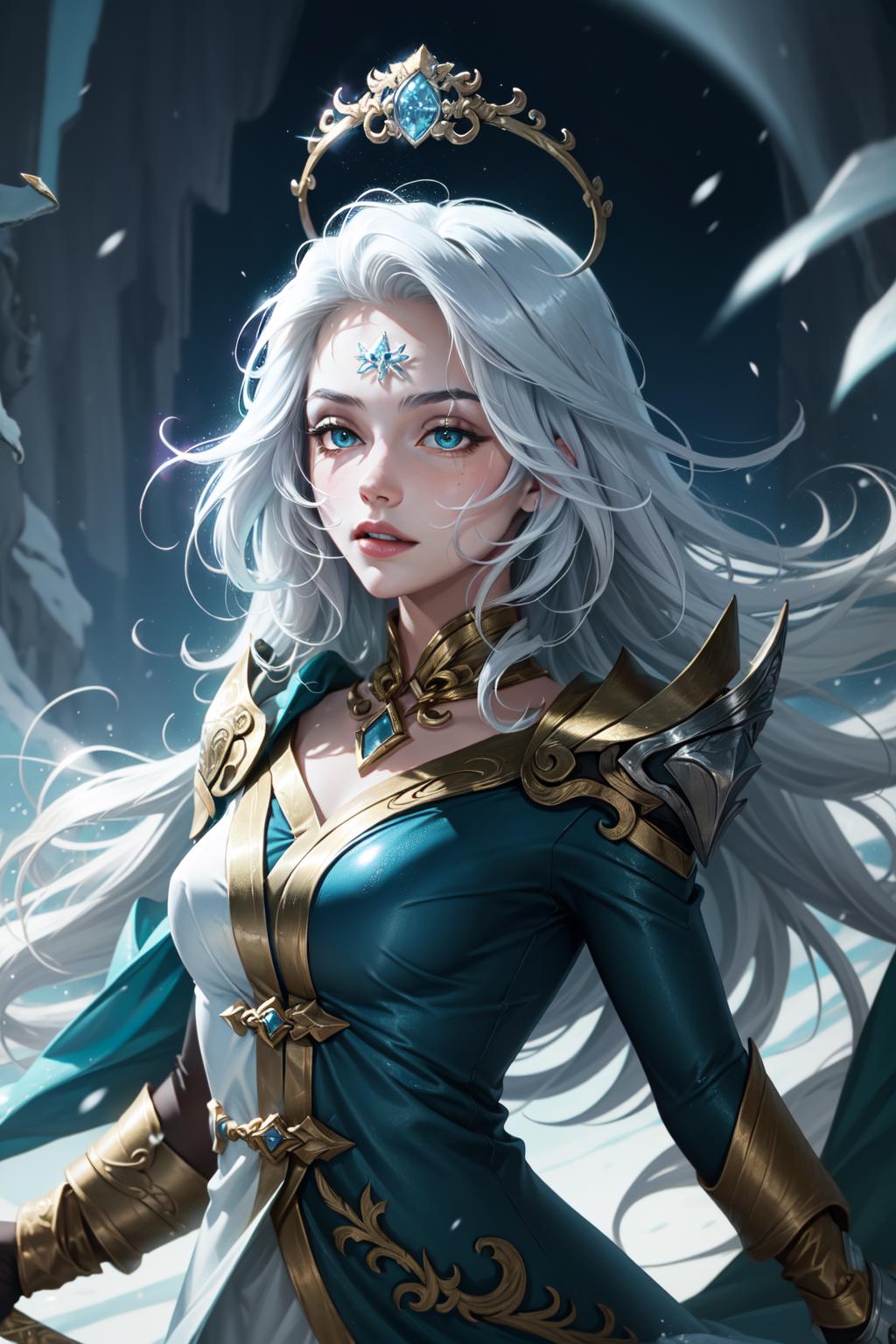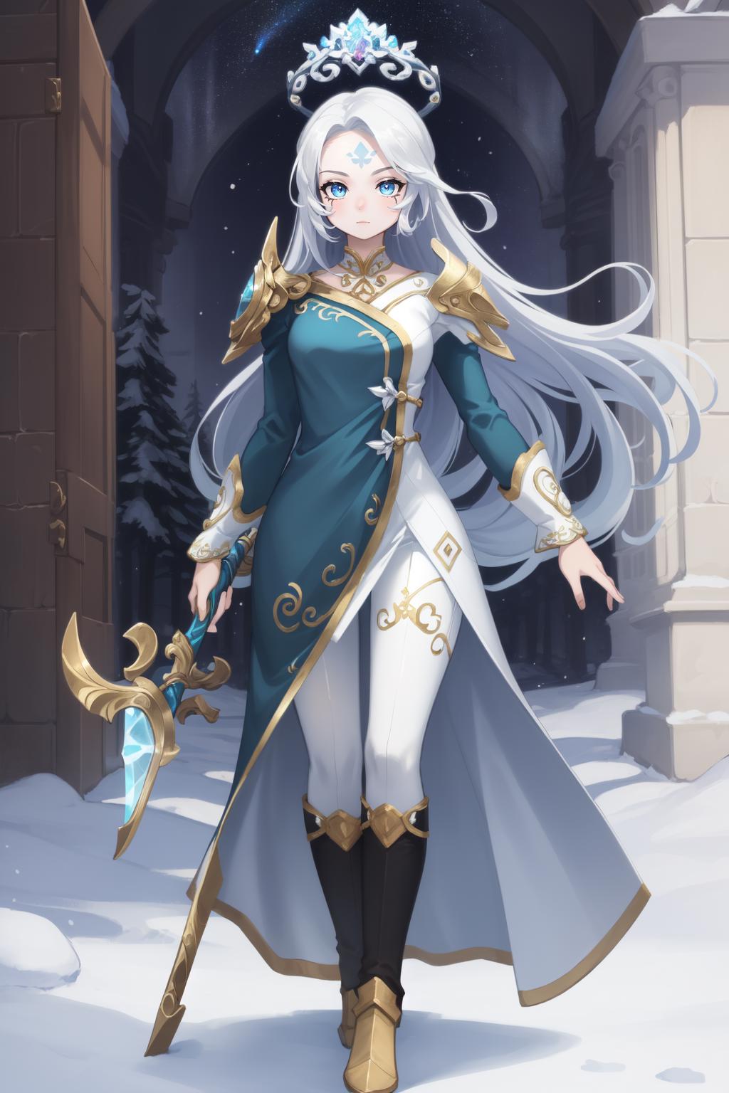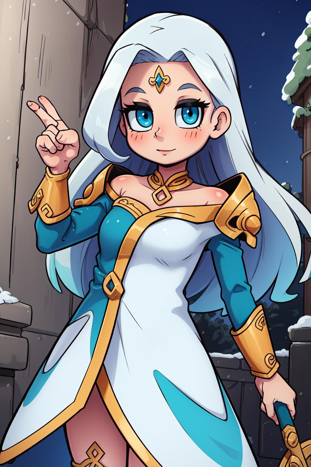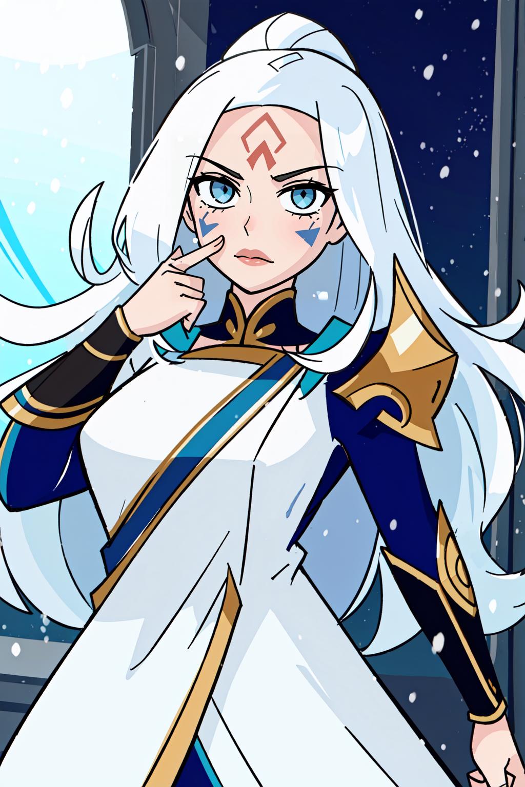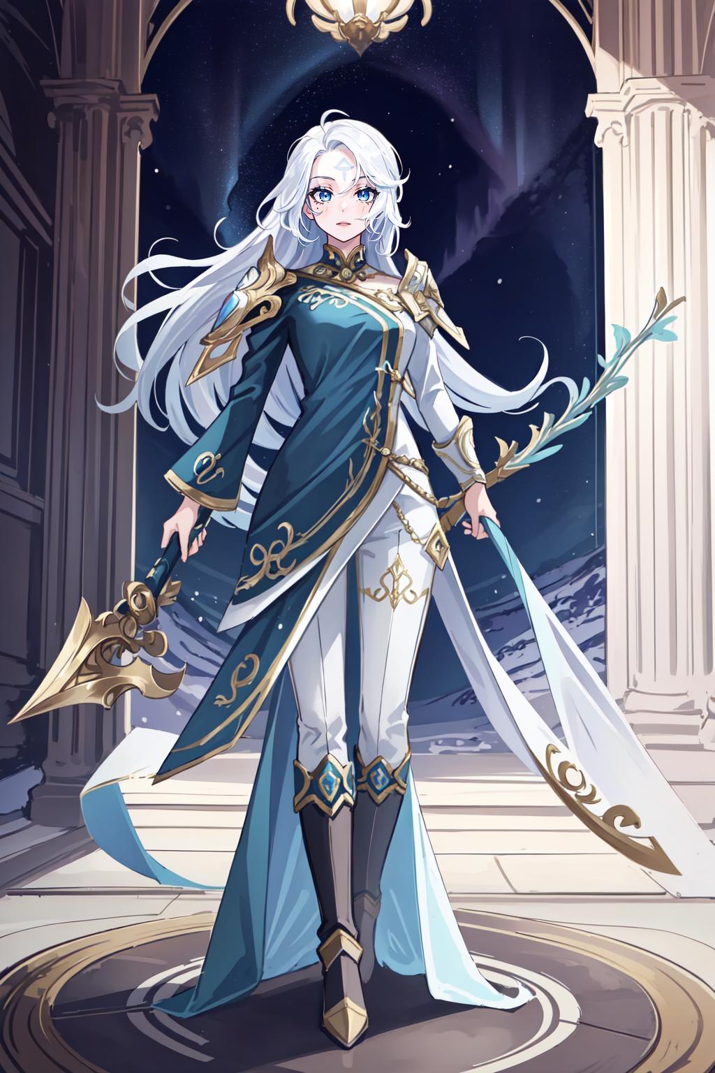 optional tags: dress, pauldrons, long hair, white hair, forehead mark