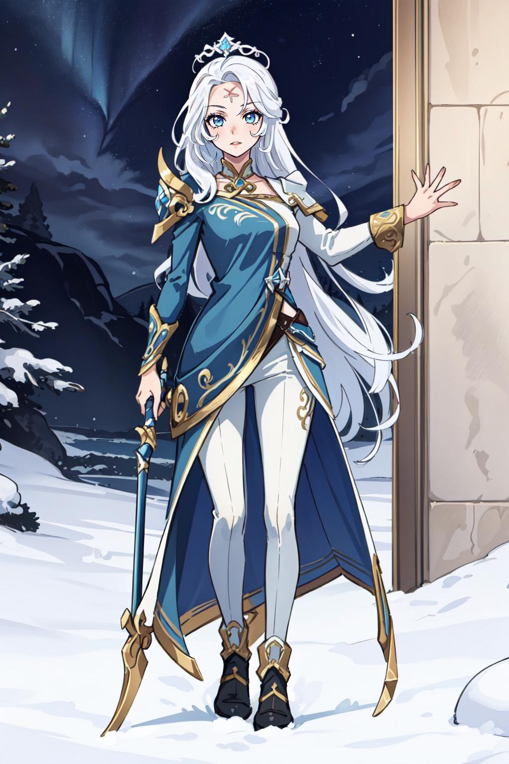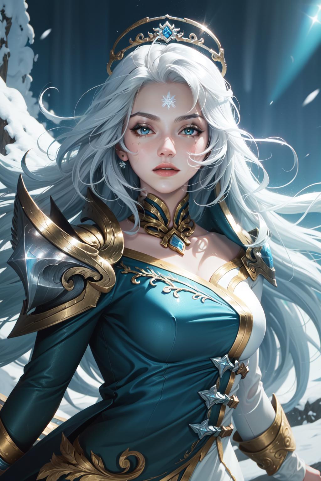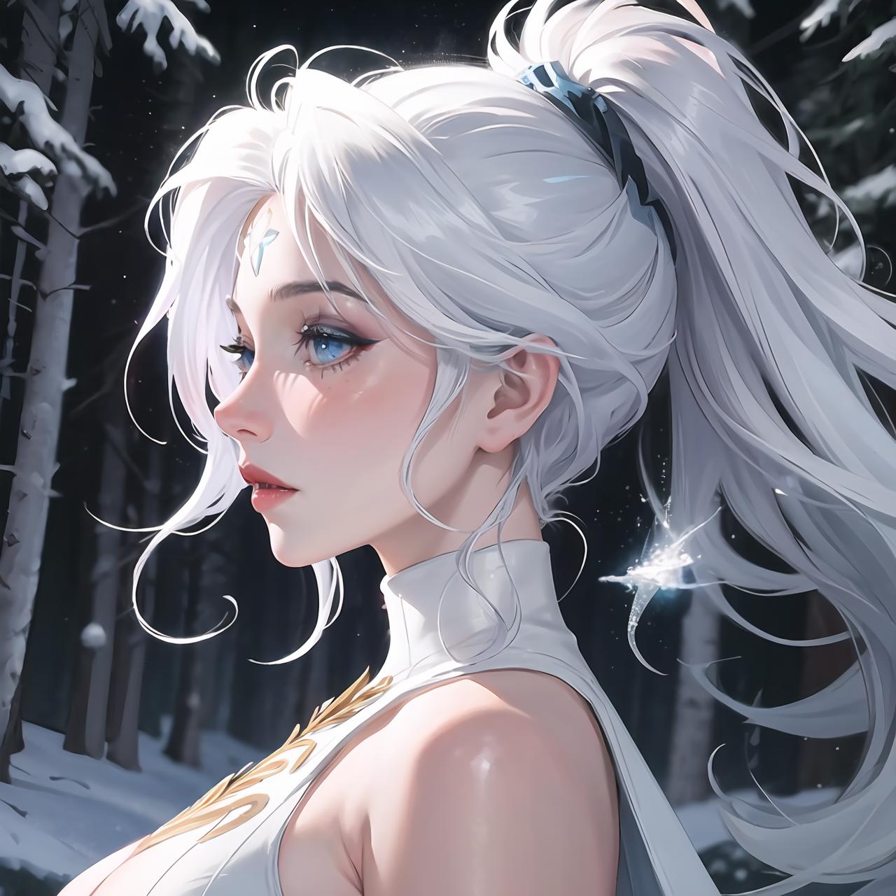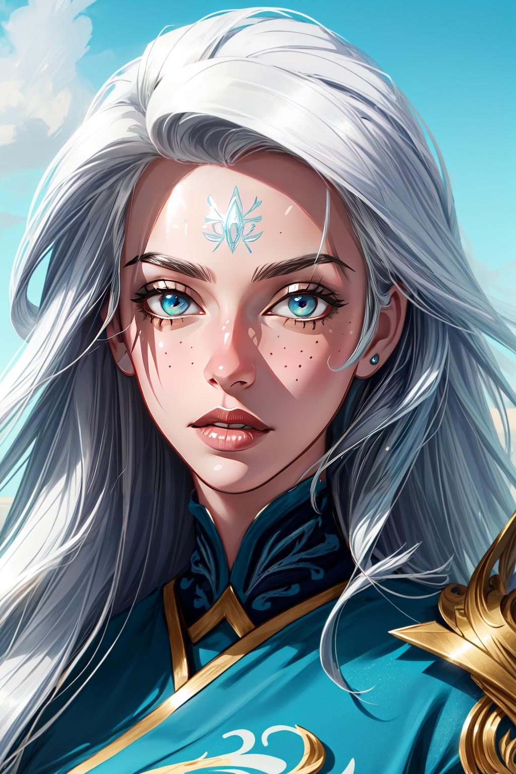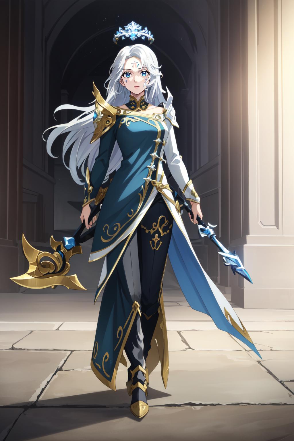 optional tags: dress, pauldrons, long hair, white hair, forehead mark
