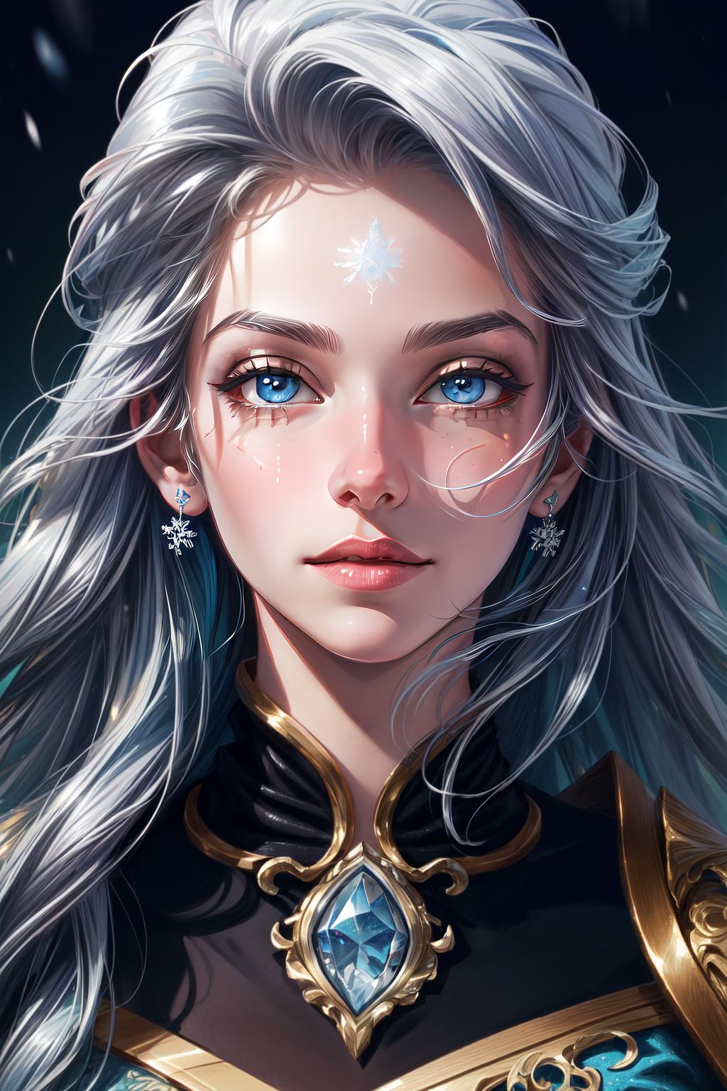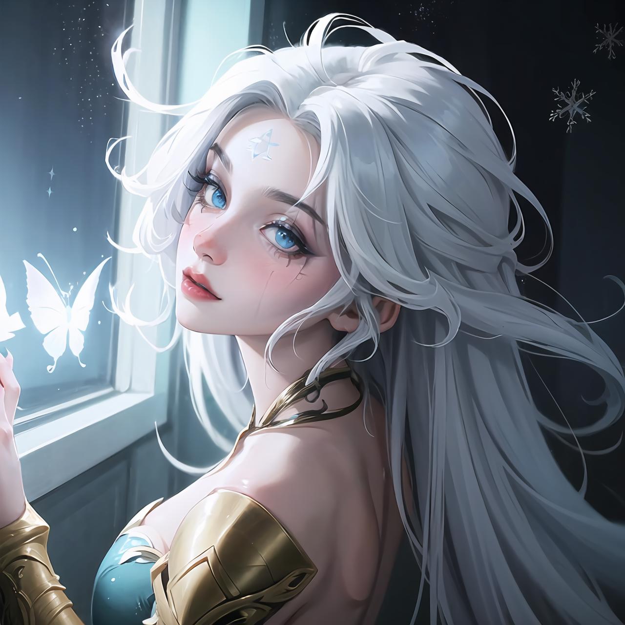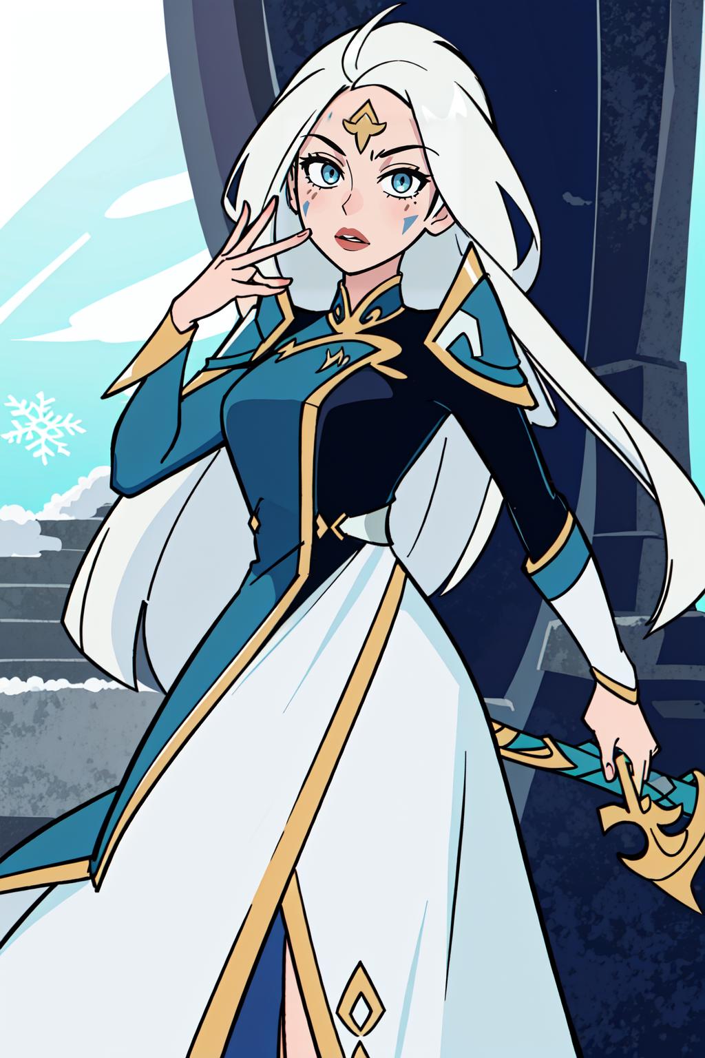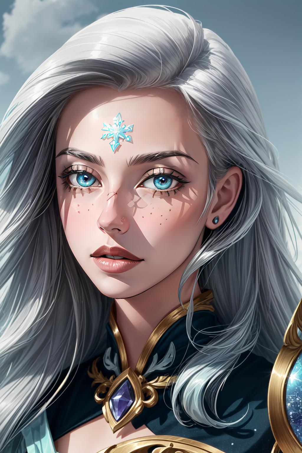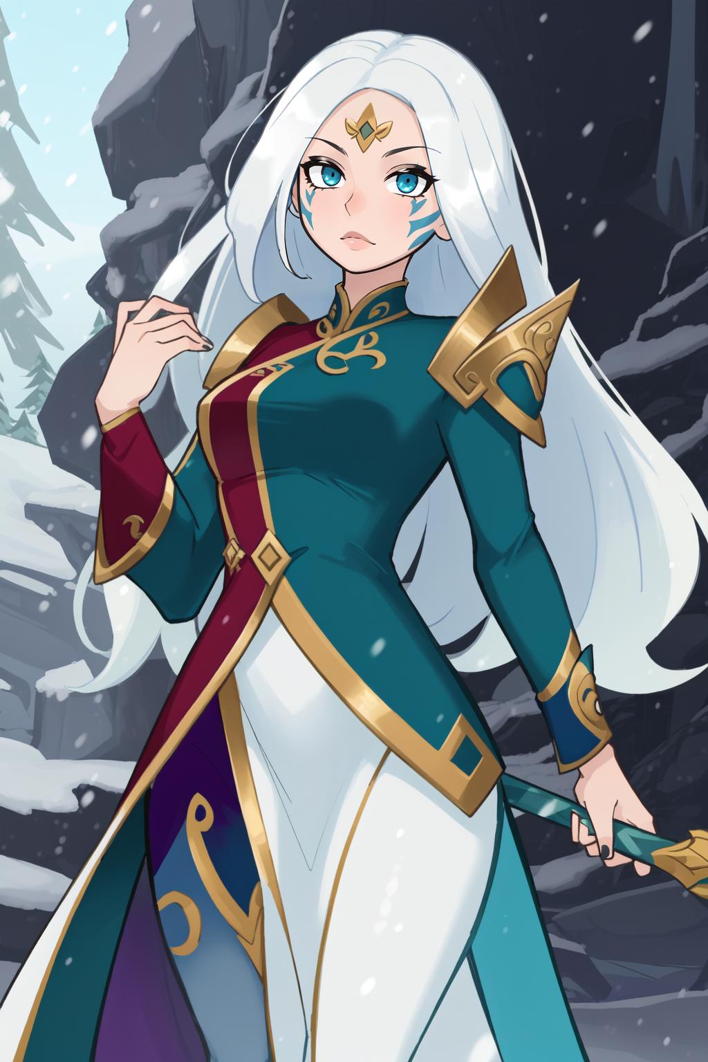 optional tags: dress, pauldrons, long hair, white hair, forehead mark