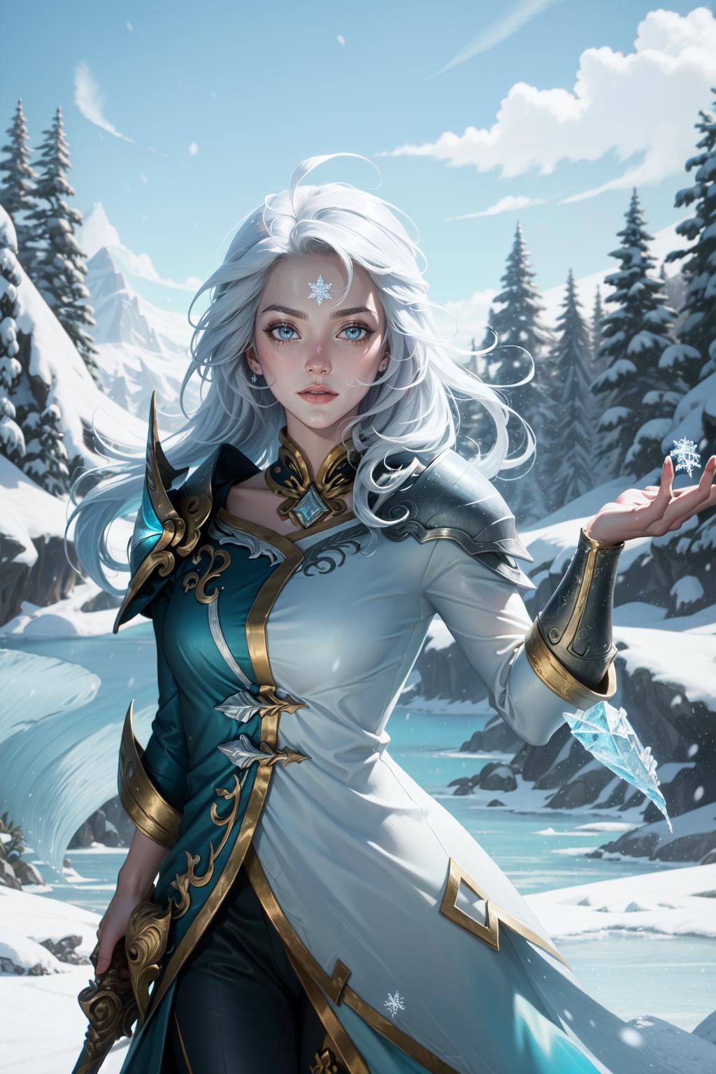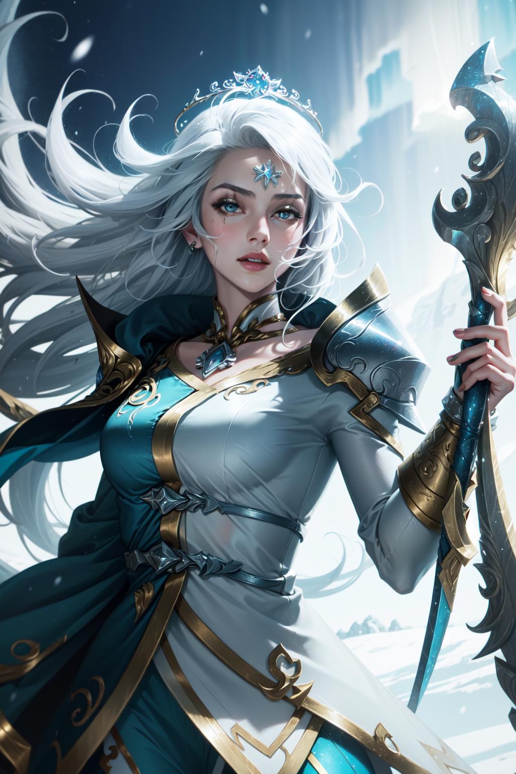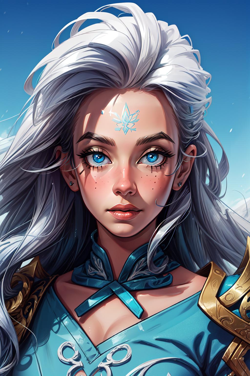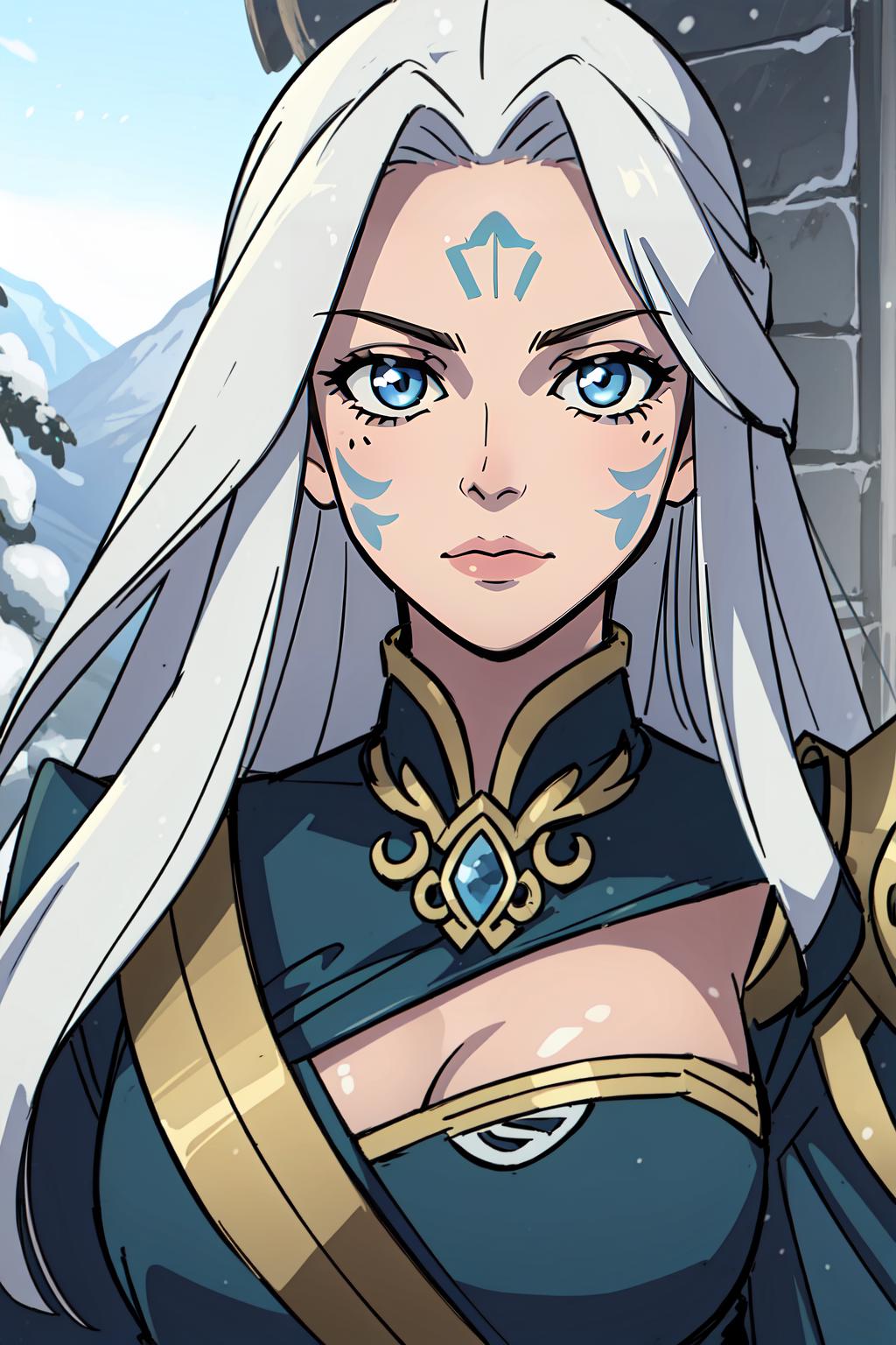 optional tags: dress, pauldrons, long hair, white hair, forehead mark