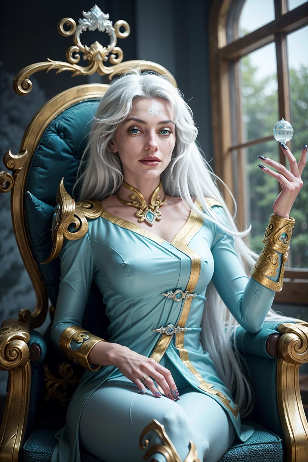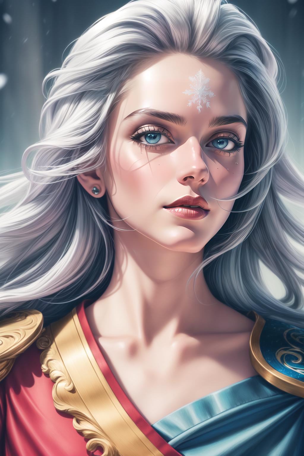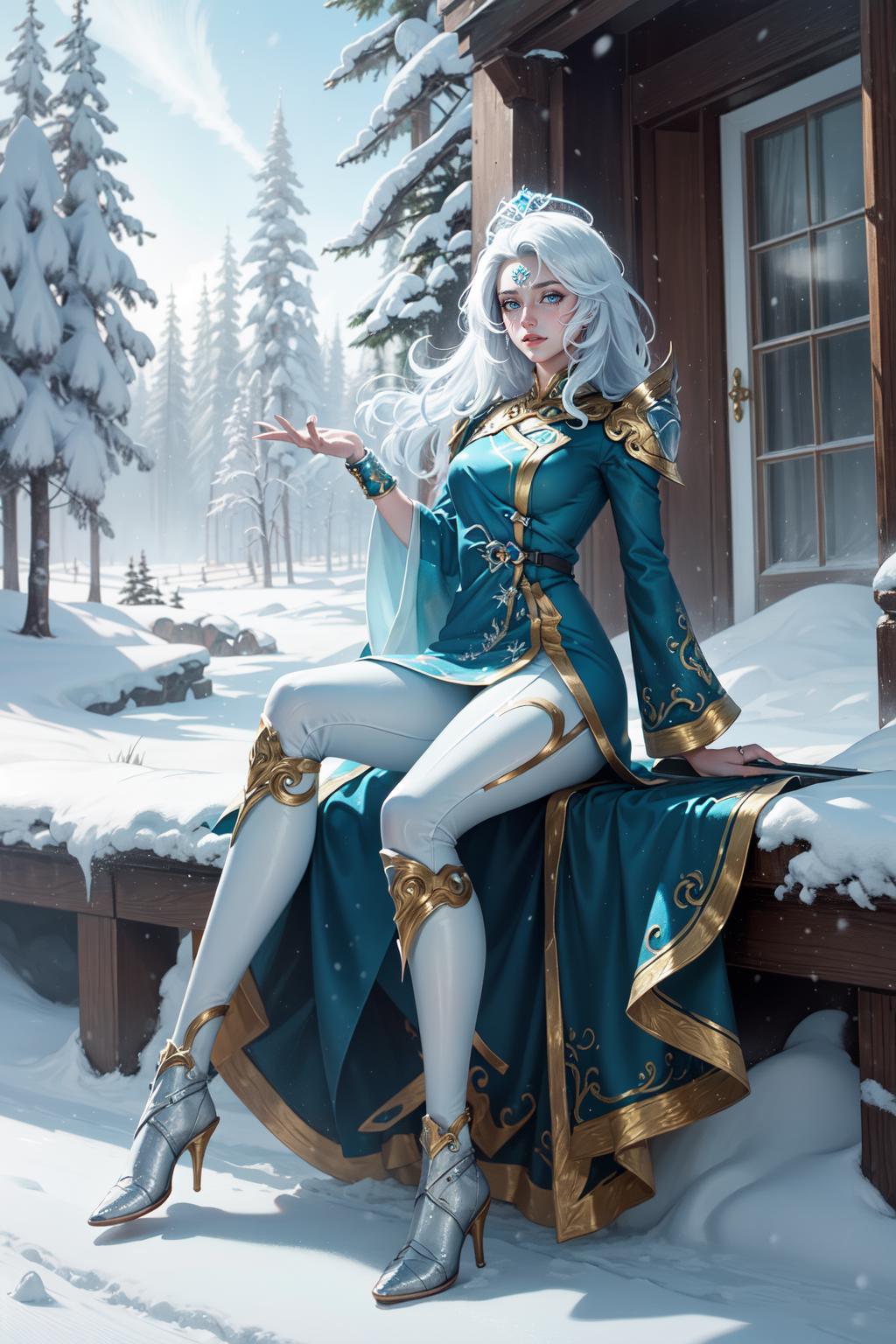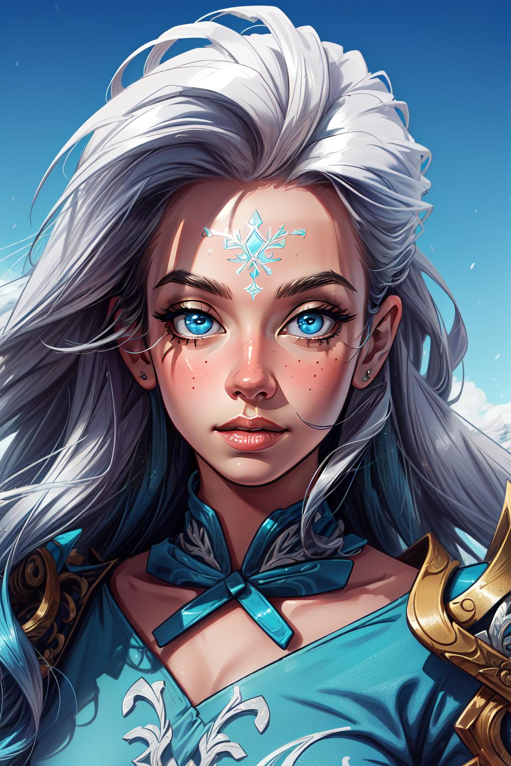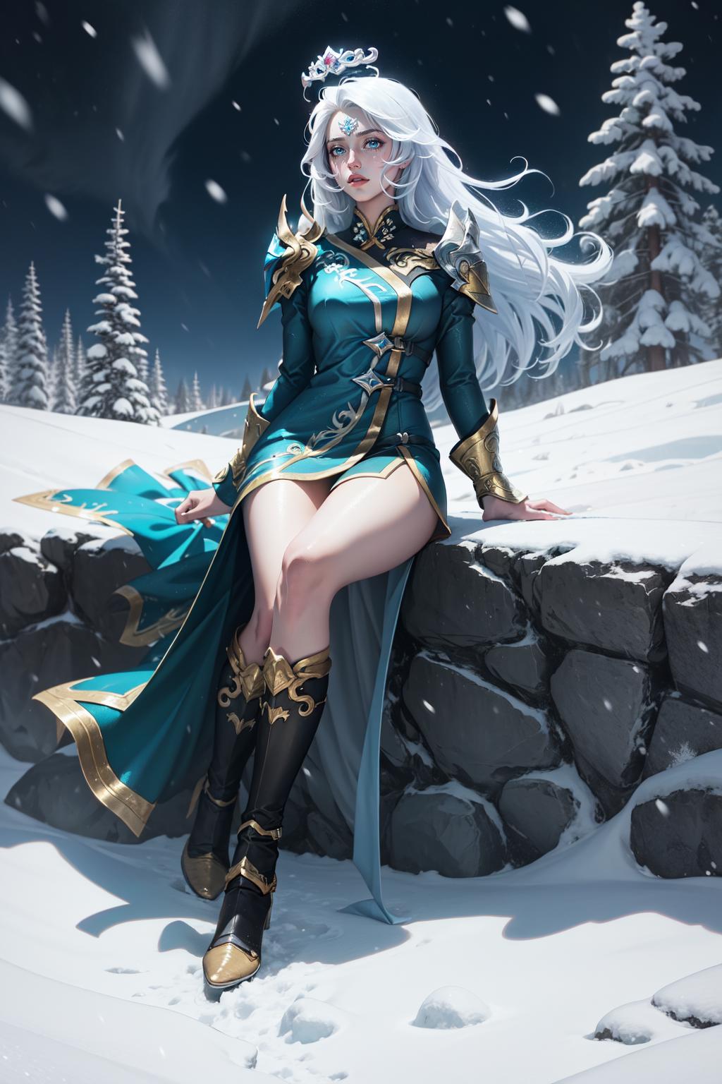 optional tags: dress, pauldrons, long hair, white hair, forehead mark