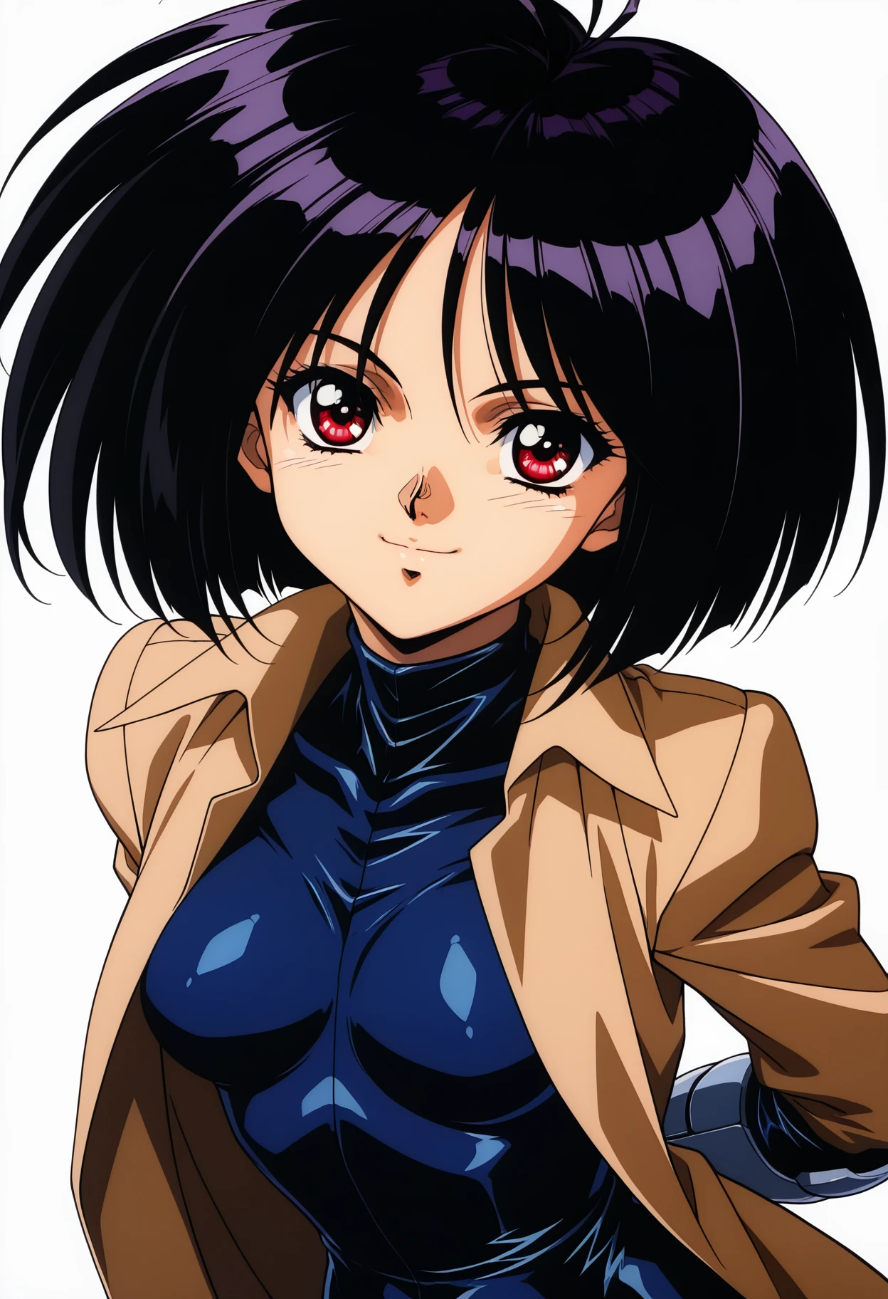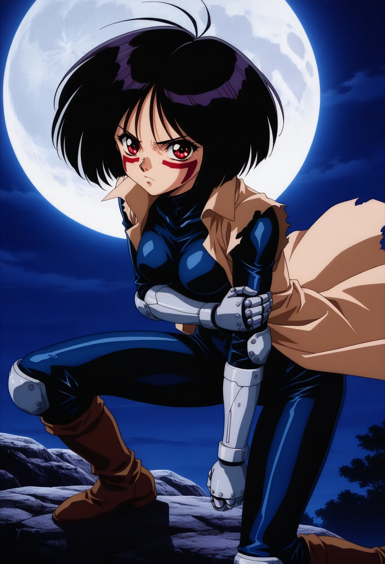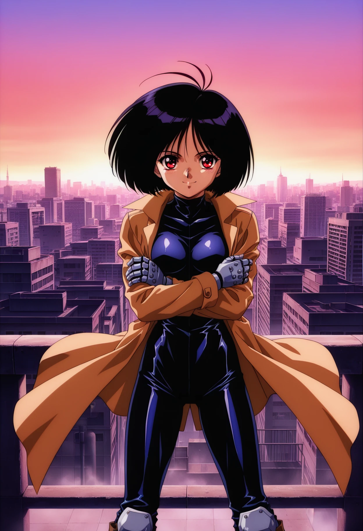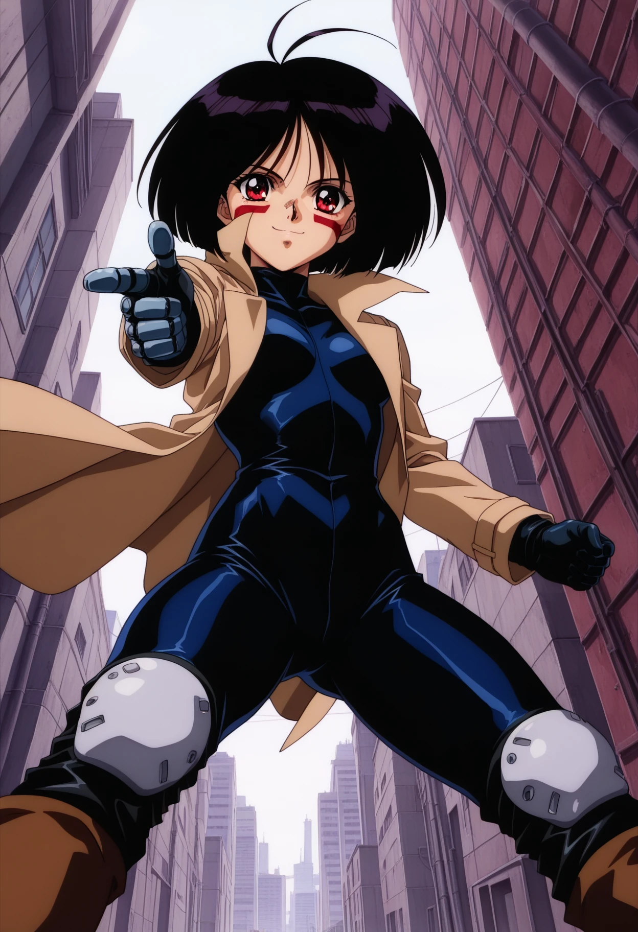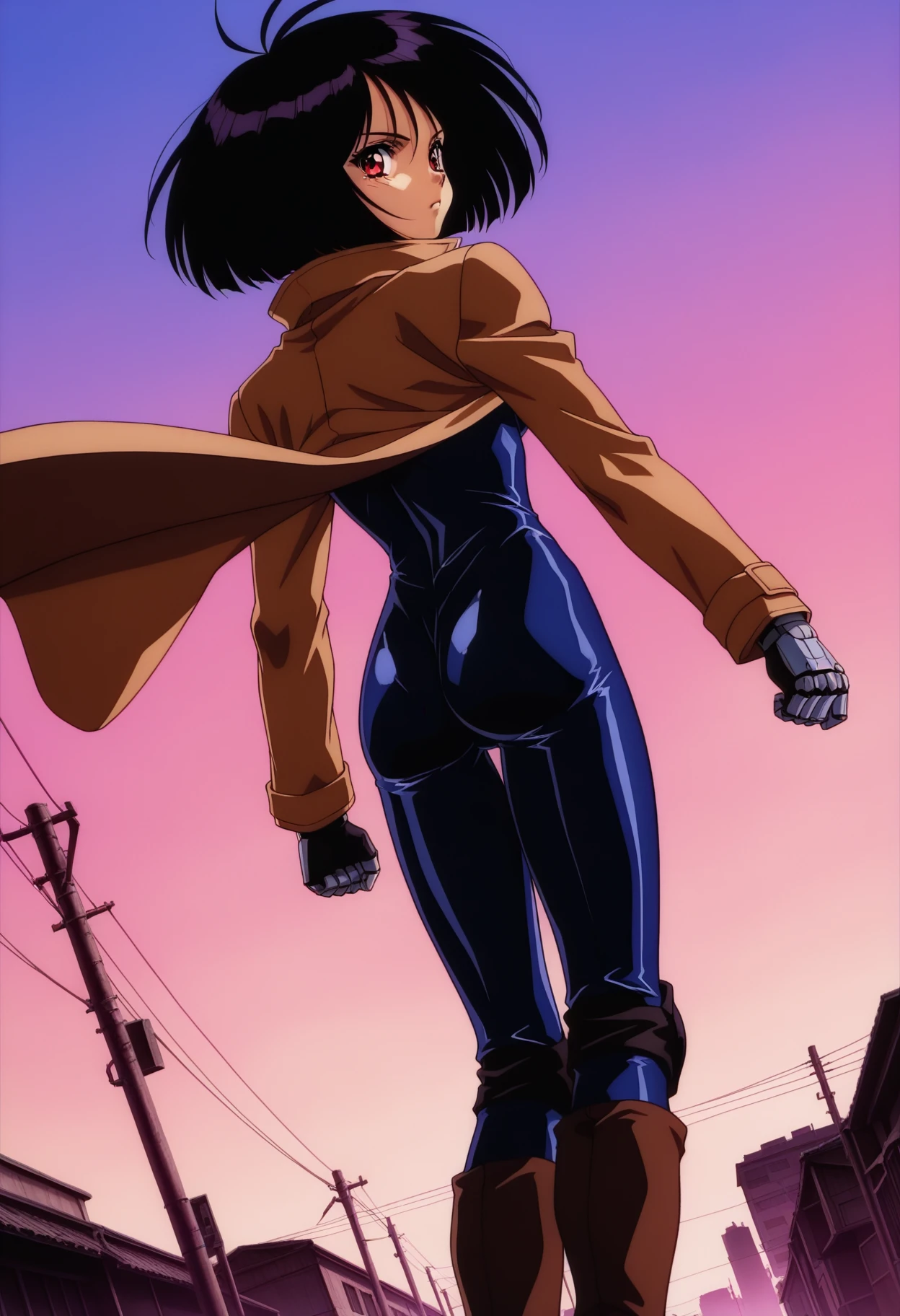 gally_wz, short hair, bob cut, black hair, red eyes, antenna hair, brown coat, bodysuit, mechanical hands, brown boots, knee pads, 1990s \(style\), retro artstyle