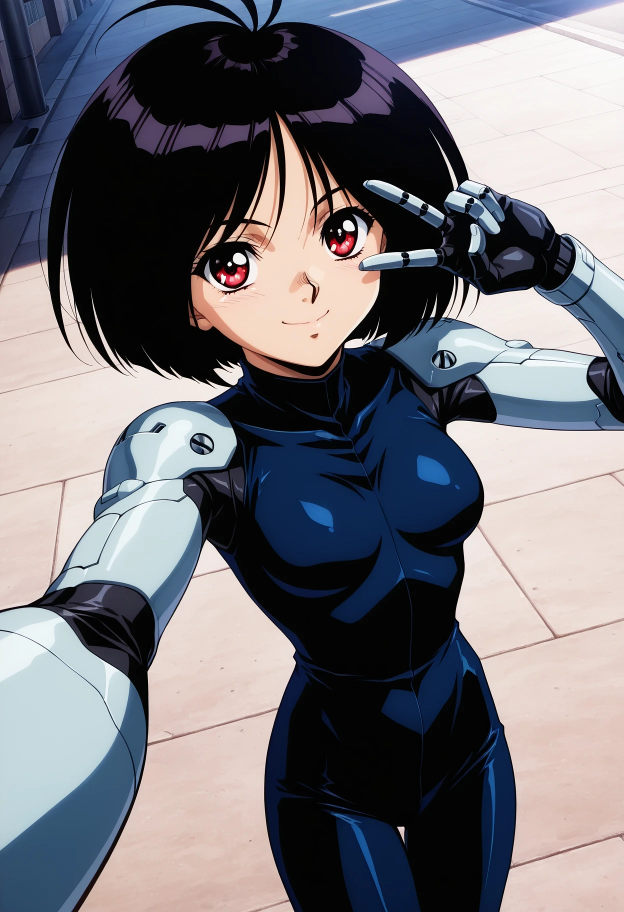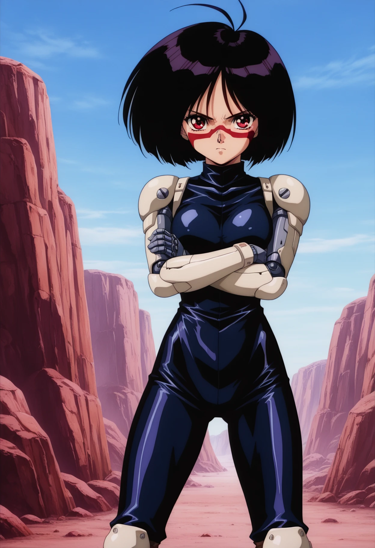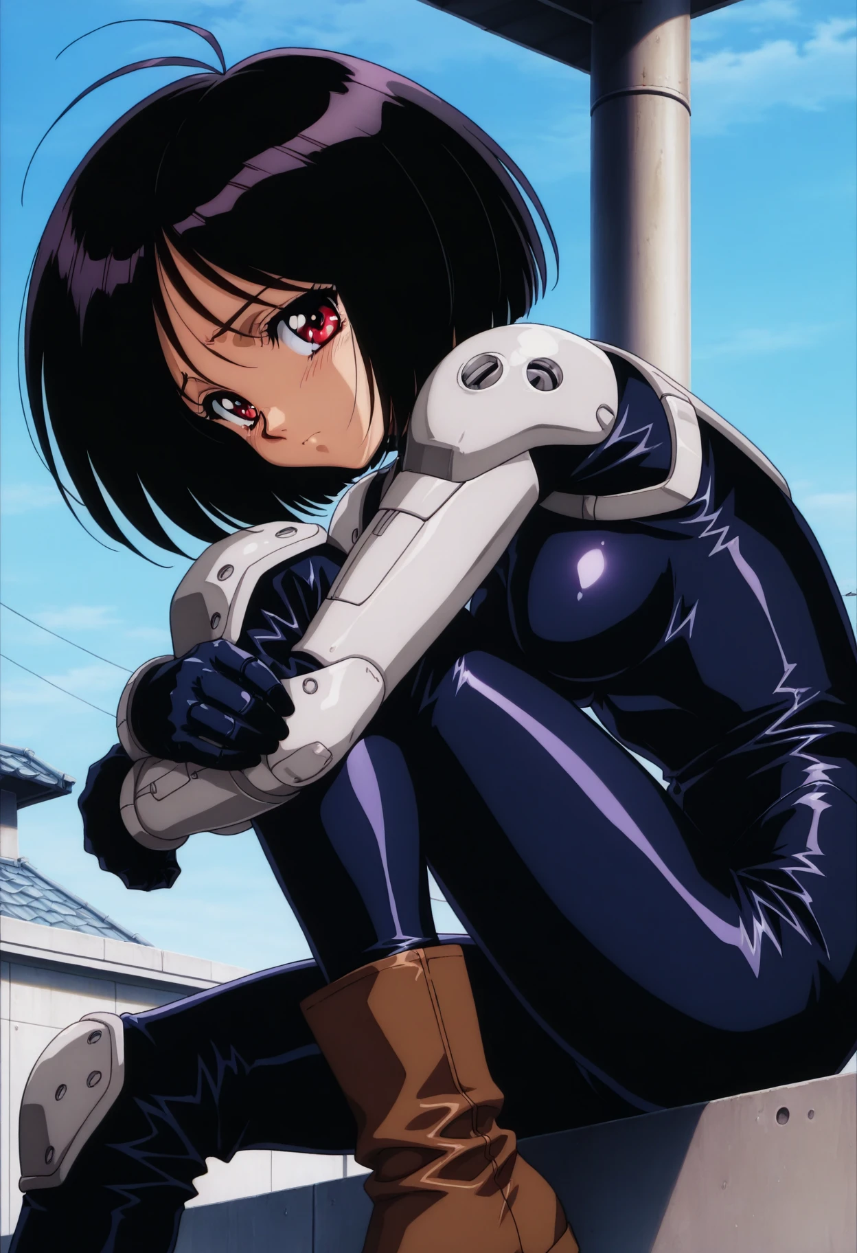 gally_wz, short hair, bob cut, black hair, red eyes, antenna hair, mechanical arms, mechanical hands, bodysuit, brown boots, knee pads, cyborg, 1990s \(style\), retro artstyle
