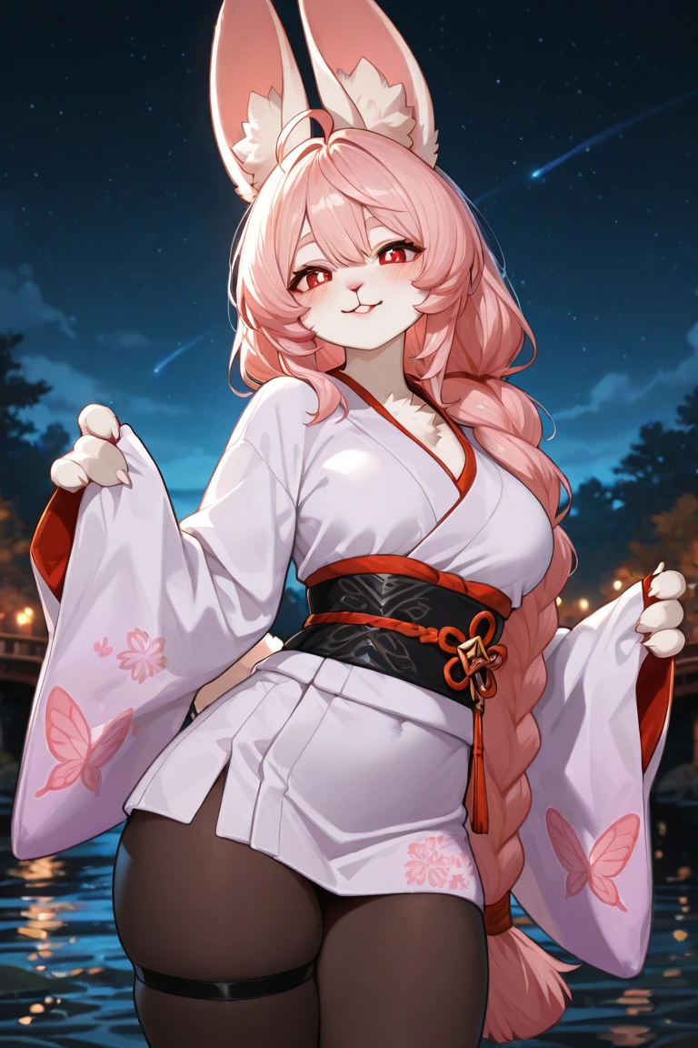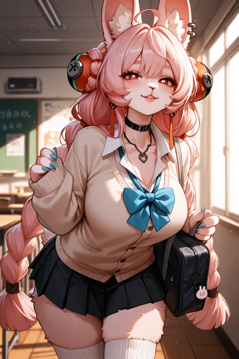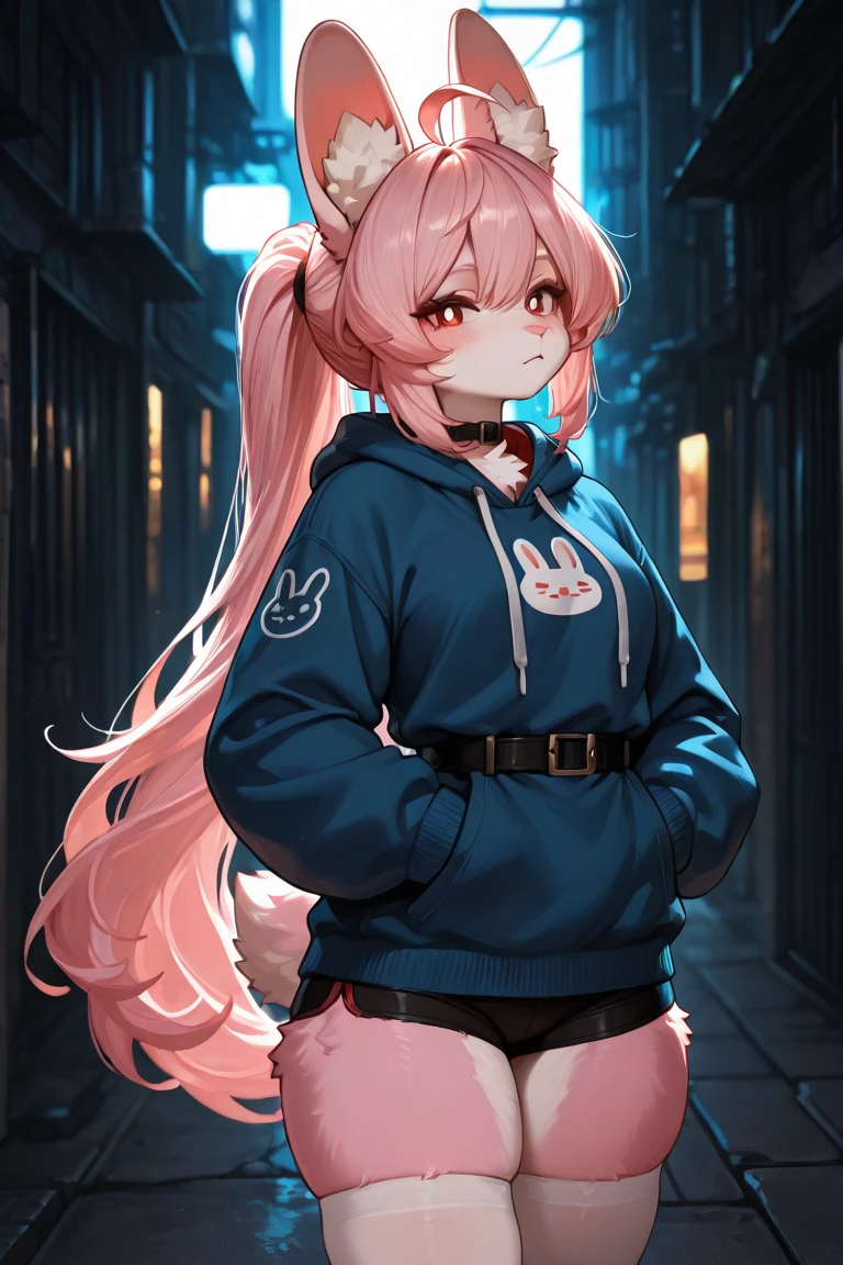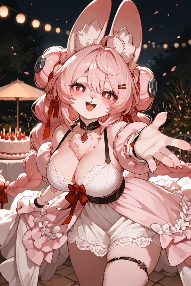Zhao_Default,red eyes, very long hair, pink hair, twin braids, ahoge,rabbit girl, pink fur, furry, furry female, rabbit ears, animal ear fluff, rabbit tail,aqua shirt, long sleeves, black dress,thigh strap, bell, anklet, jewelry, hair ornament,If you need help with paws:
