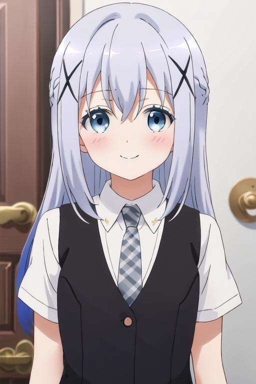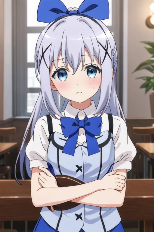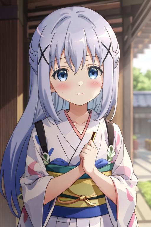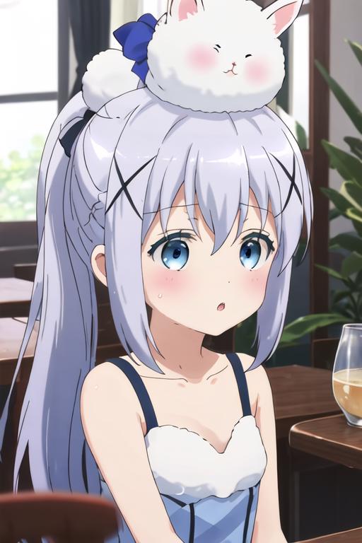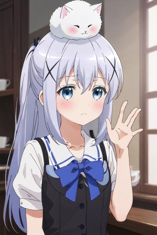 The trigger word is kafuu_chino_istheorderarabbit, and the recommended tags are best quality, masterpiece, highres, solo, {kafuu_chino_istheorderarabbit:1.15}, blue_hair, long_hair, blue_eyes, x_hair_ornament, hair_ornament, blush, bangs, closed_mouth, hair_between_eyes.