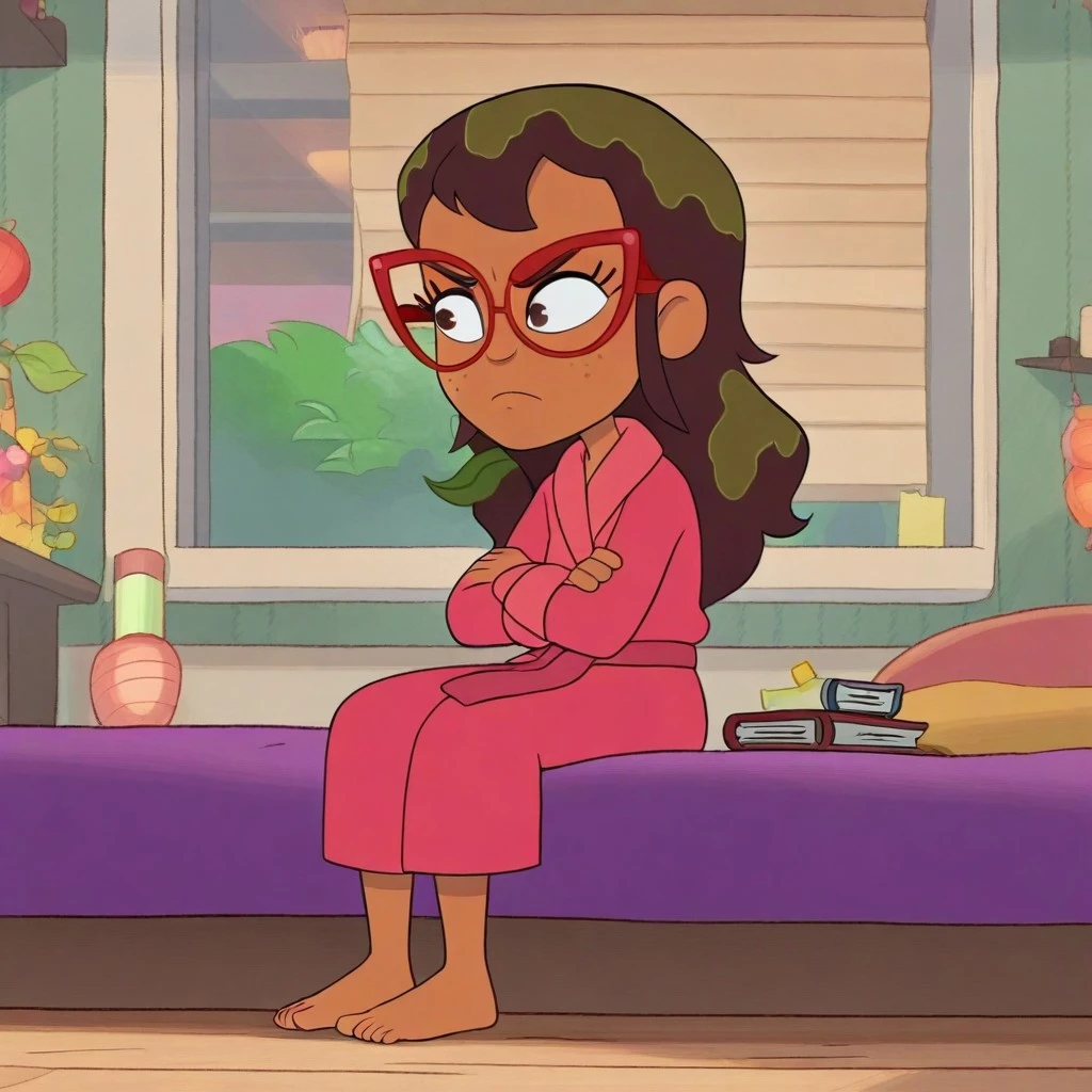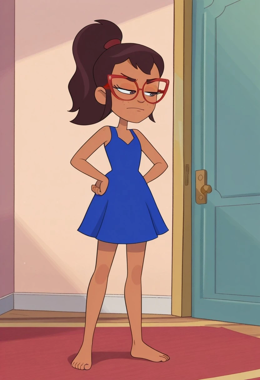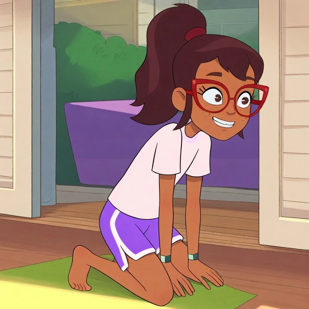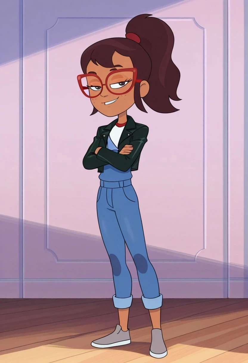 Hailey banks, 1girl, solo, tan skin, freckles, brown eyes, brown hair, ponytail, red glasses,