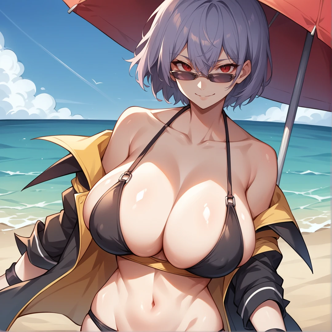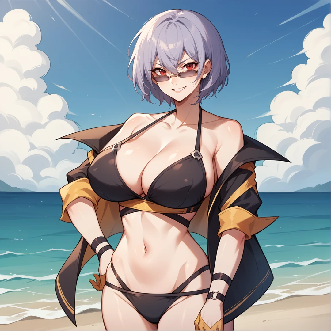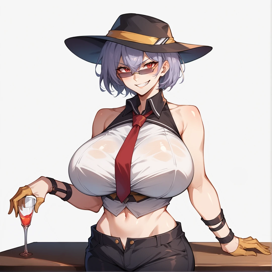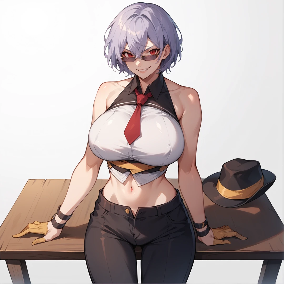 Trigger word is "gfthompson," and use "red eyes,purple hair,short hair,hair between eyes," for her face, and "fedora,sunglasses,tinted eyewear,white shirt,sleeveless shirt,crop top,red necktie,jacket,black jacket,black pants,yellow gloves,navel,midriff,bare shoulders,headphones around neck,wristband,yellow inside jacket," to her clothes