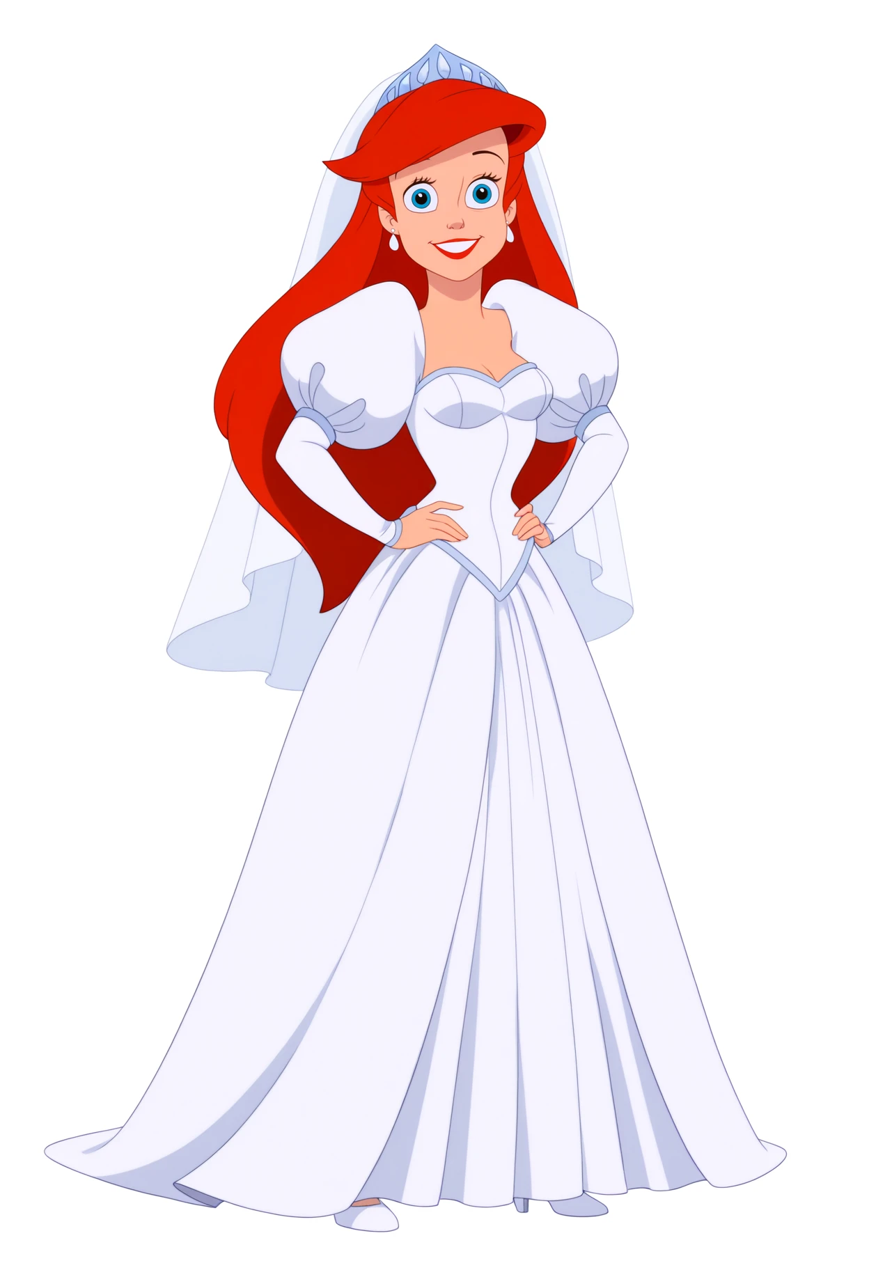 Wedding dress prompts : tiara, earrings, white dress, puffy sleeves, wedding dress, bridal veil, long sleeves, juliet sleeves, white high heels