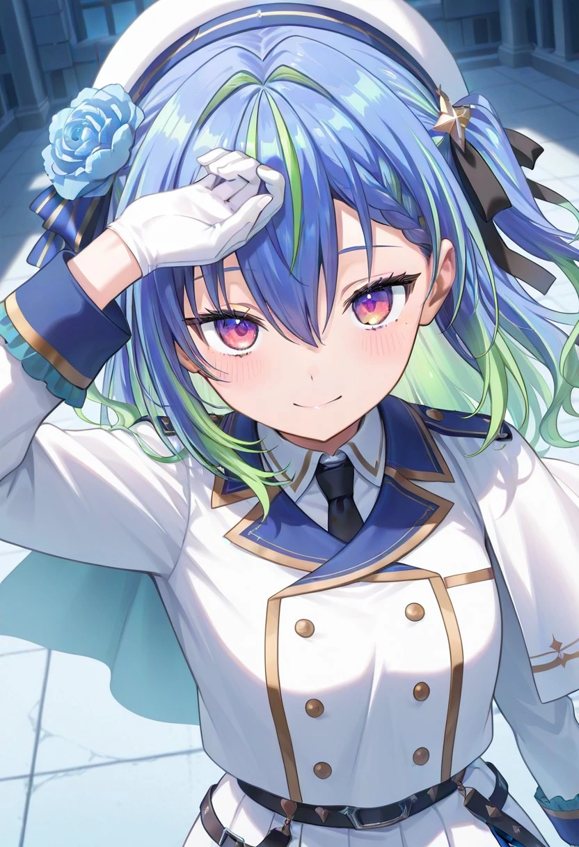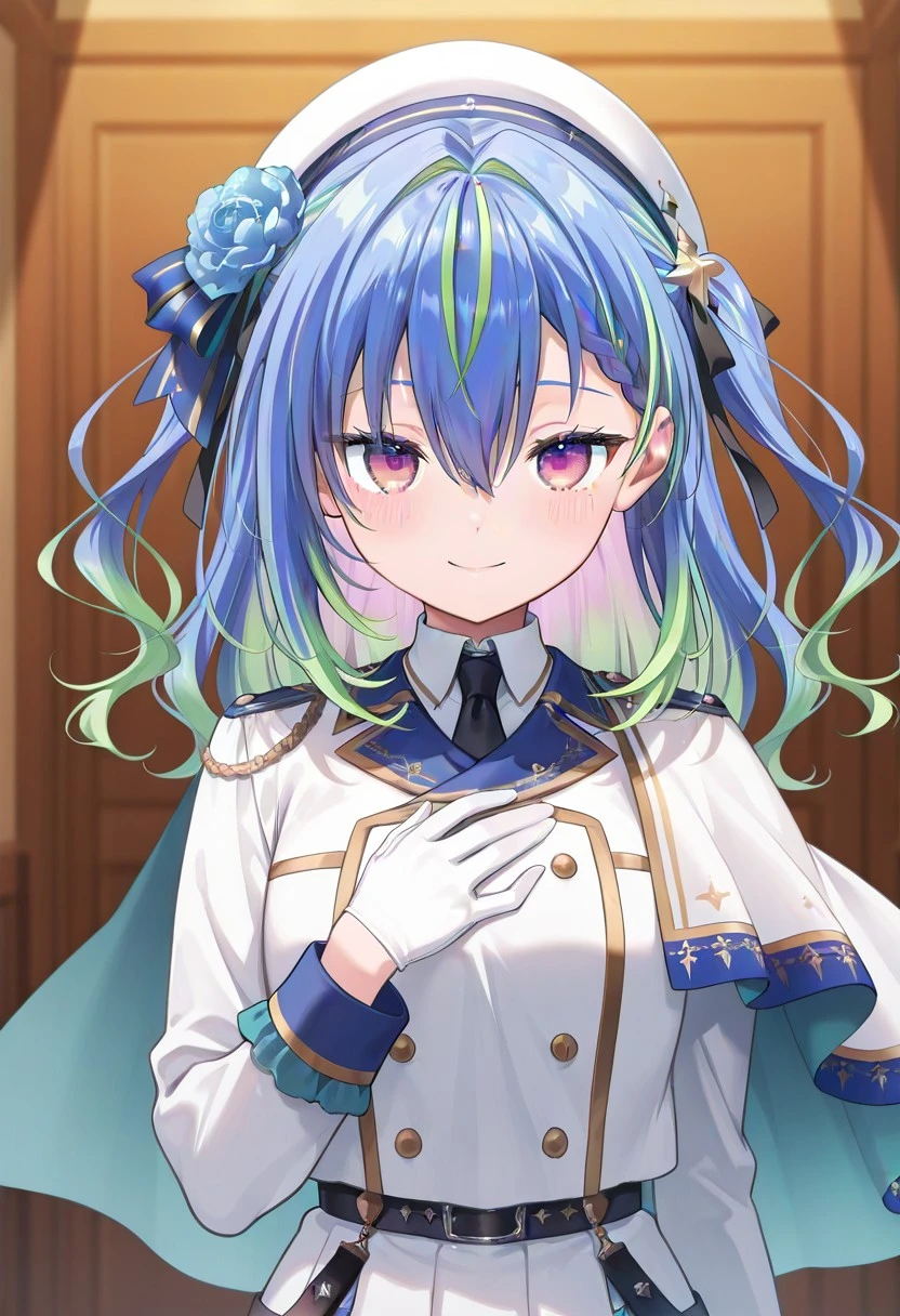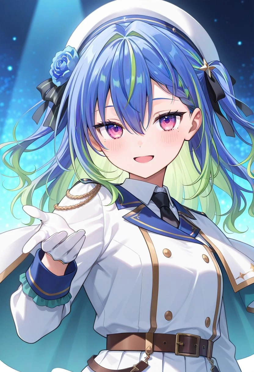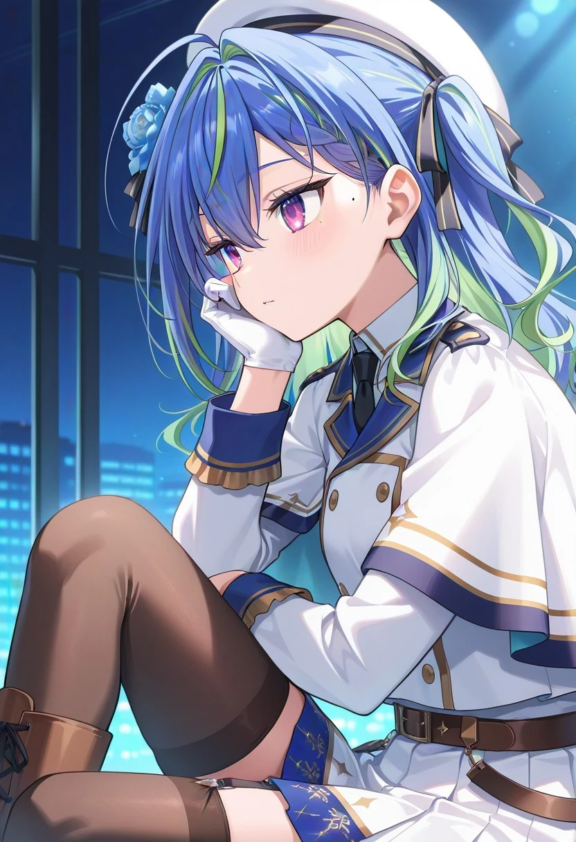 suzumi nemo, virtual youtuber, long hair, blue hair, green hair, multicolored hair, purple eyes, hair between eyes, mole under eye, bangs, hair flower, white beret, white dress, black necktie, long sleeves, capelet, single white glove, belt, white skirt, single thighhigh, brown boots, garter straps,