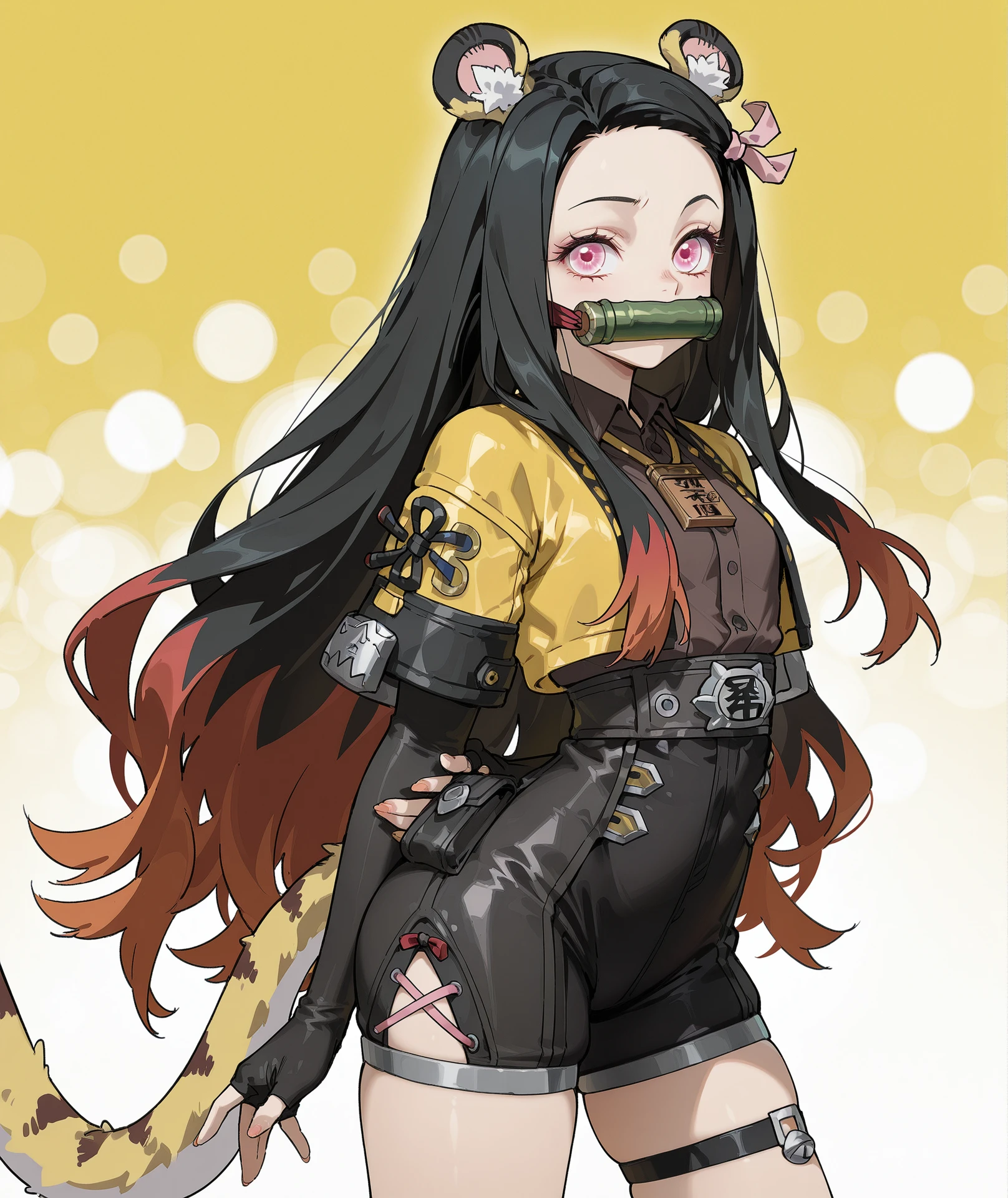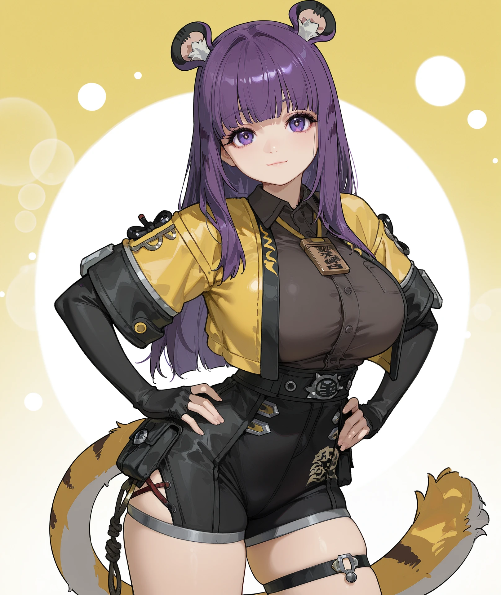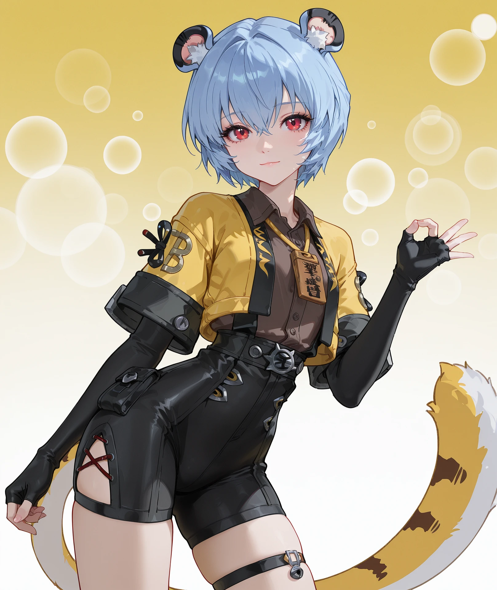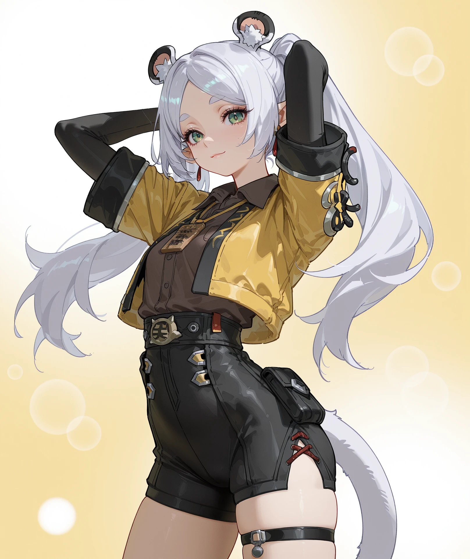 shirt, long sleeves, gloves, jacket, short sleeves, open clothes, black gloves, collared shirt, elbow gloves, fingerless gloves, open jacket, black shirt, skindentation, cropped jacket, yellow shirt, yellow jacket, brown shirt, layered sleeves, short over long sleeves, id card,