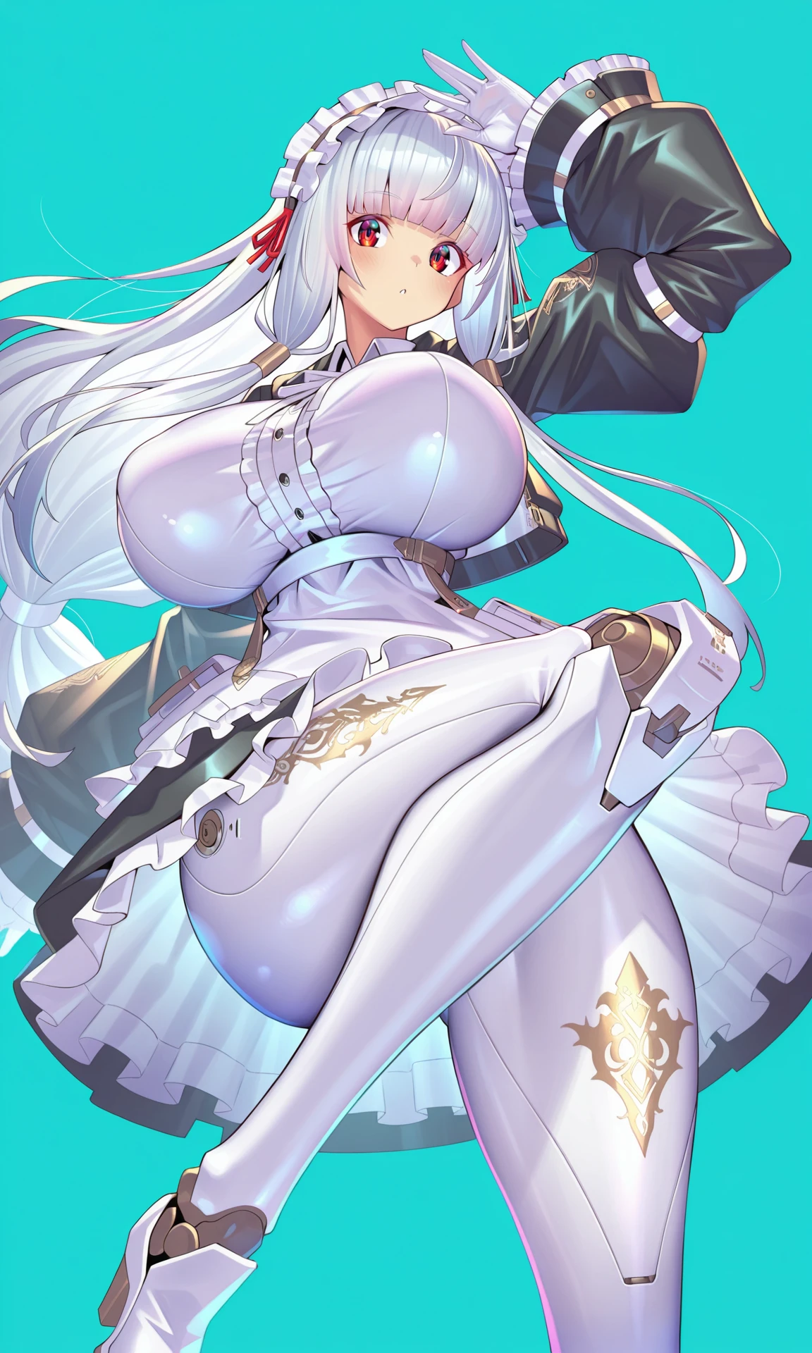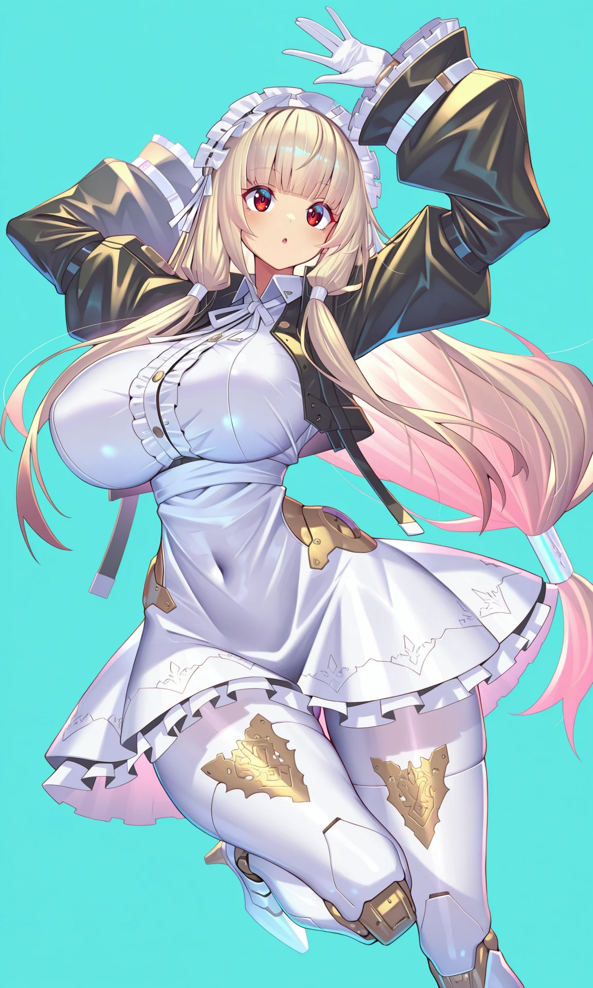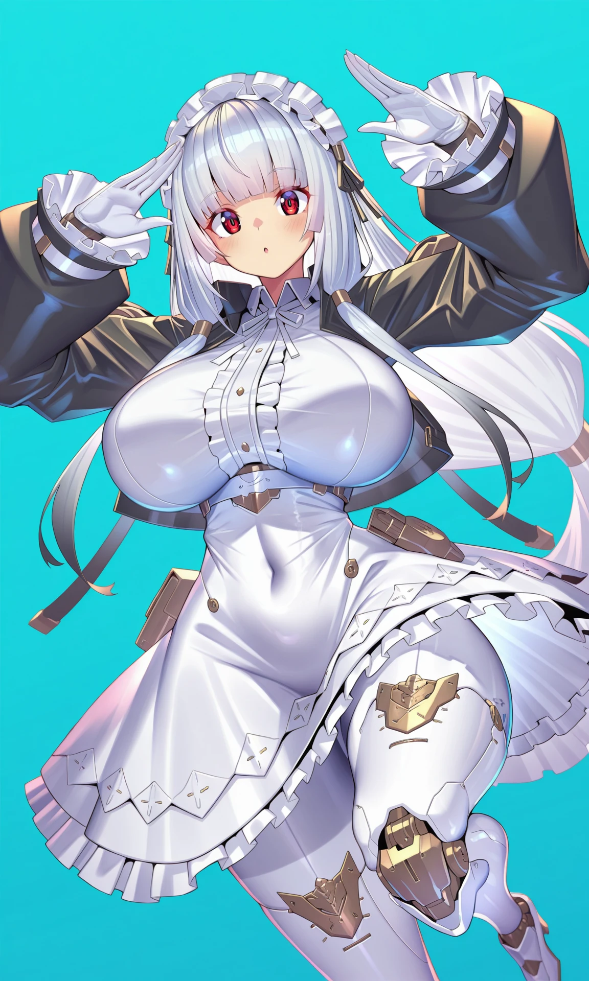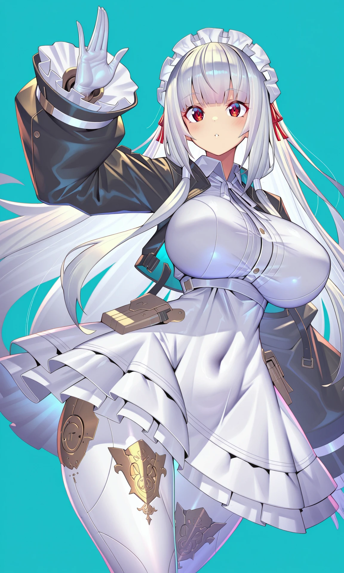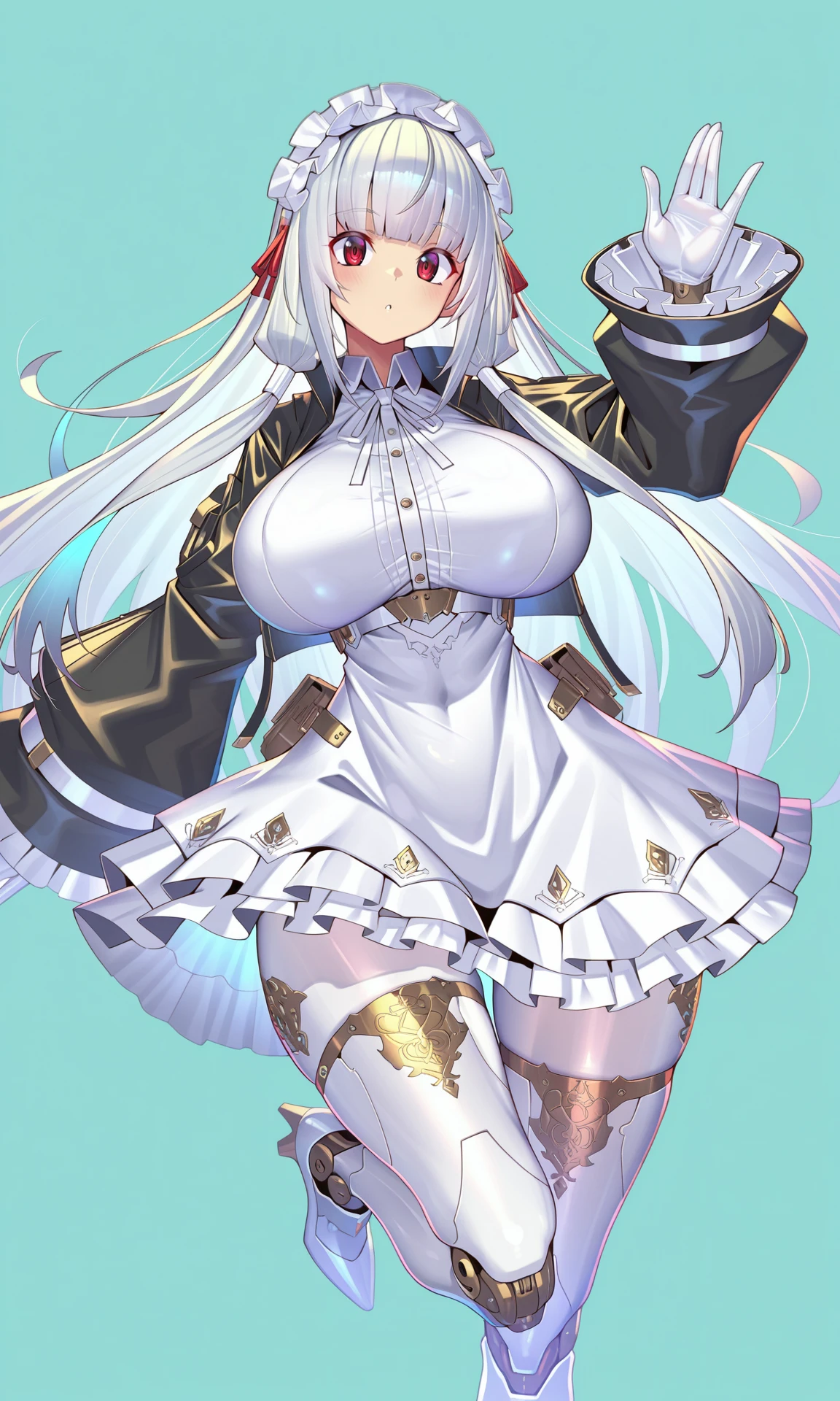 white dress,short_dress, collared_dress,white_petticoat, neck_ribbon, white_ribbon,jacket, black jacket,long_sleeves, open_jacket, cropped_jacket, white_gloves, frilled_sleeves,puffy_sleeves, pocket,