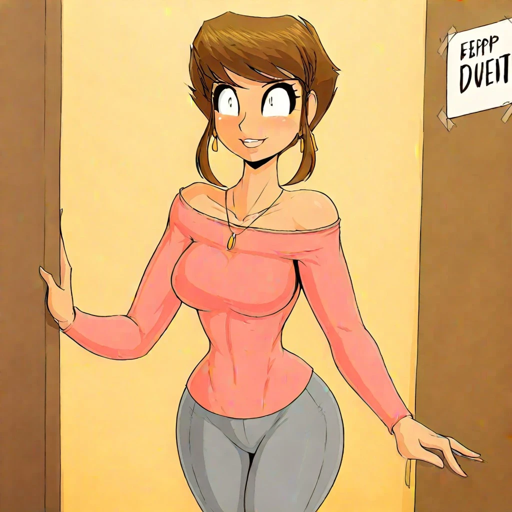 short hair,long sidelocks,brown hair,earrings,medium breasts,necklace,pink off the shoulders shirt,grey pants
