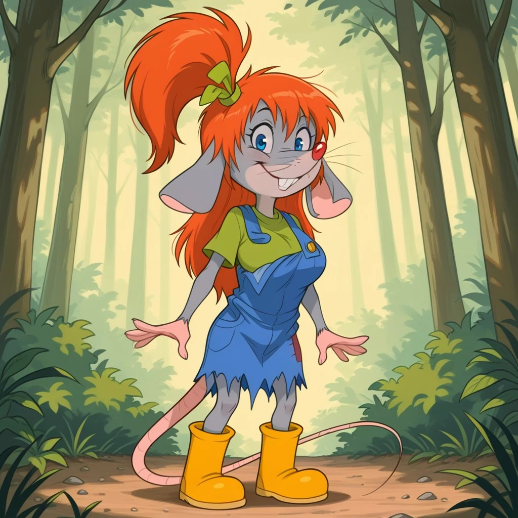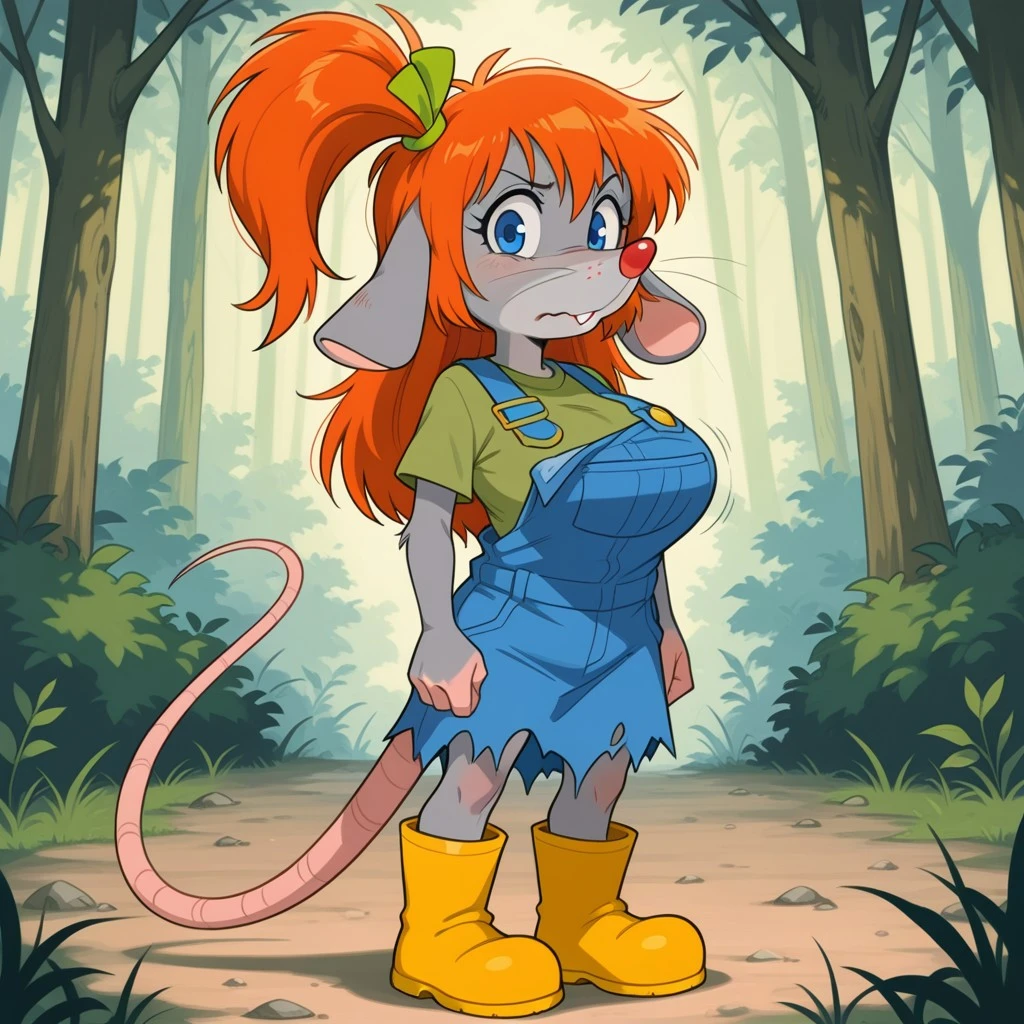 rodent, rat, rat girl, gray fur, orange hair, long hair, side ponytail, blue eyes, red nose, whiskers, rat ears, ears down, rat tail, green ribbon hair tie,