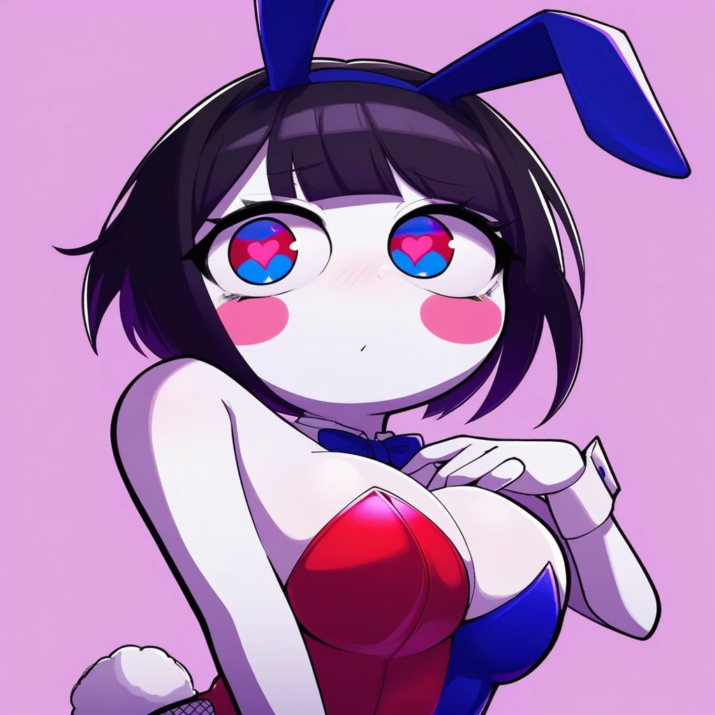 Appearance: two-tone eyes, mismatched eyelashes, red eyes, blue eyes, blush stickers, white skin, short hair, black hair