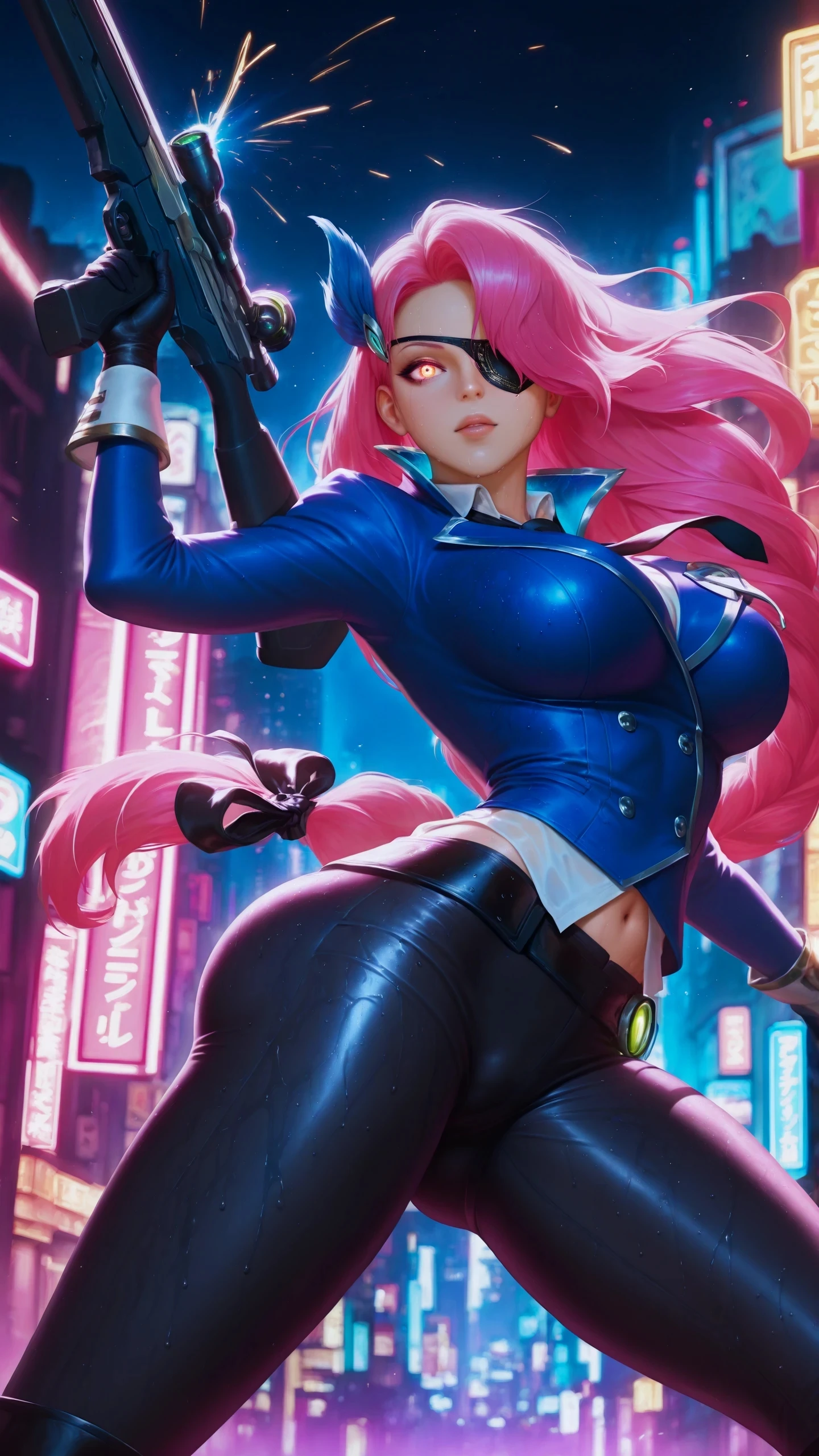 Lesley, Long pink hair, hair over one eye, eye patch, blue hairpin,Long single braid