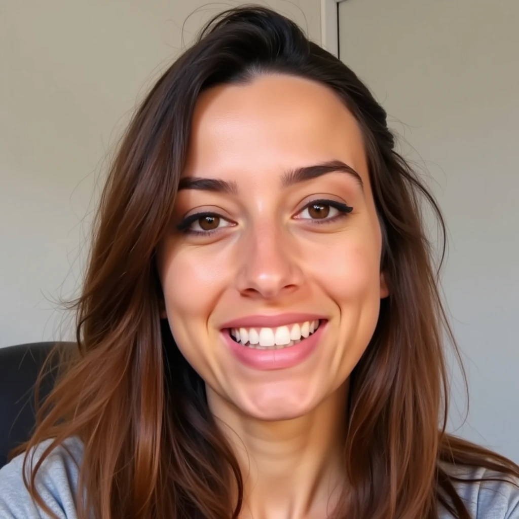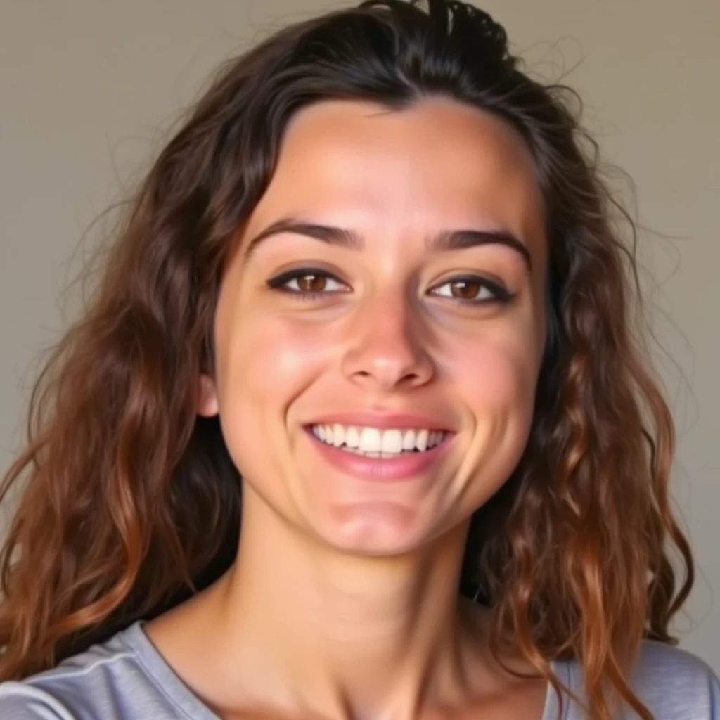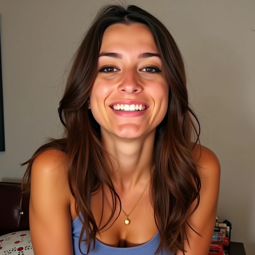 beautiful, smiling, young woman, 24 years old, brown hair, brown eyes, big breasts,