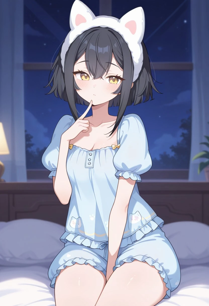 1girl, kohakuStellaS, black hair, short hair, yellow eyes, cat ear hairband, blue pajamas, puffy short sleeves, frilled pajamas, blue shortsDescription