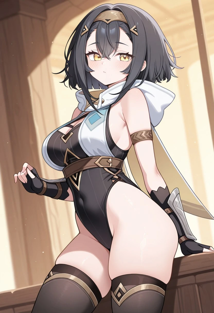 1girl, kohakuStellaS, black hair, short hair, yellow eyes, hair ornament, hairband, hood down, armlet, white dress, sideless dress, short dress, leotard, black leotard, fingerless gloves, black gloves, black thighhighs, thighhighs, thigh boots, zettai ryouiki Pajamas