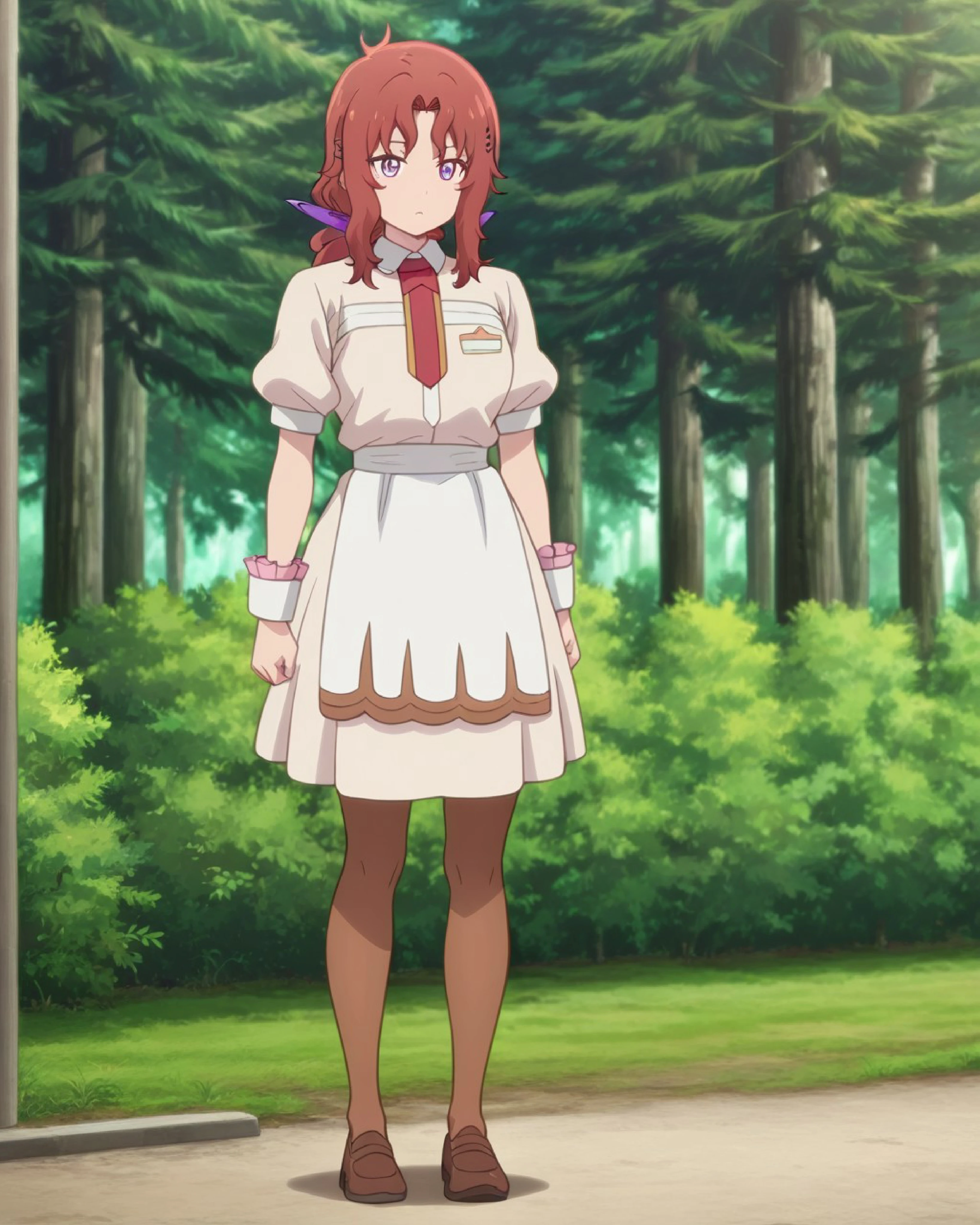 Selena, reddish brown hair, long hair, hair ornament, purple eyes, 1girl, solo